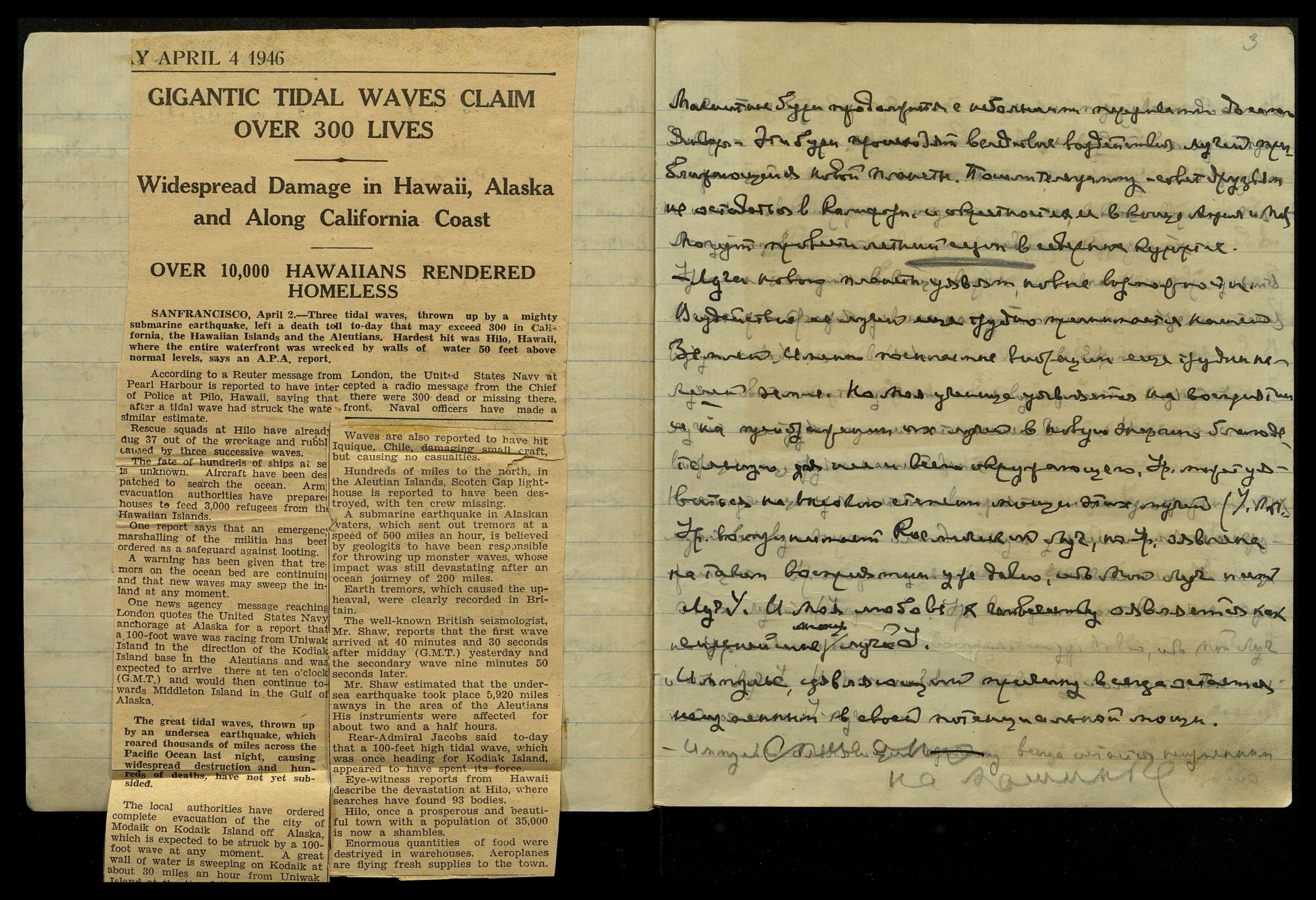 САН-ФРАНЦИСКО, 2 апреля. — Три волны цунами в Калифорнии, на Гавайских островах и Алеутских островах, вызванные мощным подводным землетрясением, собрали сегодня свою "пошлину" человеческими жизнями, число погибших может превысить 300 человек. Больше всего пострадал Хило, Гавайи, где вся набережная была разрушена стенами воды на 50 футов выше нормального уровня, говорится в отчете A.P.A.