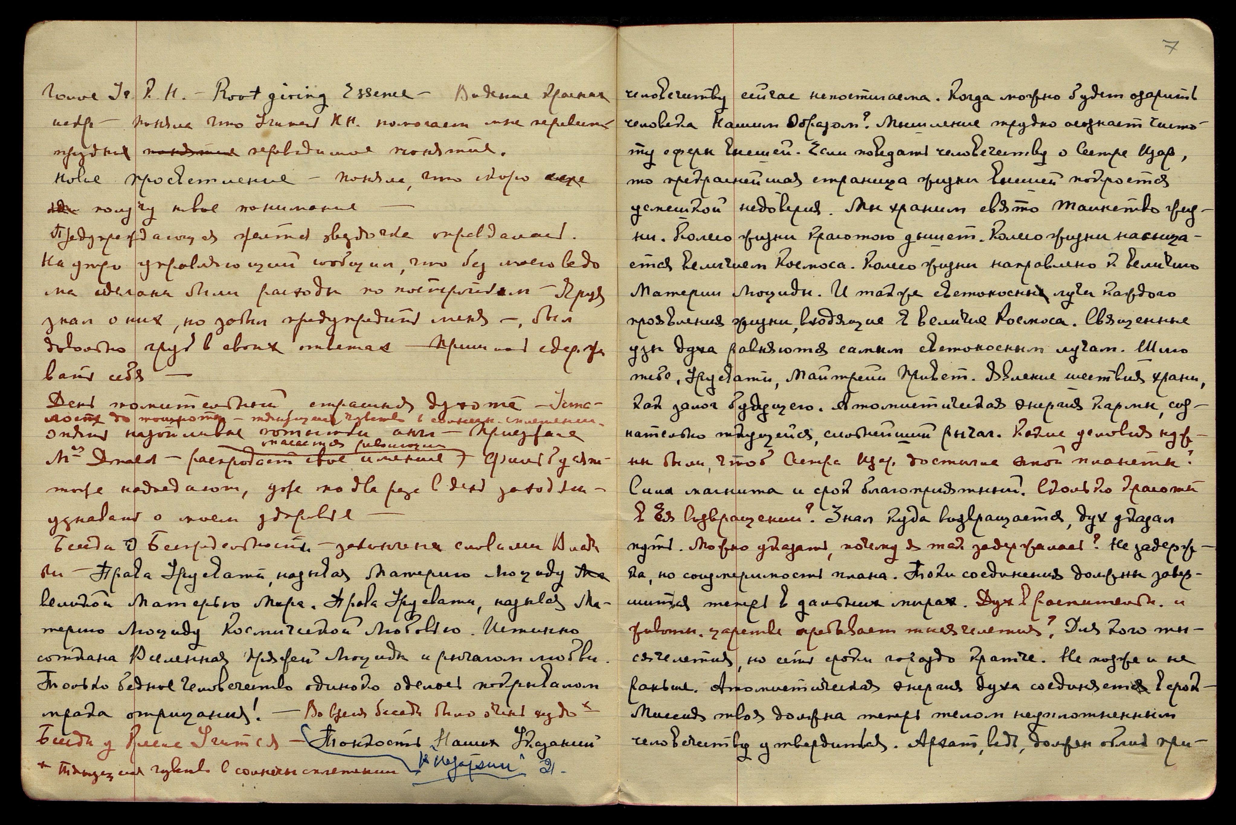6/7 на 7 августа. Ночь тёплая, но не душная, заснула лишь после 4-х часов. Слышала обращение Владыки, не записала и всё забыла. Было видение Н[иколая] К[онстантиновича], как всегда, очень светлого, но очень сосредоточенно смотрящего на меня. Усталость ещё большая. Воздействие лучей очень продолжительное, но, кроме легчайших вибраций, никаких ощущений. Во время бесед замечаю только [слово неразборчиво] свет из центров скул.