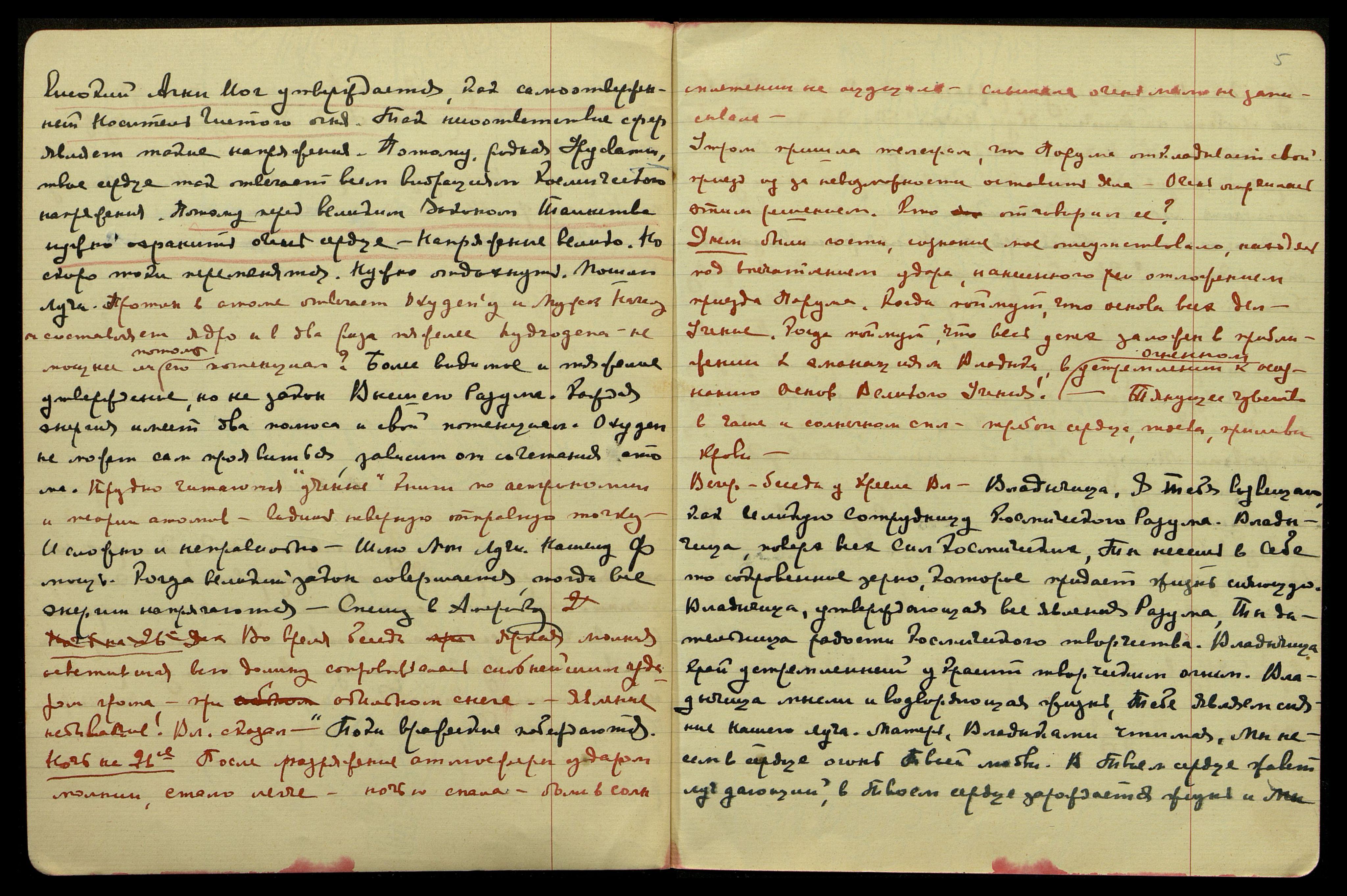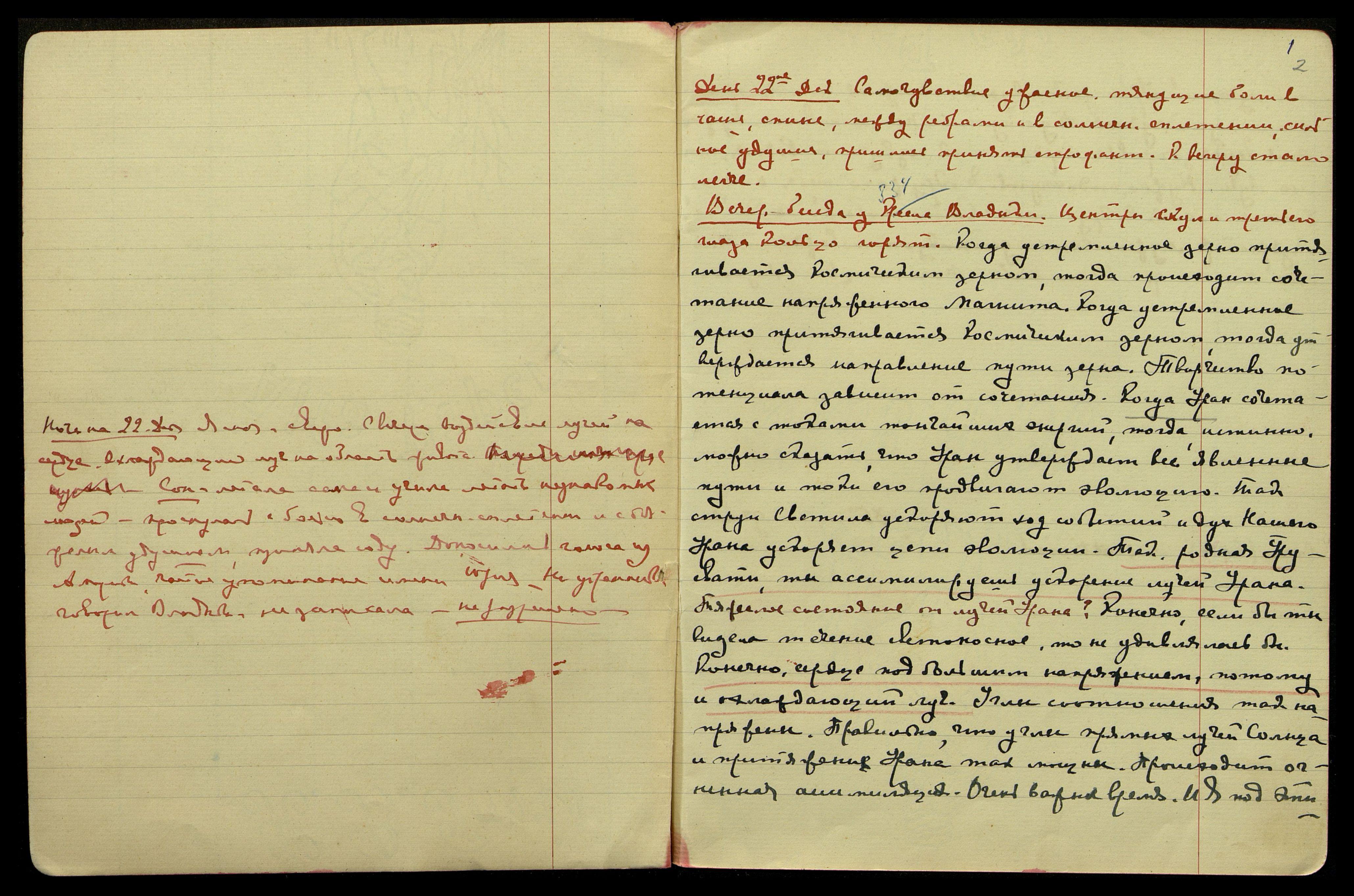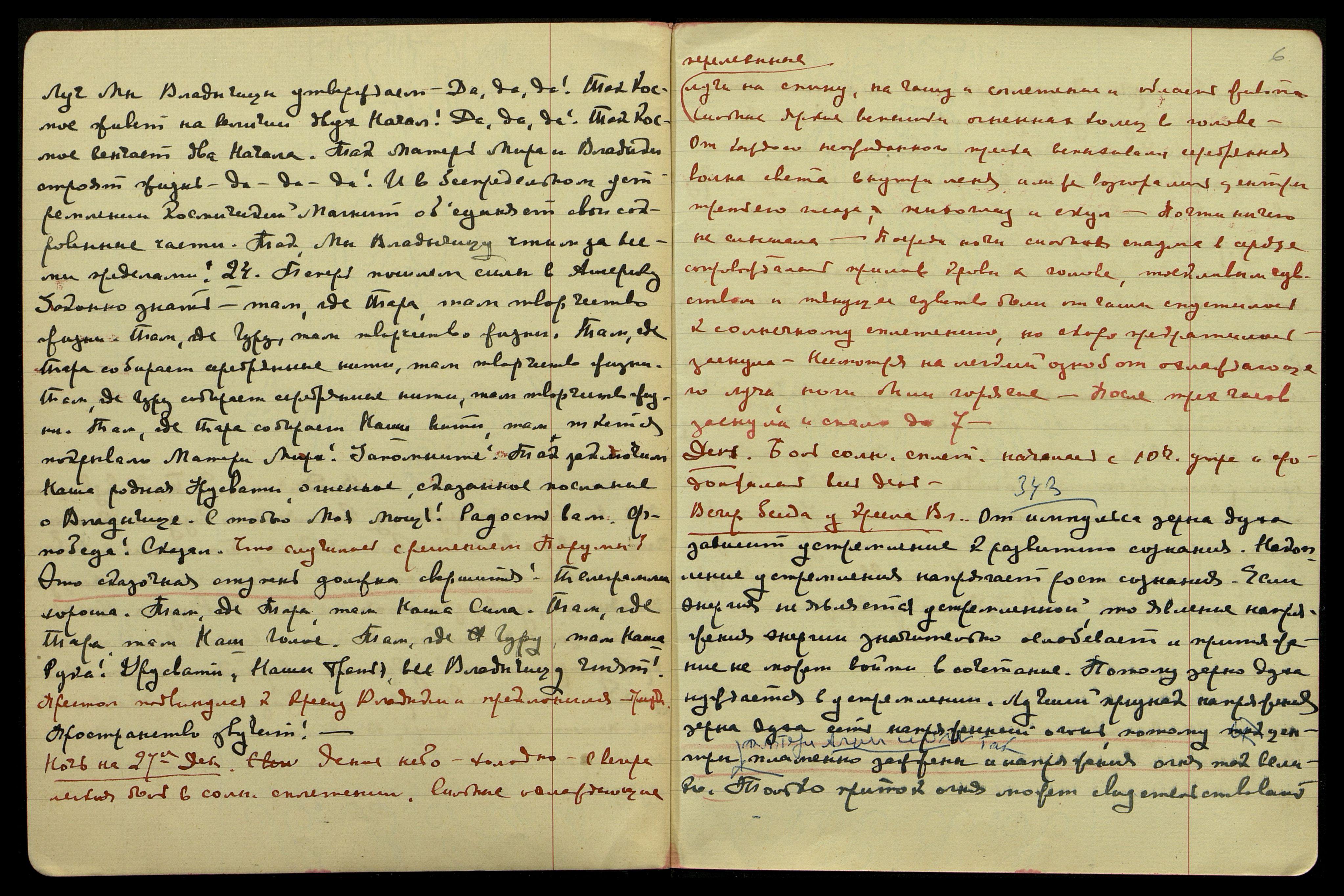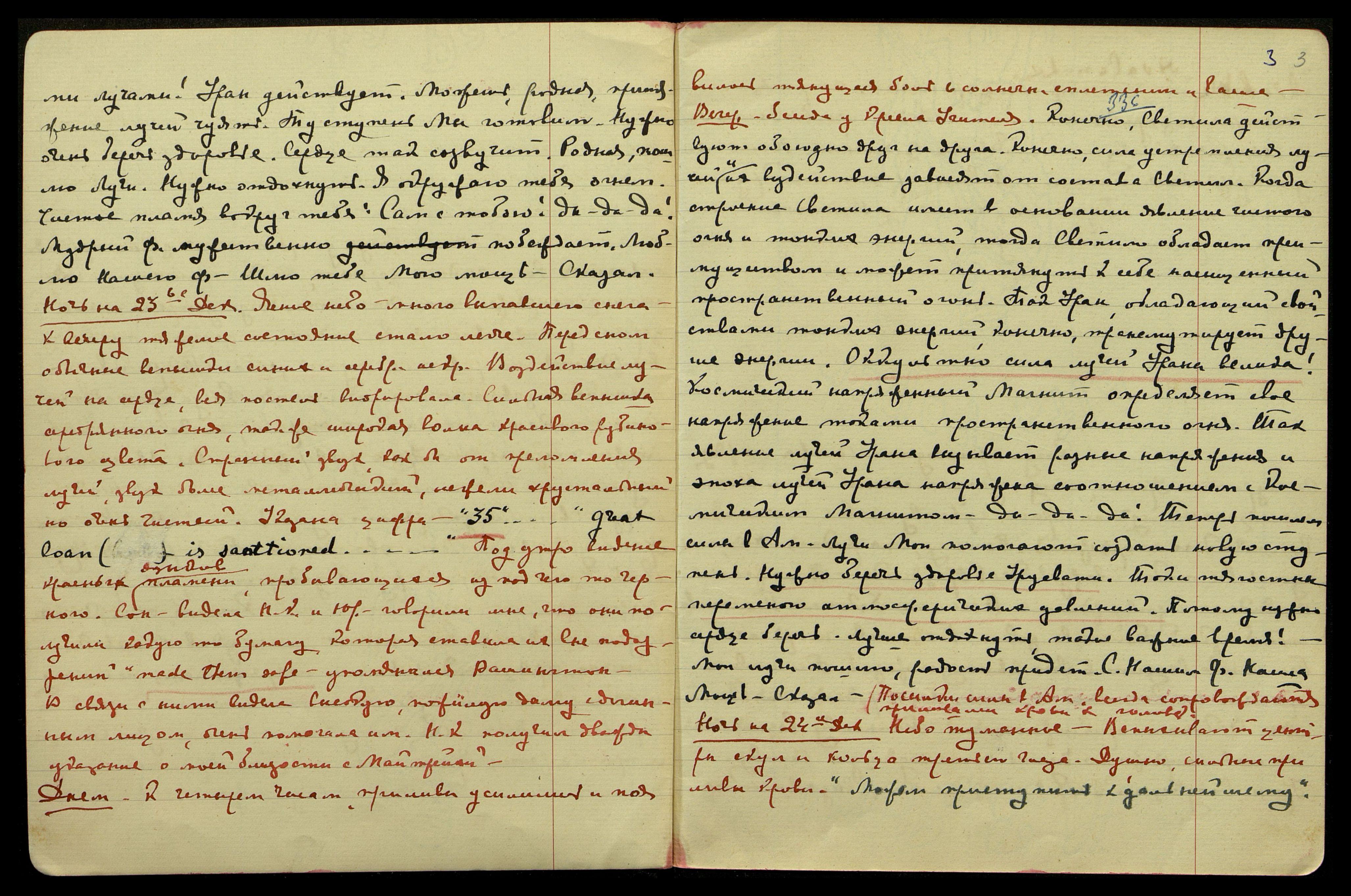 Ночь на 23-е декабря. Ясное небо, много выпавшего снега. К вечеру тяжёлое состояние стало легче. Перед сном обычные вспышки синих и серебр[яных] искр. Воздействие лучей на сердце, вся постель вибрировала. Сильная вспышка серебряного огня, также широкая волна красивого рубинового цвета. Странный звук как бы от преломления лучей, звук более металлический, нежели хрустальный, но очень чистый. Указана цифра – "35" "...great loan is sanctioned... [англ: большой кредит санкционирован...]" Под утро видение красных языков пламени, пробивающихся из-под чего-то чёрного. Сон – видела Н[иколая] К[онстантиновича] и Юр[ия]. Говорили мне, что они получили какую-то бумагу, которая ставила их вне подозрений "made them safe" [англ: сделала их безопасными]. Упоминался Рамингтон. В связи с ними видела высокую, пожилую даму с длинным лицом, очень помогала им. Н[иколай] К[онстантинович] получил дважды указание о моей близости с Майтрейей.
