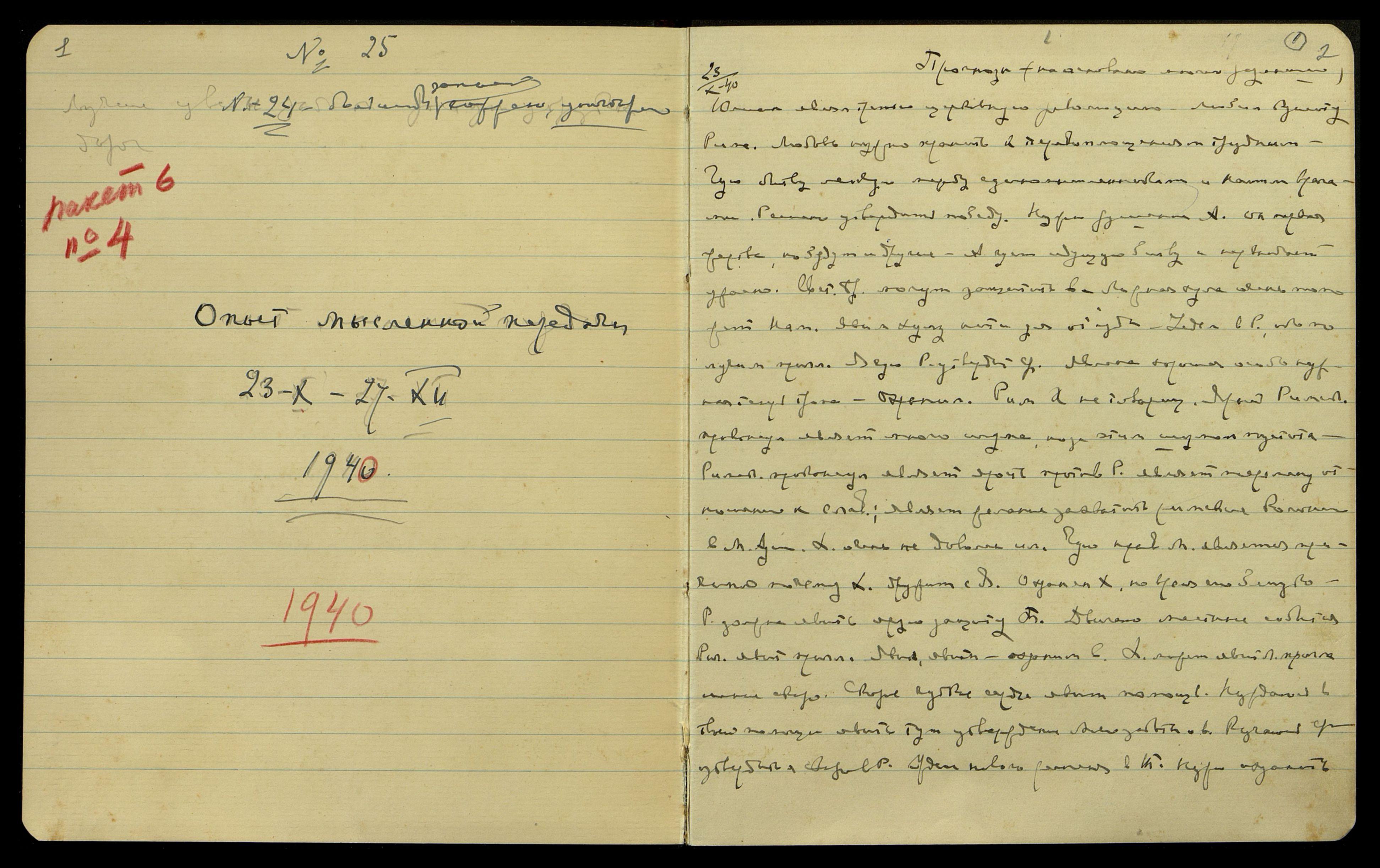 Название, датировка и формат оригинала на сайте ГМР: Записи бесед с Учителем. [«Огненный опыт» вариант I] «Опыт мысленной передачи». Тетрадь 25. 1940.10.23 - 1940.12.27 автограф русский 79 Тетрадь «№1026» [США] бордовая обложка