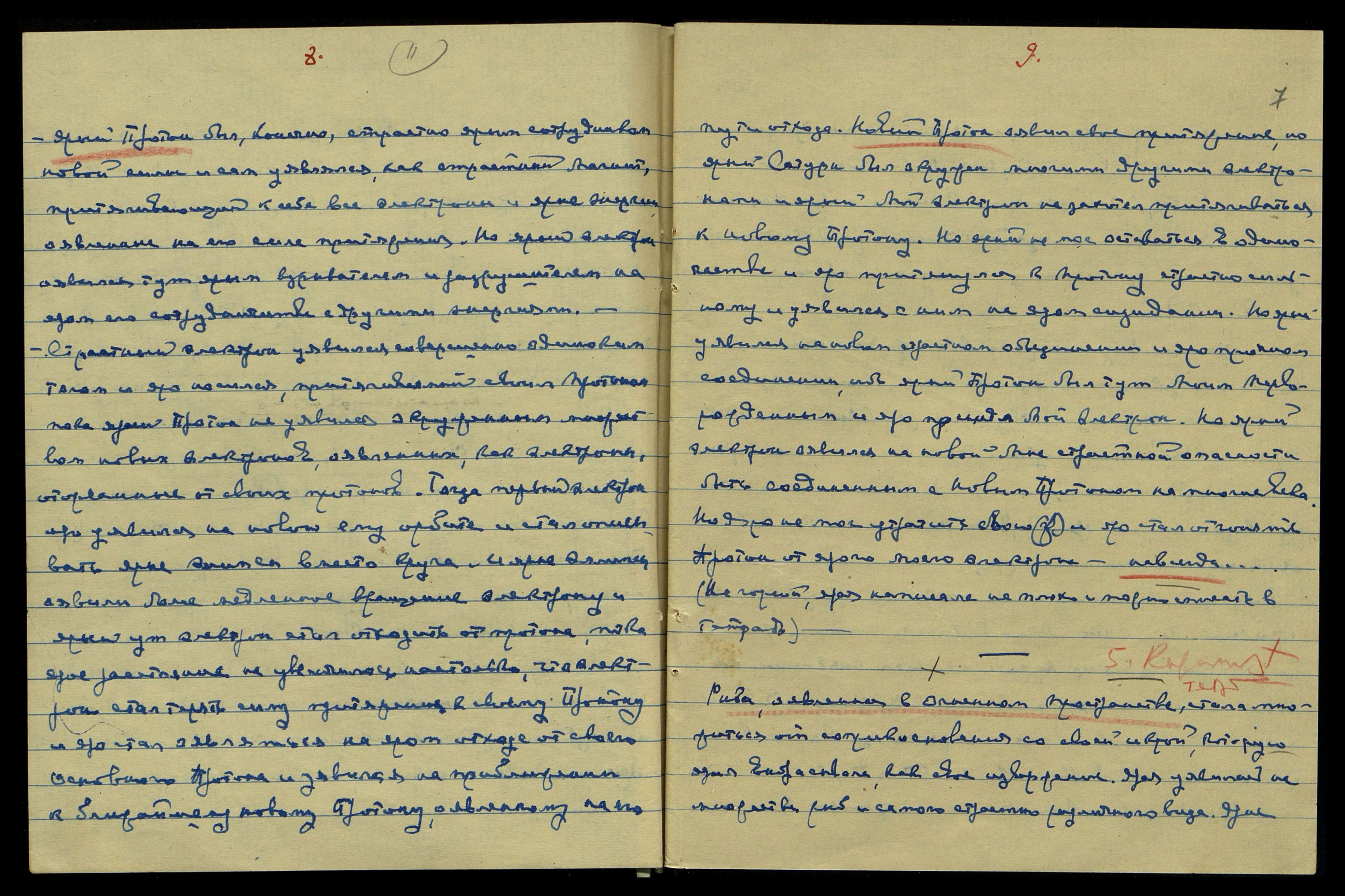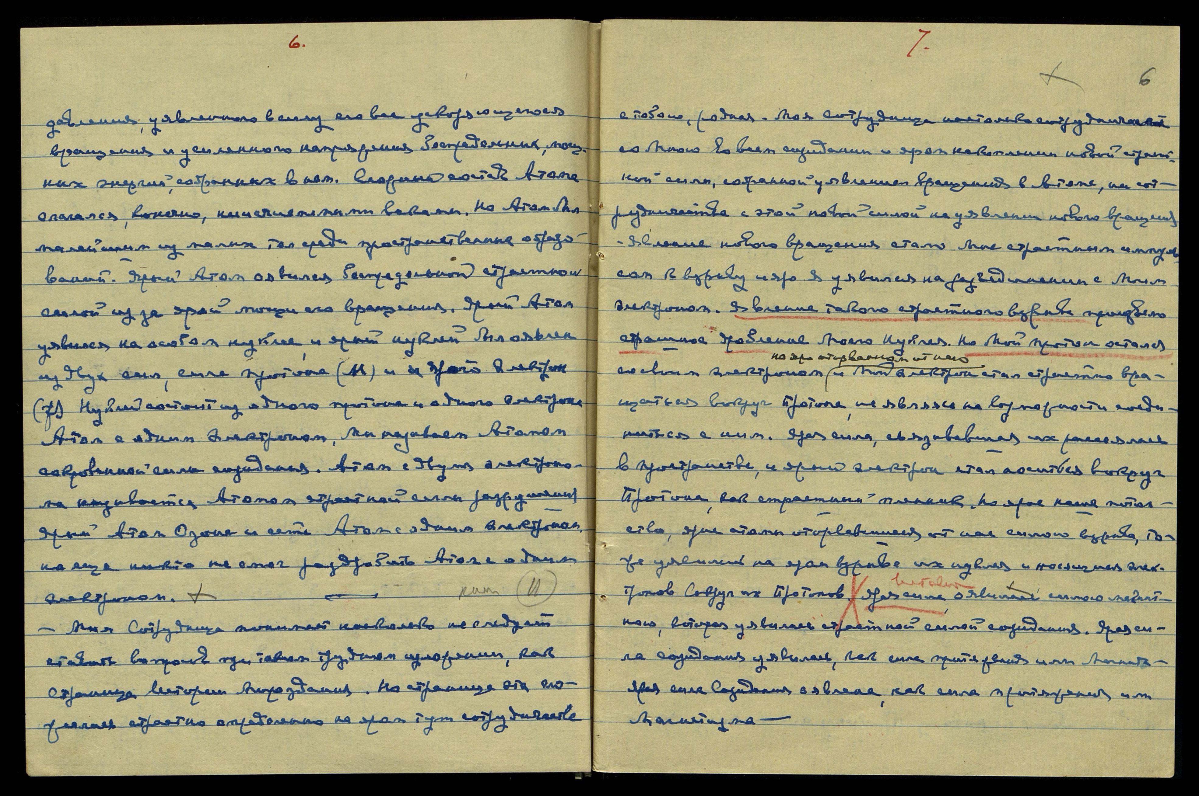 Страстный электрон уявился совершенно одиноким телом и яро носился, притягиваемый своим протоном, пока ярый Протон не уявился окруженным множеством новых электронов, оявленных как электроны, оторванные от своих протонов. Тогда первый электрон яро уявился на новой ему орбите и стал описывать ярые эллипсы вместо круга, и ярые эллипсы оявили более медленное вращение электрону, и ярый тут электрон стал отходить от протона, пока ярое расстояние не увеличилось настолько, что электрон стал терять силу притяжения к своему Протону и яро стал оявляться на яром отходе от своего основного Протона, и уявился на приближении к ближайшему новому Протону, оявленному на его пути отхода. Новый Протон оявил свое притяжение, но ярый Сатурн был окружен многими другими электронами, и ярый Мой электрон не захотел притягиваться к новому Протону. Но ярый не мог оставаться в одиночестве, и яро притянулся к протону страстно сильному и уявился с ним на яром созидании. Но ярый уявился на новом страстном объединении и яро прочном соединении, ибо ярый Протон был тут Моим Перворожденным и яро принял Мой Электрон. Но ярый электрон оявился на новой Мне страстной опасности быть соединенным с новым Протоном на многие века. Но яро не мог утратить Мою (ж[ену]) и яро стал отгонять Протон от ярого моего электрона − навсегда...