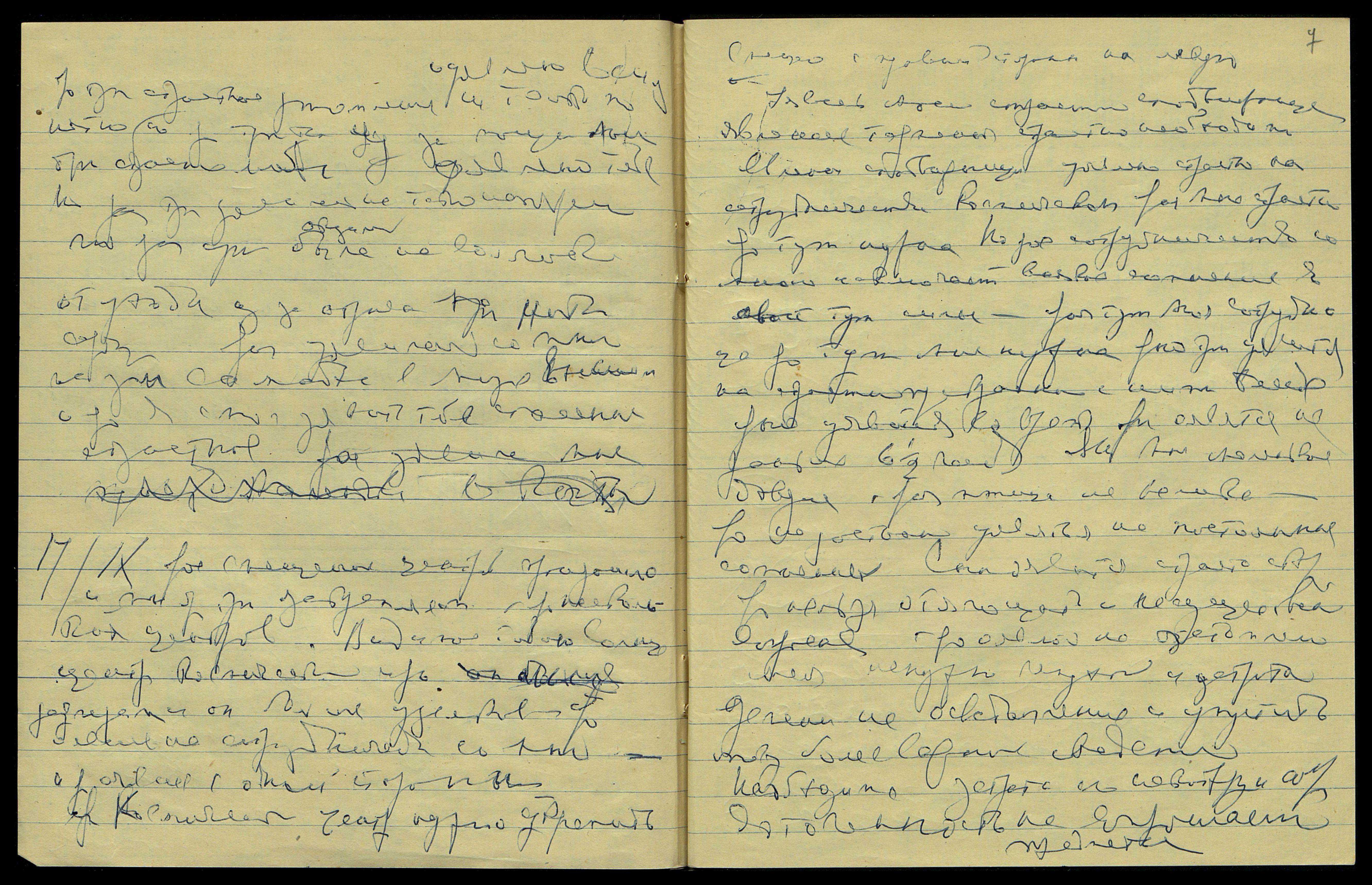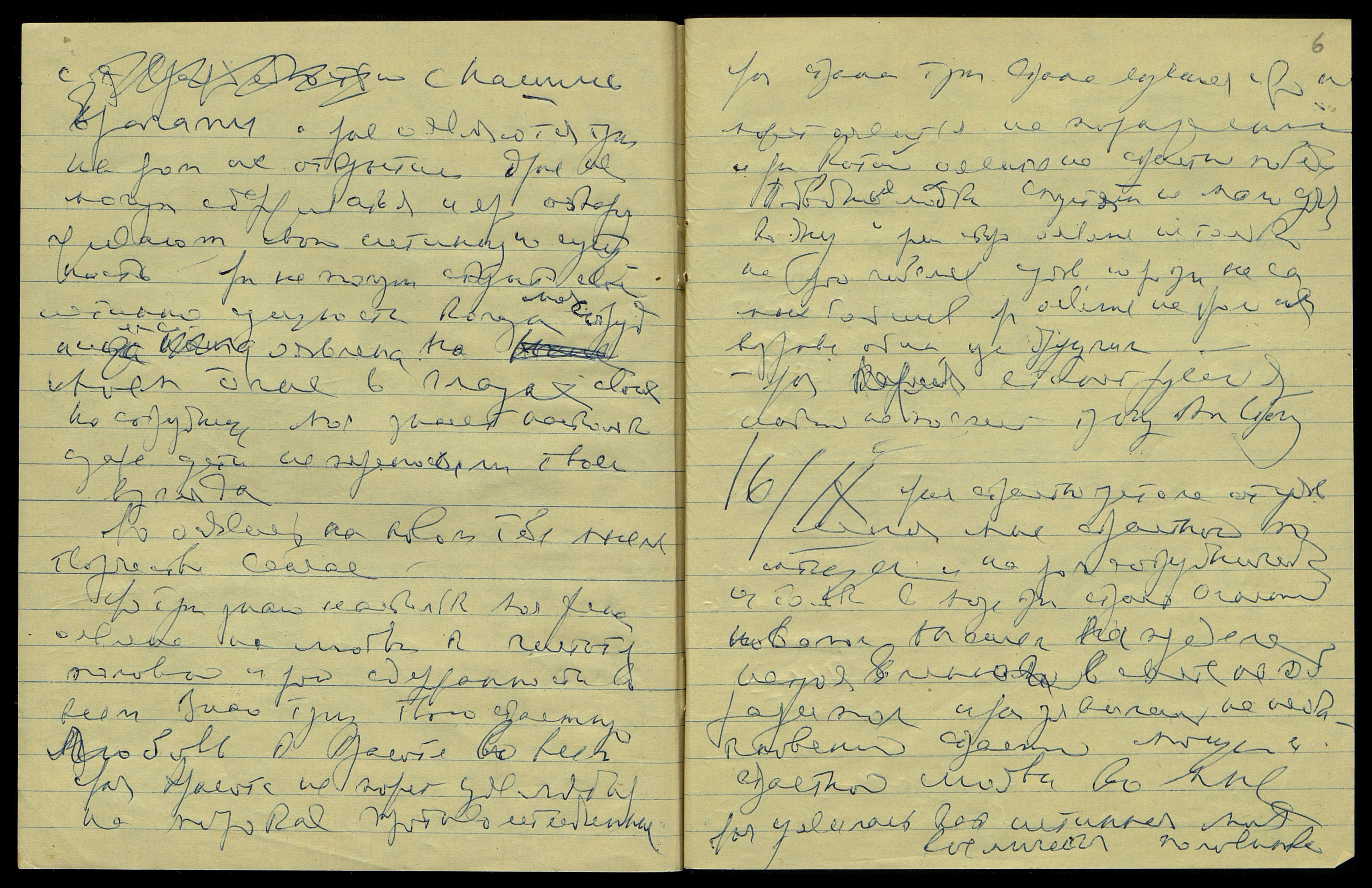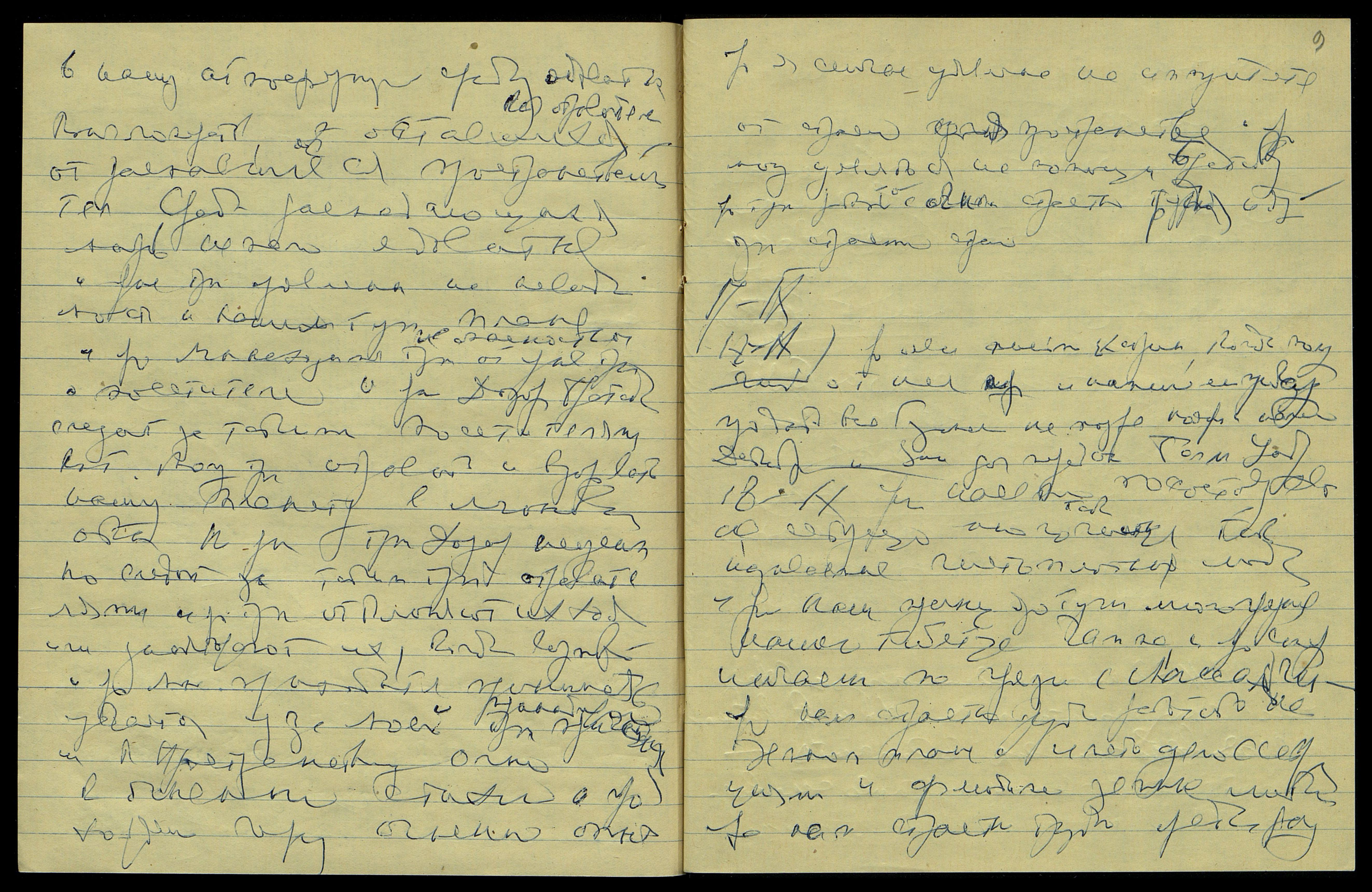 Яро тут напиши Абрам[ову] и яр[ой] ЕК[а] о яром тебе оявлен[ии] на старом месте яро больше года и, конечно, оповещу вас о перемене адреса. Яро легенд о нашем передвижении много, и яро продолжают обнаруживаться и из новых мест. Конечно, оповестили бы близких друзей о перемене адреса — потому не верьте, родная, слухам — много могу[т] тут оявиться и яро тут нелепых. Яро имею несколько таких шедевров измышления от людей абсолютно незнаком[ых] и яро тут [слово неразборчиво] от психичес[ки] больного сознания. Нужно привыкать ко все[му]. Но яро настолько интенсивно участвую в космическом созидании тут, что яро тут не могу уделять слишком много внимания плану земн[ому].
