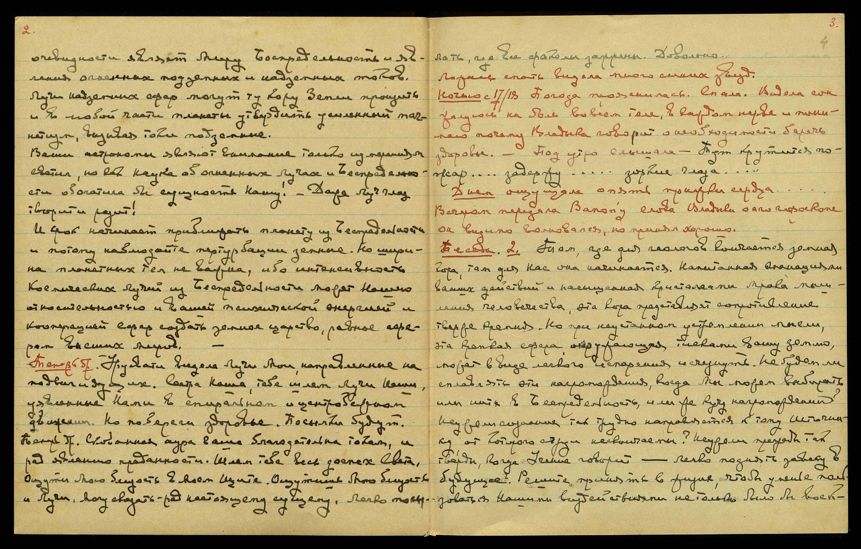 Теперь др[угое]. Урусвати видела Лучи Мои, направленные на подвиг идущих. Сестра Наша, тебе шлём Лучи Наши, уявленные Нами в спиральном и центробежном движении. Но побереги здоровье. Посылки будут.