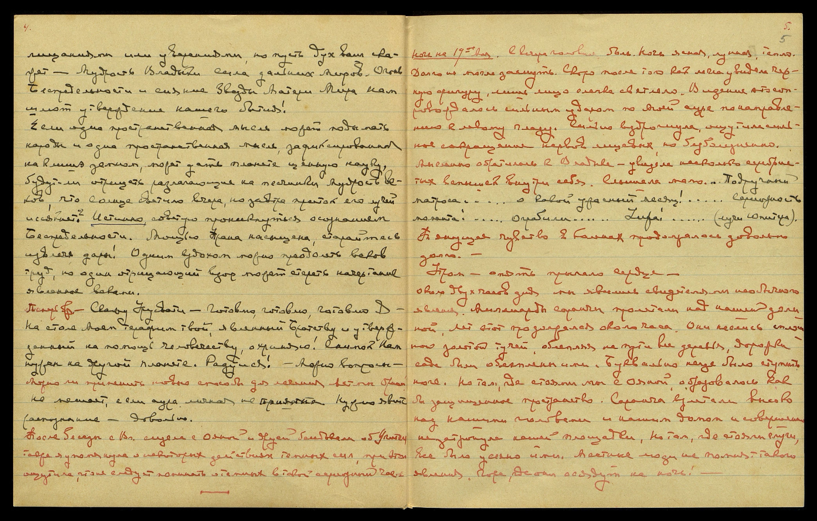 Ночь на 20 мая. С вечера болела голова. Ночь тёплая. Луна. Легла поздно. Кроме синего света, ничего не видела и мало слышала. Ложась, думала о Н[иколае] К[онстантиновиче] и сыновьях, услышала: "Не волнуйся!" Под утро слышала: "Вихрь счастья!" Сон. Была в Америке. Кто-то с ангельскими глазами усложняет дела.