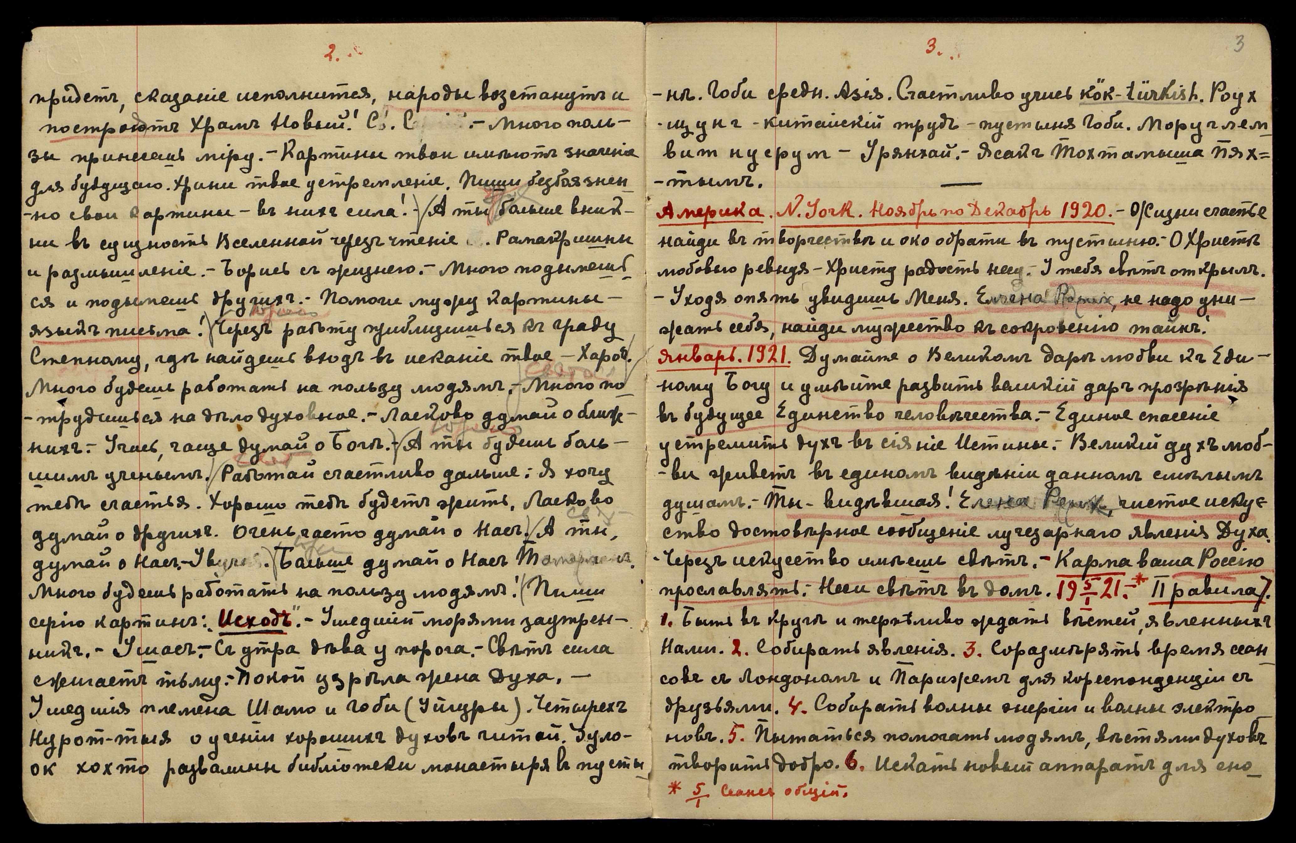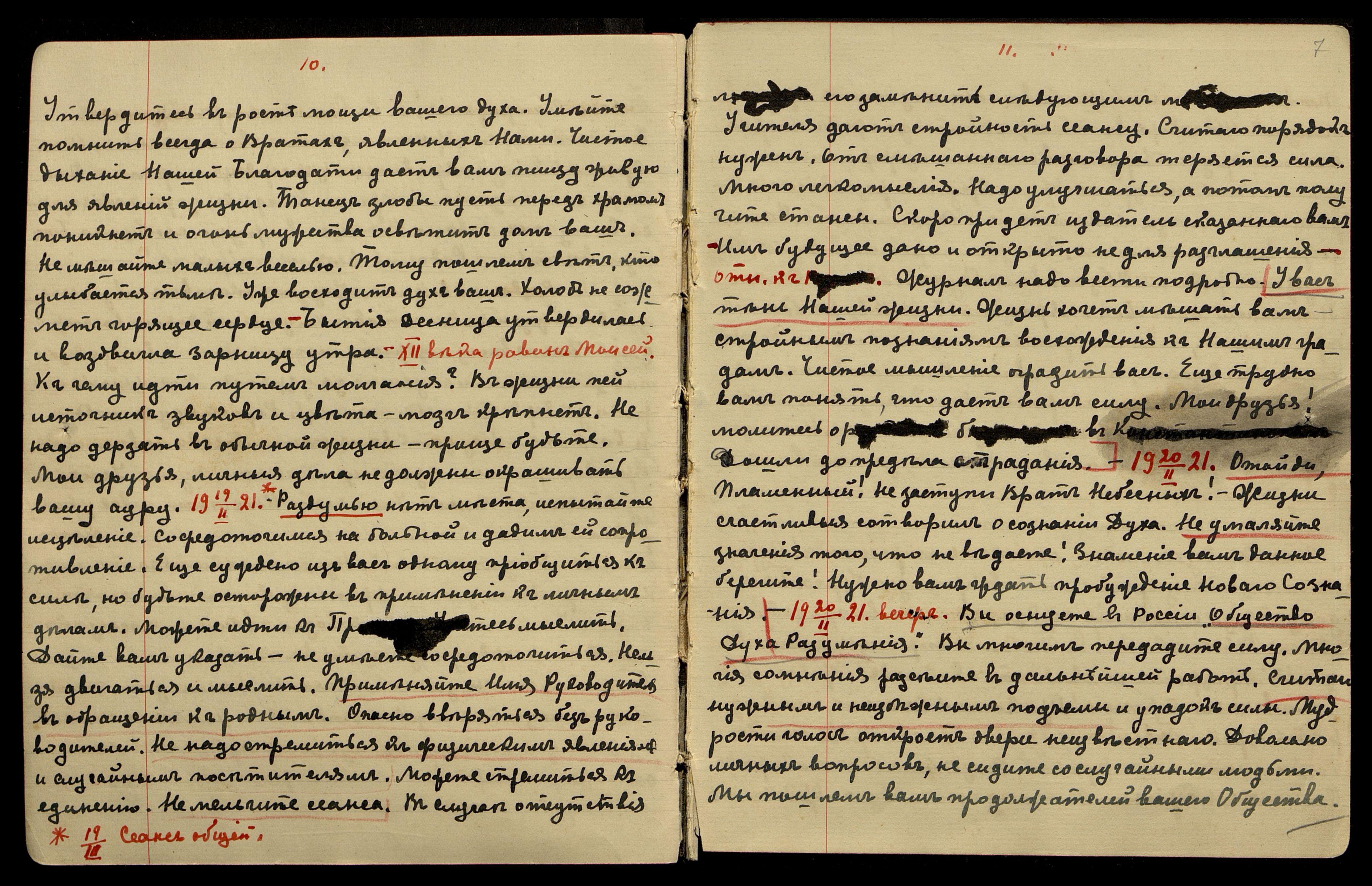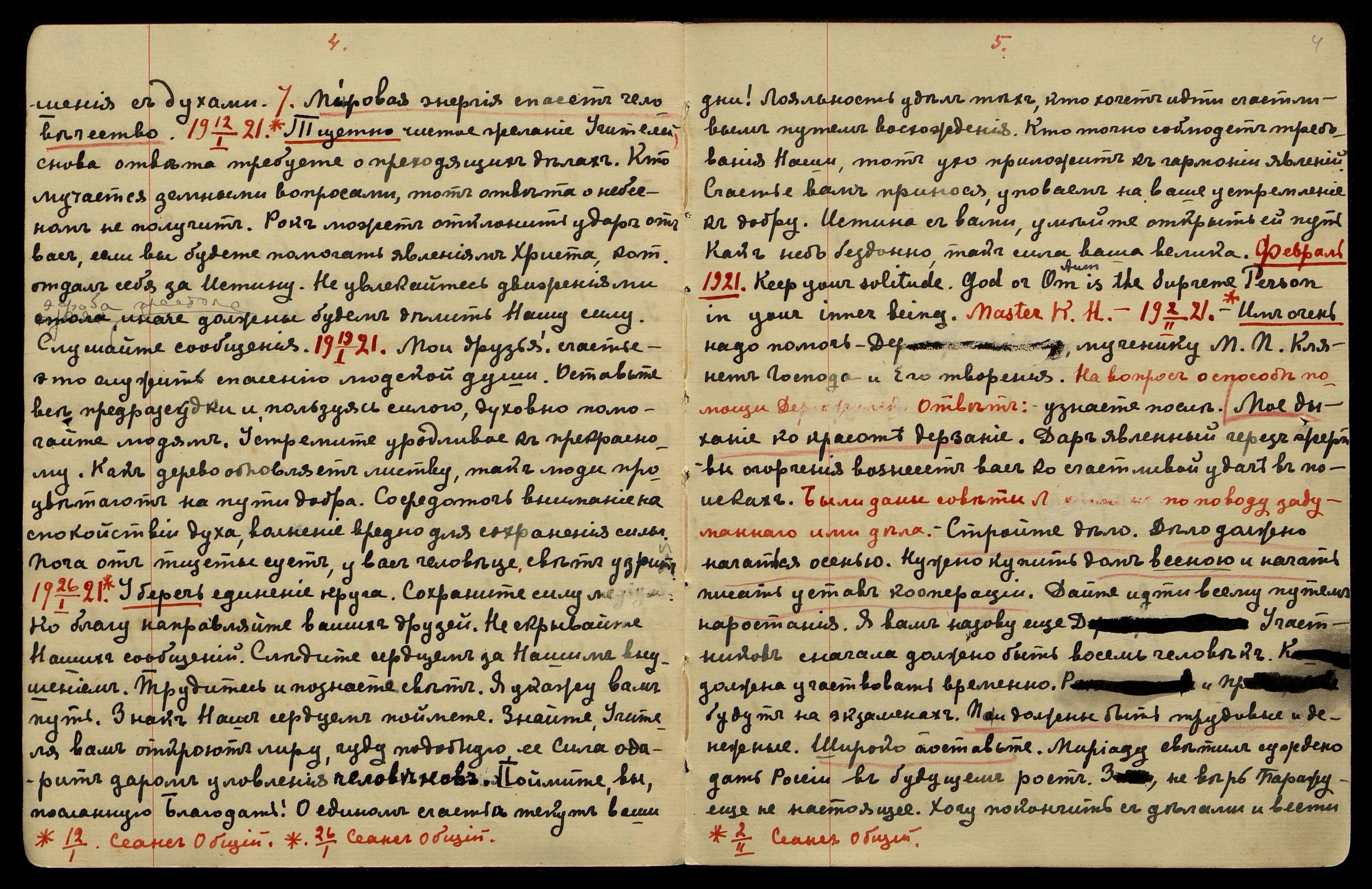 20/II-1921. Вечер. Вы оснуёте в России "Общество Духа Разумения". Вы многим передадите силу. Многие сомнения рассеете в дальнейшей работе. Считай нужным и неизбежным подъёмы и упадок силы. Мудрости голос откроет двери неизвестного. Довольно личных вопросов, не сидите со случайными людьми. Мы пошлем вам продолжателей вашего Общества.