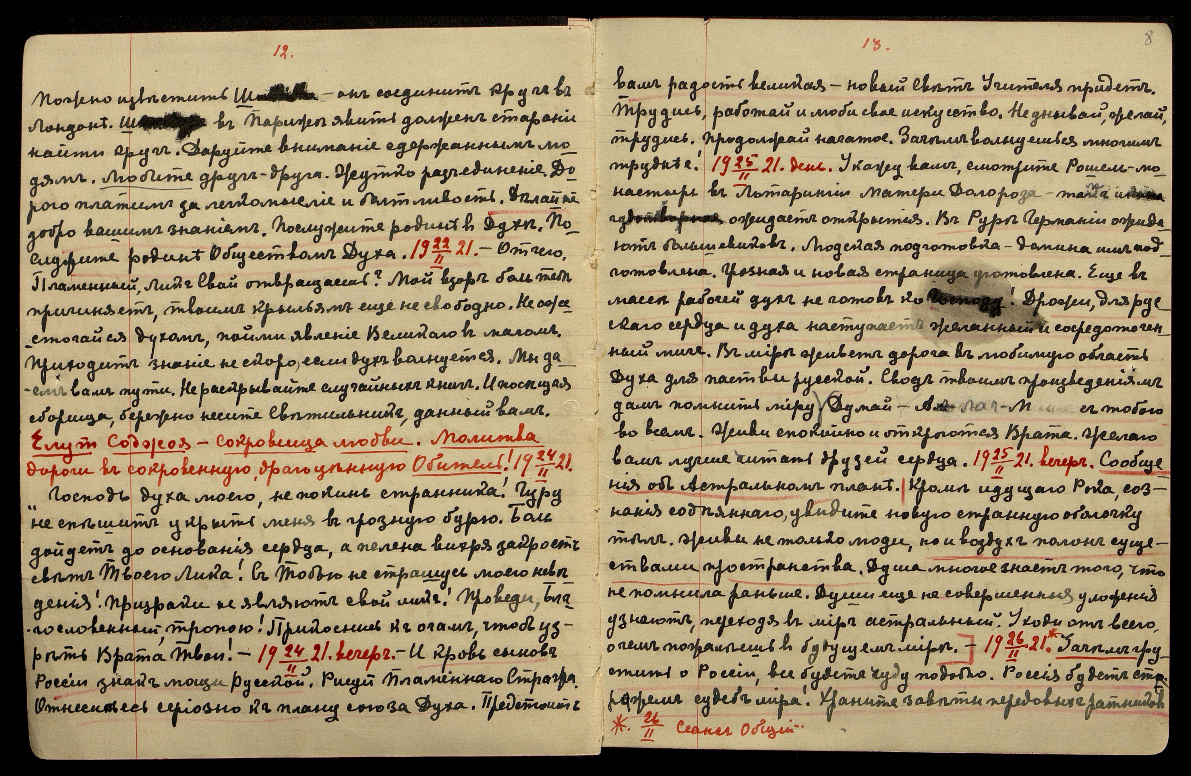 24/II-1921. Вечер. И кровь сынов России − знак мощи Русской. Рисуй Пламенного Стража. Отнеситесь серьезно к плану союза Духа. Предстоит вам радость великая − новый свет Учителя придёт. Трудись, работай и люби своё искусство. Не унывай, желай, трудись. Продолжай начатое. Зачем волнуешься − многим труднее!