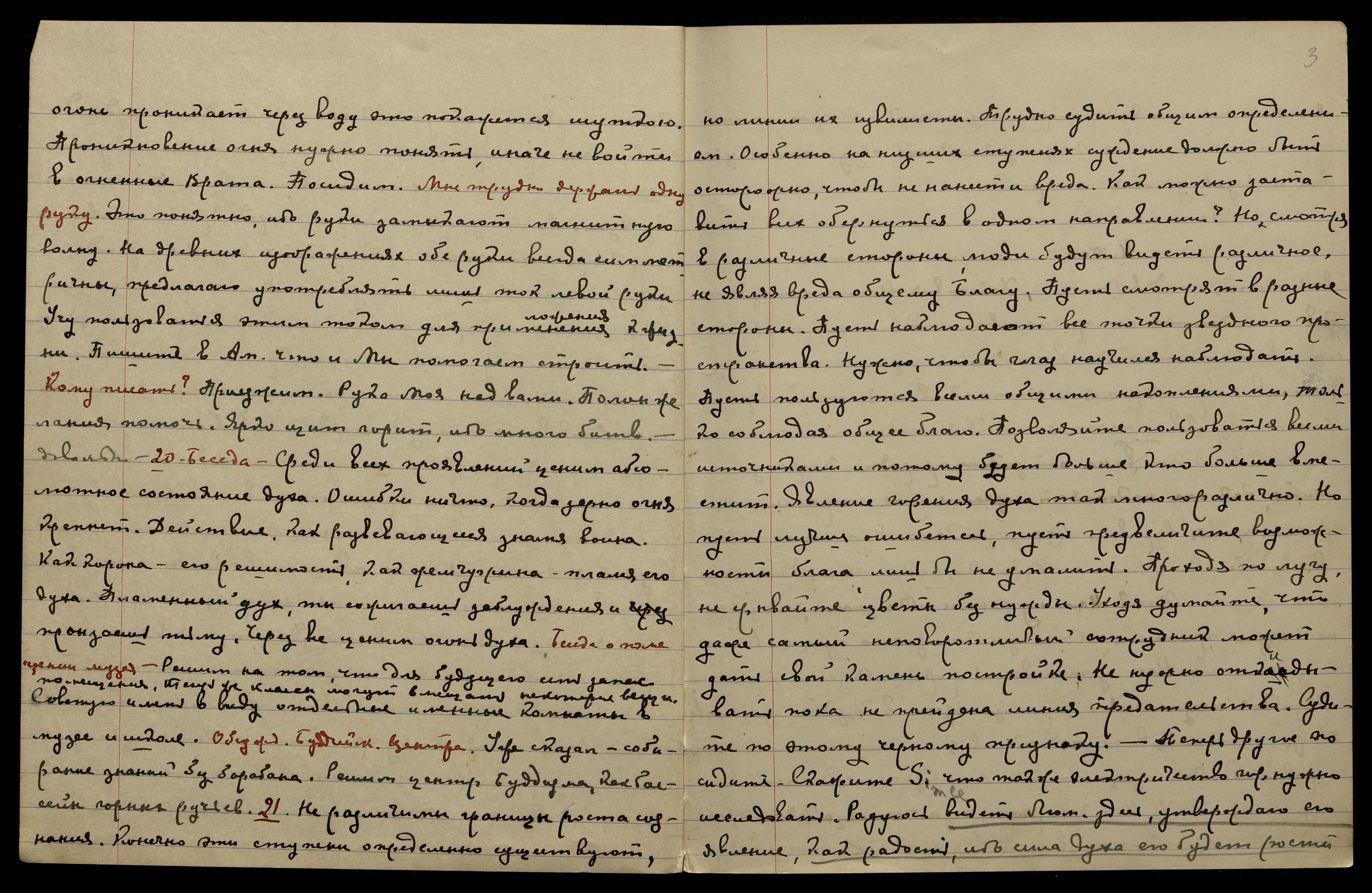 20 [августа]. Беседа. Среди всех проявлений ценим абсолютное состояние духа. Ошибки ничто, когда зерно огня крепнет. Действие, как развевающееся знамя воина. Как корона − его решимость, как жемчужина − пламя его духа. Пламенный дух, ты сожигаешь заблуждения и пронзаешь тьму. Через все ценим огонь духа.
