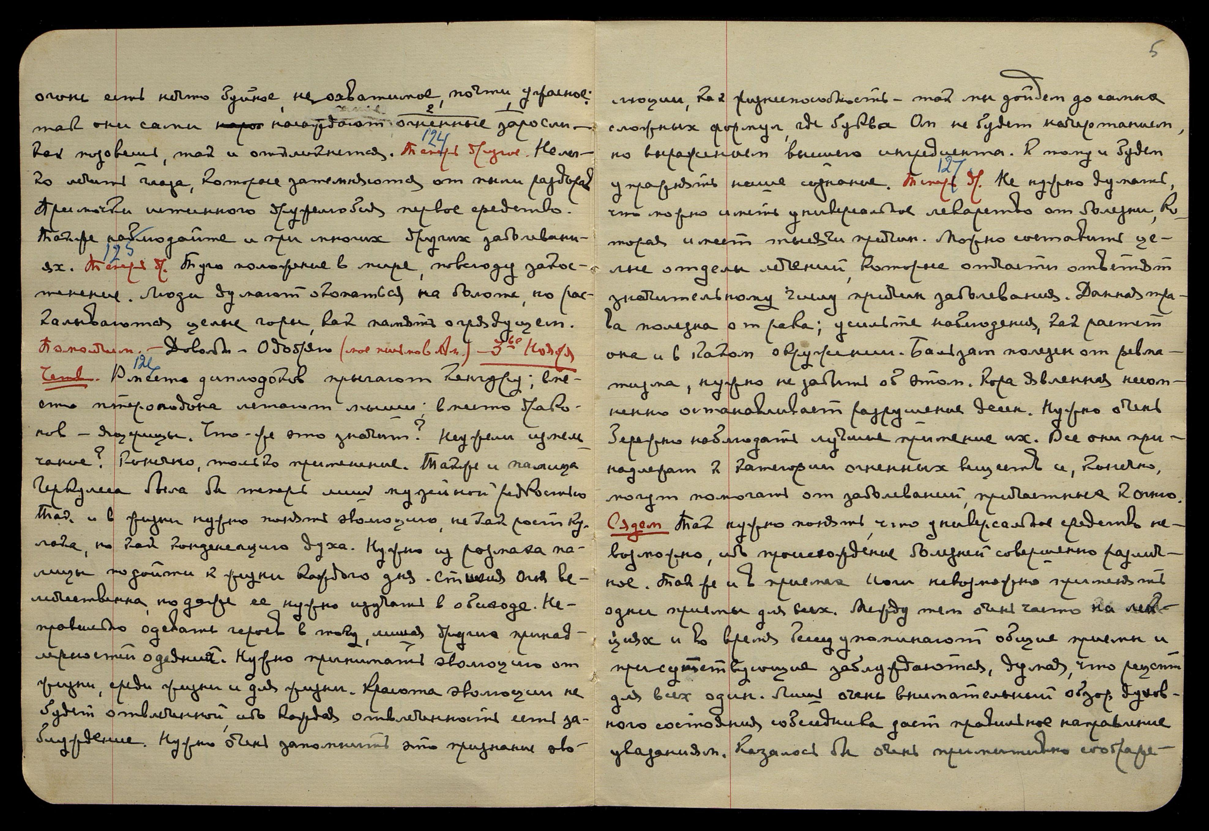 огонь есть нечто буйное, неохватимое, почти ужасное, так они сами насаждают заросли огненные. Как позовёшь, так и откликнется. Теперь др[угое]. § 124. Нелегко лечить глаза, которые затемняются от пыли раздоров. Примочки истинного дружелюбия − первое средство. Так же наблюдайте и при многих других заболеваниях. Теперь др[угое]. § 125. Туго положение в мире, повсюду закостенение. Люди думают окопаться на болоте, но раскалываются целые горы, как память о грядущем. Помолчим. Довольно. Одобряю (моё письмо в Ам[ерику]).