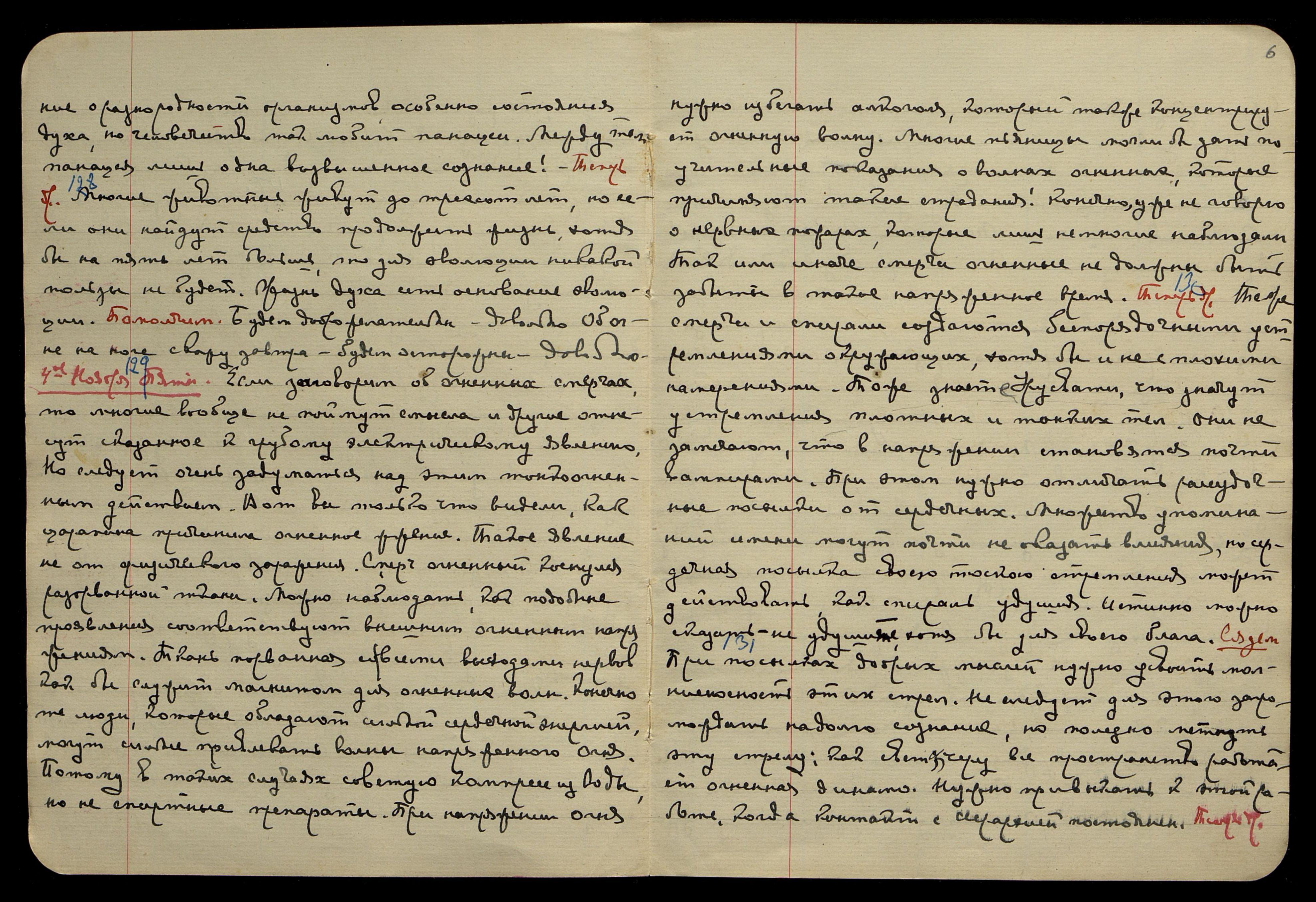 2-ое ноября, среда. § 122. Даже в физических заболеваниях ищите психическую причину. Народы сложили много поговорок об этих влияниях; они скажут: "От сердца глаз затемнился", или "Обеззубел с натуги", или "Раскололась грудь от думы", − так помнят народы о главной причине болезней, и врач разумный различает трудность лечения от духовного состояния. Утверждать можно, что каждая болезнь протекает быстрее, когда она не поддерживается психической причиной. Те же народы приписывали Огню различные целебные качества. Даже порезы производились раскалённым металлом, так огненное обезвреживание утверждалось даже в первобытном сознании. Теперь др[угое]. § 123. Помощь огненная, так называется состояние просветления. Нужно приблизиться к этому состоянию сознания со всеми утончёнными чувствами. Конечно, можно заметить, что иногда говорю почти о том же самом, но в этом "почти" заключён целый оборот спирали. Если сопоставить все эти "почти", то можем признать наслоения нашего сознания. Очень нелегко усвоить ритм этих наслоений, которые различны индивидуально. Но при многих наблюдениях можно понять, какая тончайшая субстанция − наше сознание. Сядем. Именно, подчёркиваю утончение наслоений сознания. Часто люди воображают, что