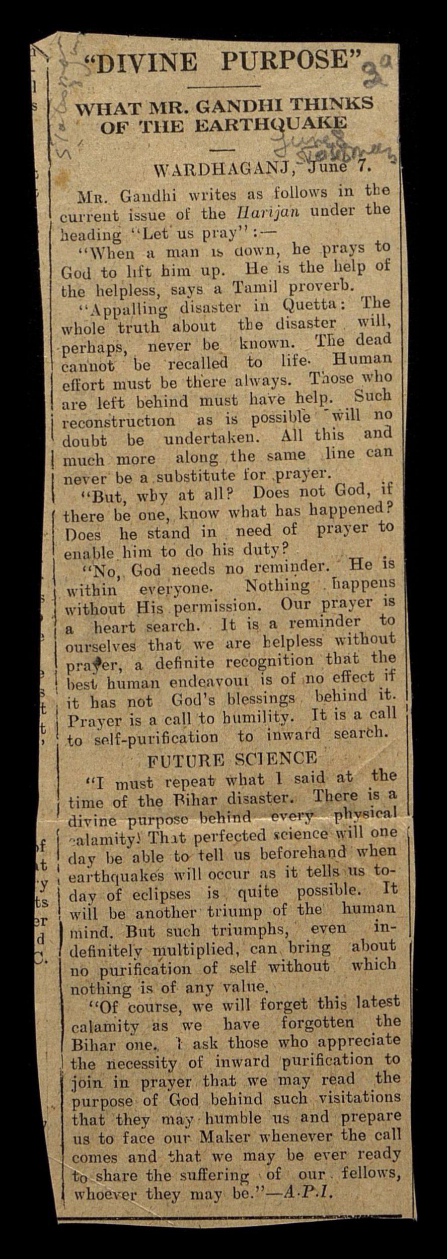 За каждым физическим бедствием стоит божественная цель. То, что совершенная наука однажды сможет сказать нам заранее, когда произойдут землетрясения, как она говорит нам сегодня о затмениях, вполне возможно. Это