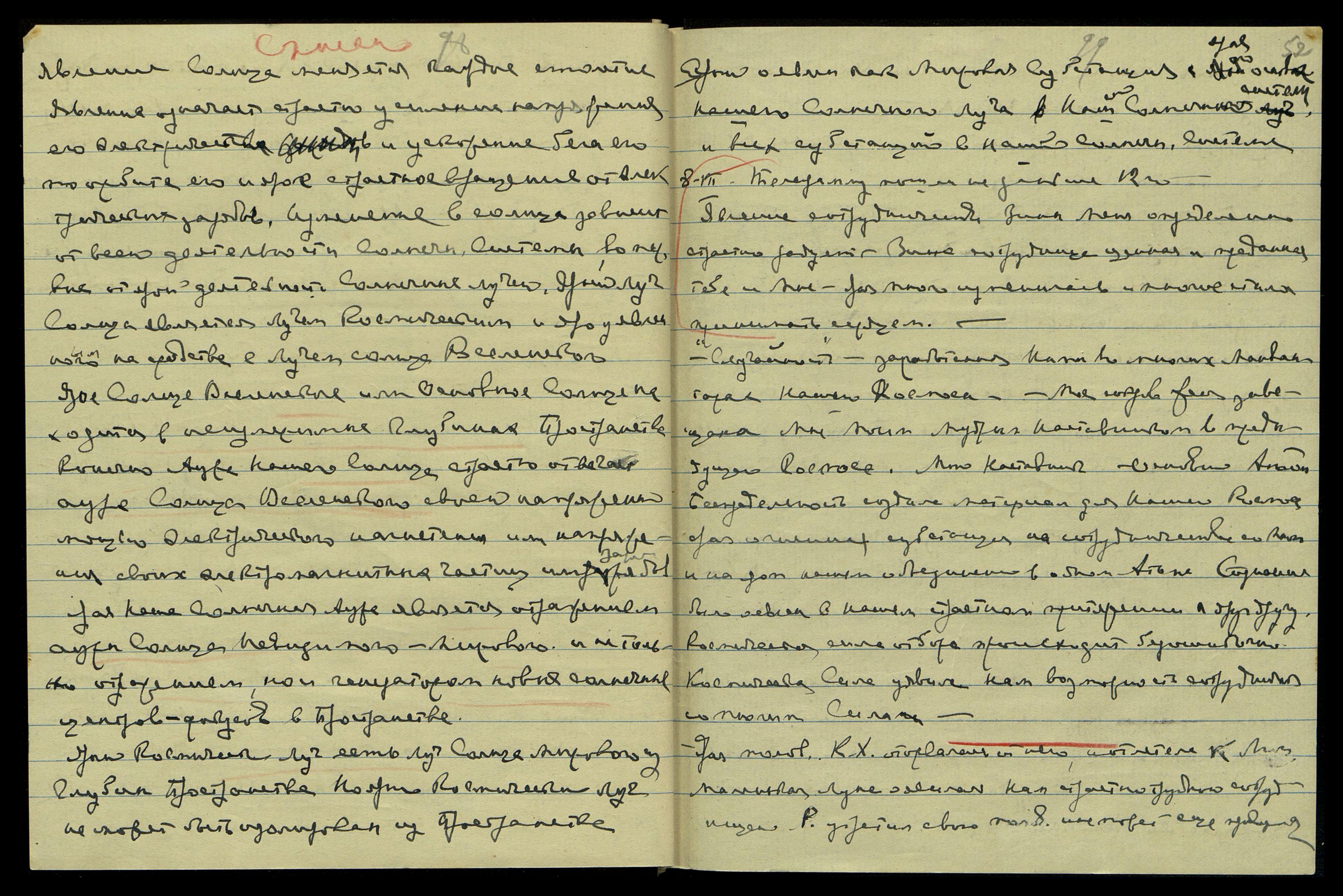 Сотрудничество придёт страстно скорее, чем ярая думает (2). Яви сотрудничество и напиши Зине и подтверди ваше желание служить Р[оссии]. Пусть передаст через представителя [в] Вашингтон[е]. Ярая может передать ваше желание письмом обращен[ием] Сына и Матери. Ярый сын может служить на многих поприщах − Советником по Дальневосточным делам. Поставь "советн[ик]" в конце. Из-за престарелого возраста и слабости сердца ярая не может принять регулярную должность, но ярая может собирать и приводить в порядок материал, остав[шийся] от отца. Произв[одить] ценную работу по собиранию материал[ов] о творч[естве] отца.