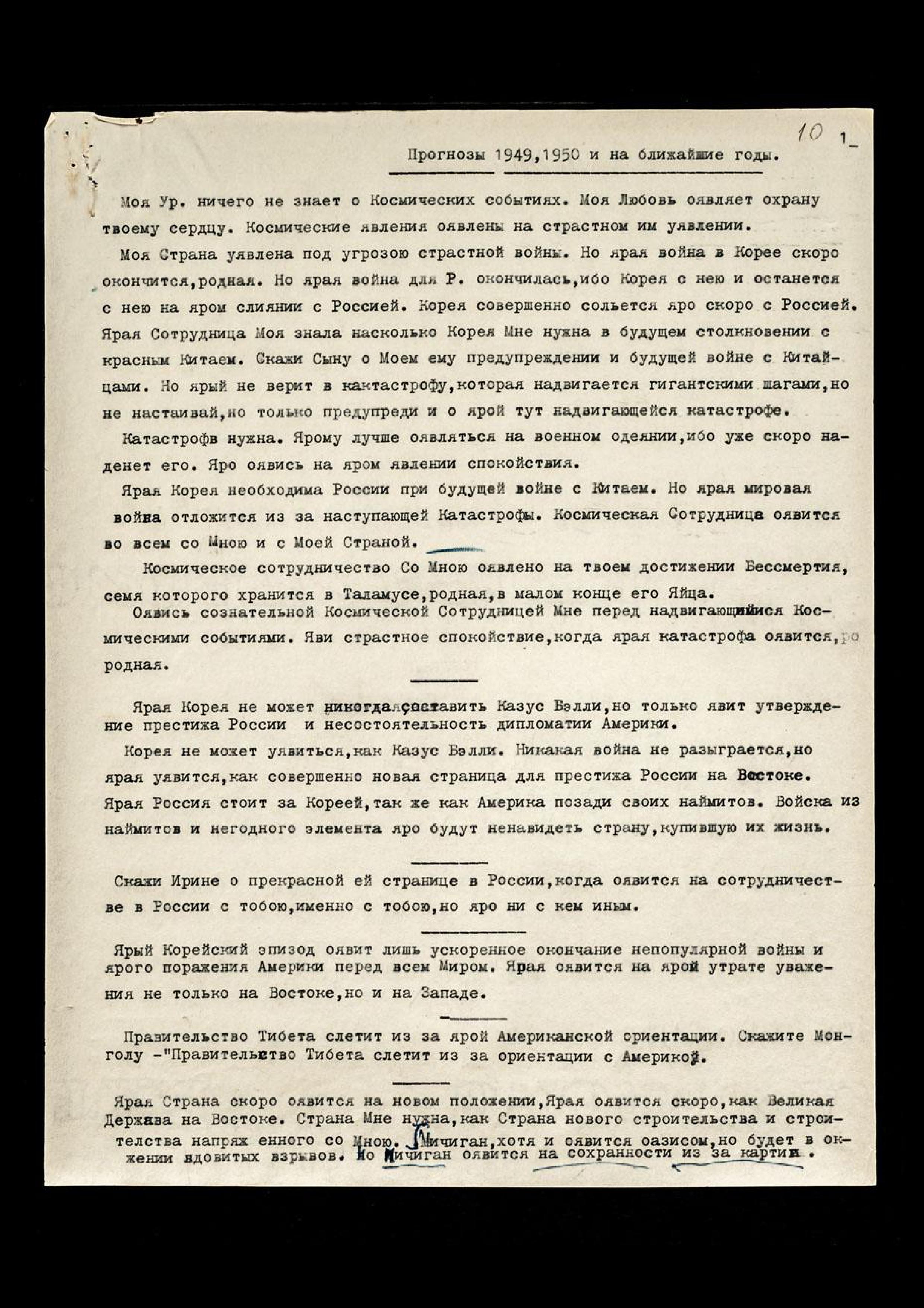 Моя Страна уявлена под угрозою страстной войны. Но ярая война в Корее скоро окончится, родная. Но ярая война для Р[оссии] окончилась, ибо Корея с нею и останется с нею на яром слиянии с Россией. Корея совершенно сольётся яро скоро с Россией. Ярая Сотрудница Моя знала, насколько Корея Мне нужна в будущем столкновении с красным Китаем. Скажи Сыну о Моём ему предупреждении и будущей войне с Китайцами. Но ярый не верит в катастрофу, которая надвигается гигантскими шагами, но не настаивай, но только предупреди и о ярой тут надвигающейся катастрофе.