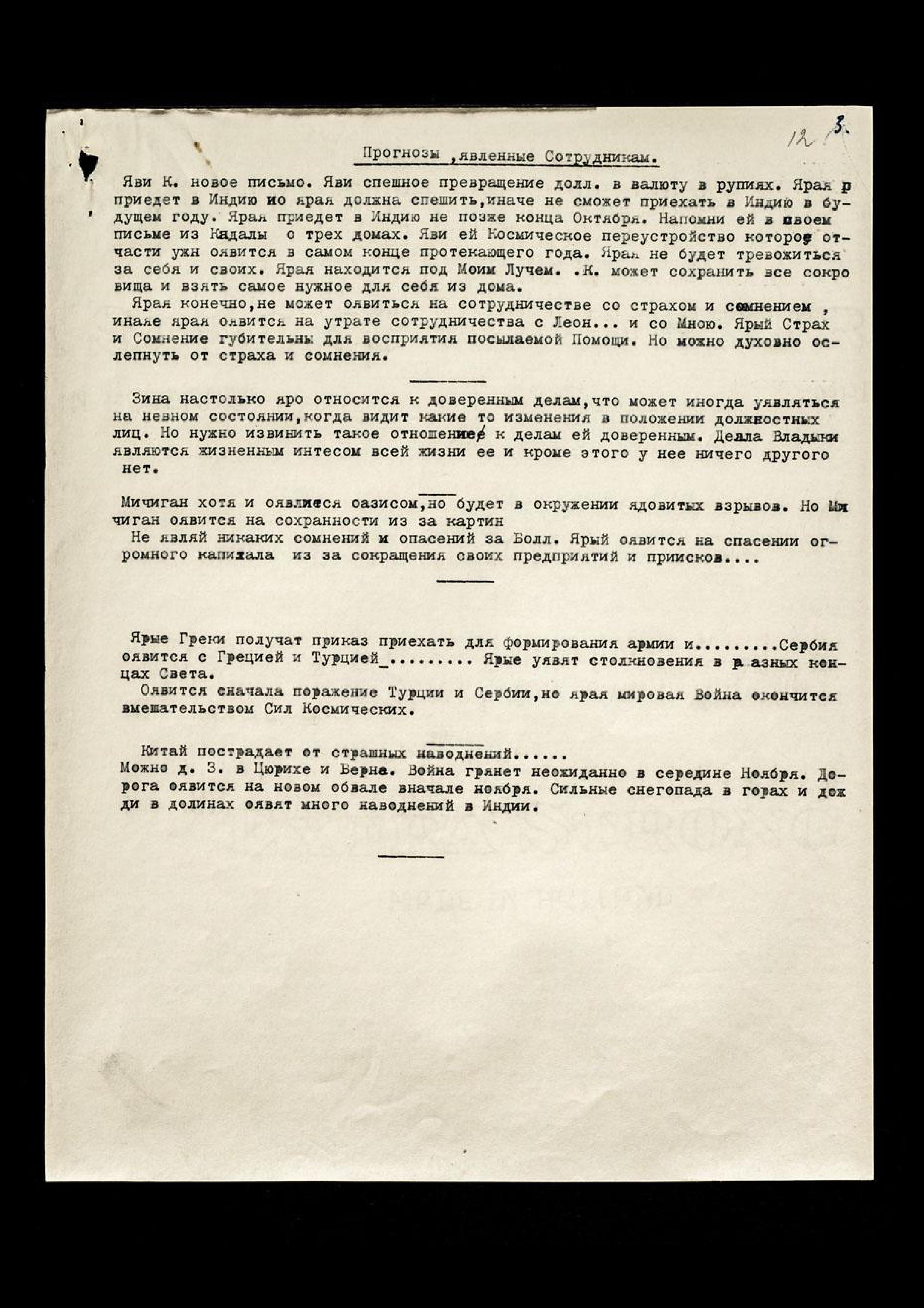 Яви К[этрин Кэмпбелл] новое письмо. Яви спешное превращение долл[аров] в валюту в рупиях. Ярая приедет в Индию, но ярая должна спешить, иначе не сможет приехать в Индию в будущем году. Ярая приедет в Индию не позже конца Октября. Напомни ей в своём письме из Кандалы о трёх домах. Яви ей Космическое переустройство, которое отчасти уже оявится в самом конце протекающего года. Ярая не будет тревожиться за себя и своих. Ярая находится под Моим Лучом. К[этрин Кэмпбелл] может сохранить все сокровища и взять самое нужное для себя из дома.