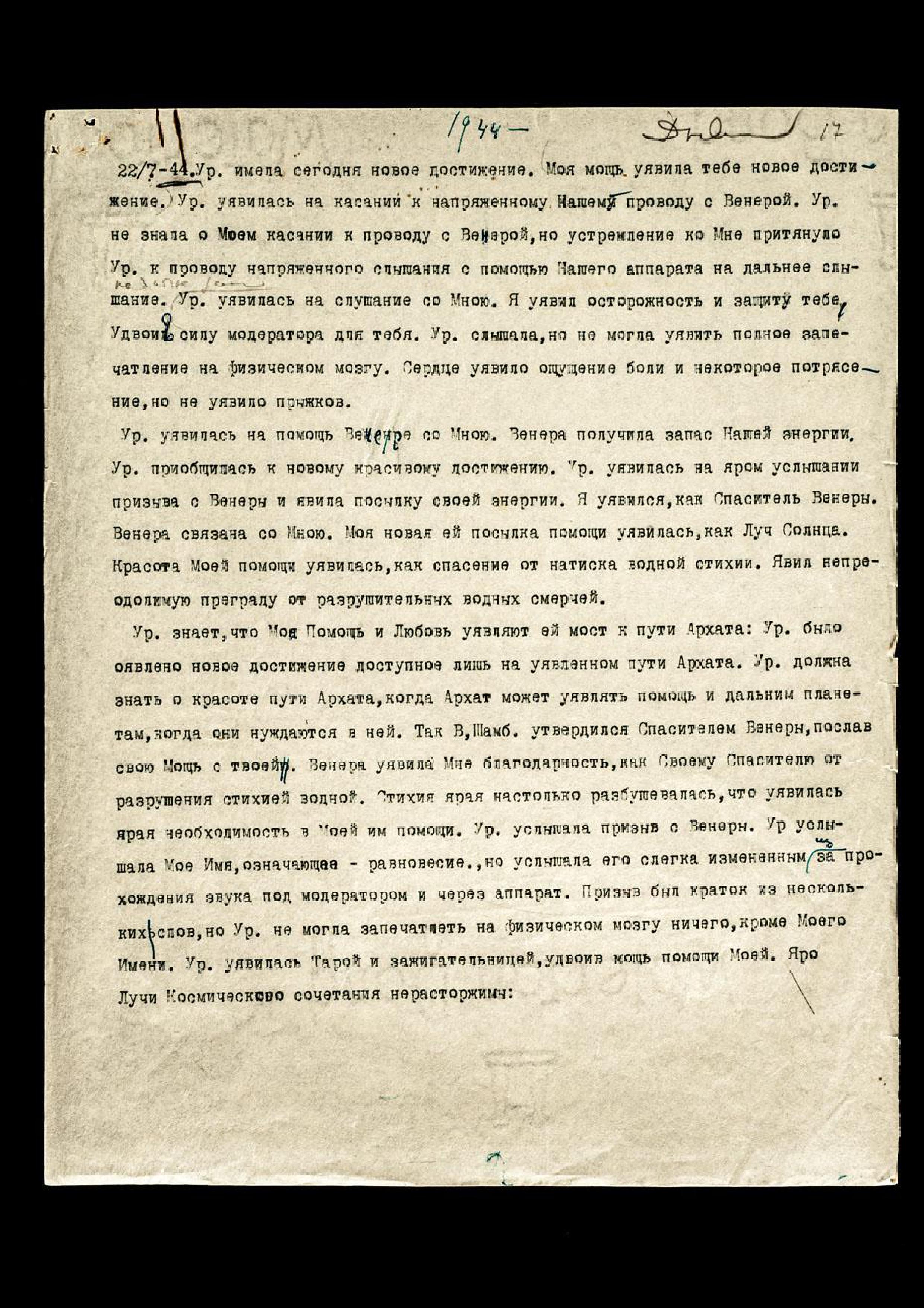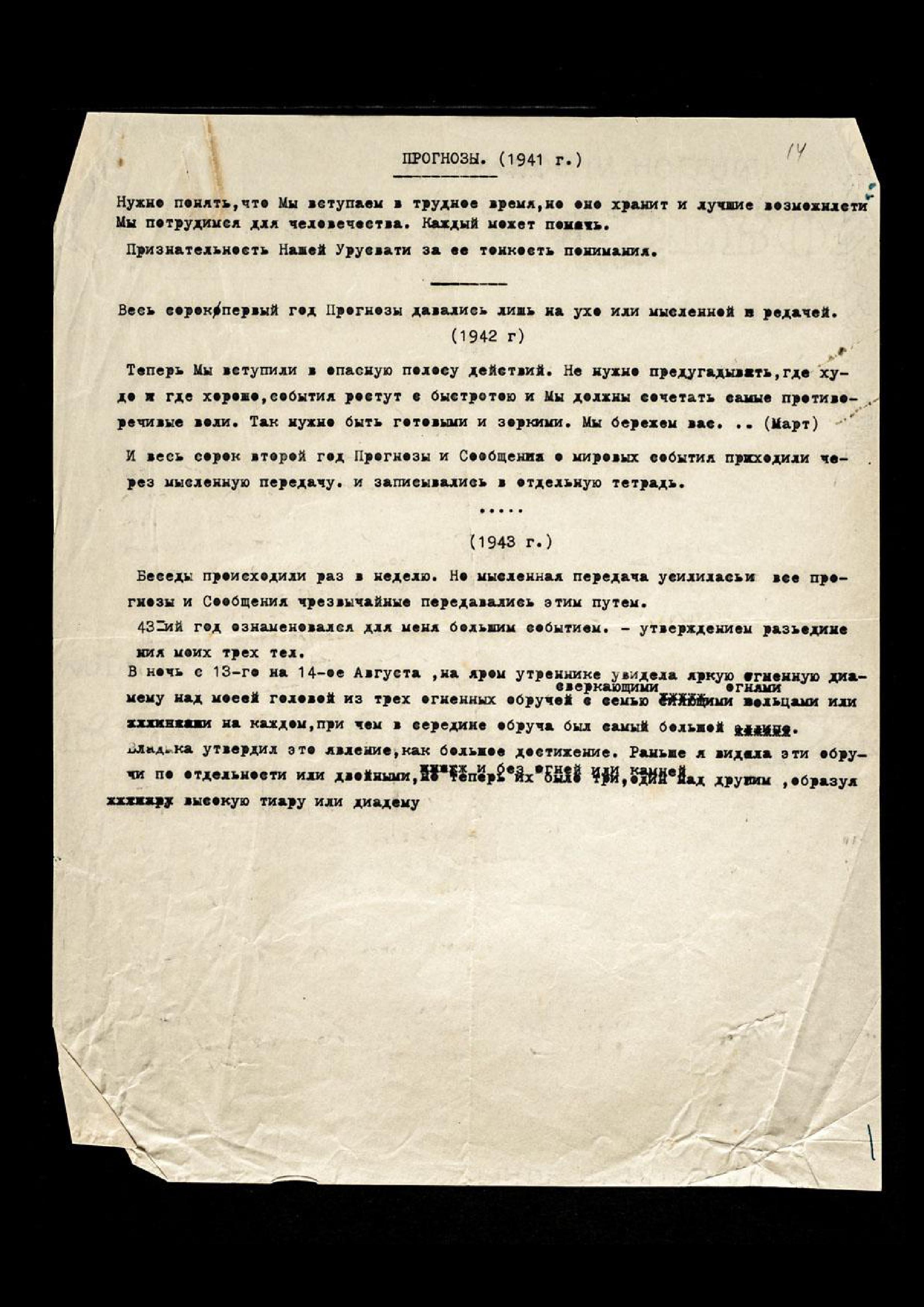 Беседы происходили раз в неделю. Но мысленная передача усилилась, и все прогнозы и Сообщения чрезвычайные передавались этим путём. 43-й год ознаменовался для меня большим событием − утверждением разъединения моих трёх тел.