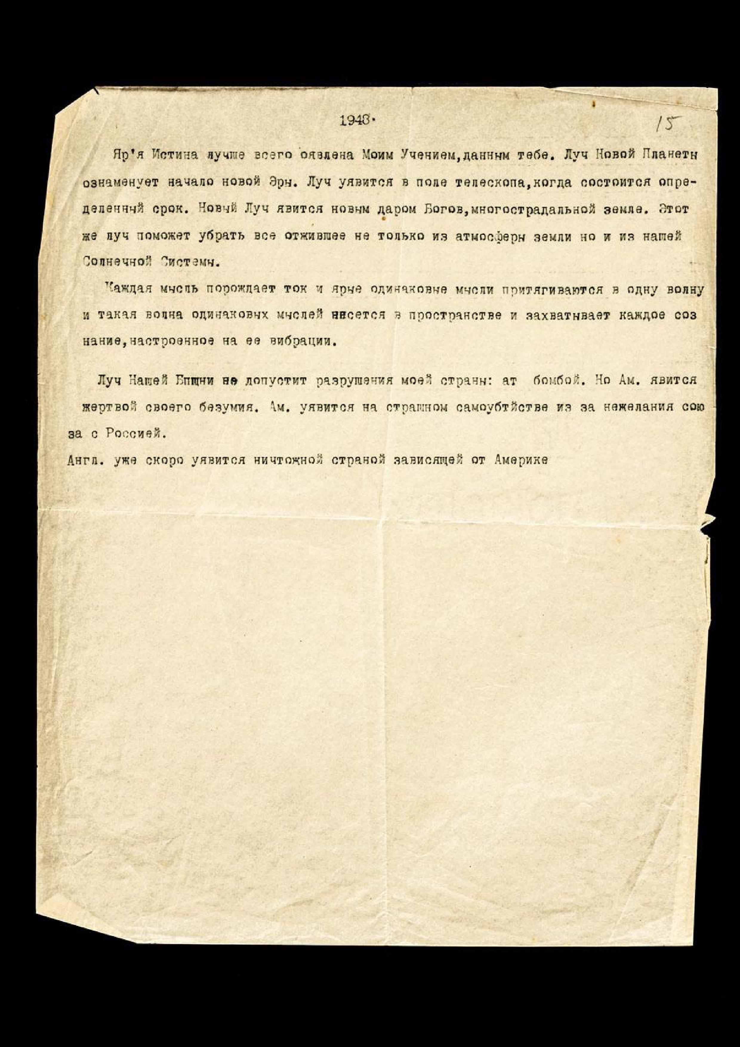 Луч Нашей Башни не допустит разрушения Моей страны ат[омной] бомбой. Но Ам[ерика] явится жертвой своего безумия. Ам[ерика] уявится на страшном самоубийстве из-за нежелания союза с Россией.