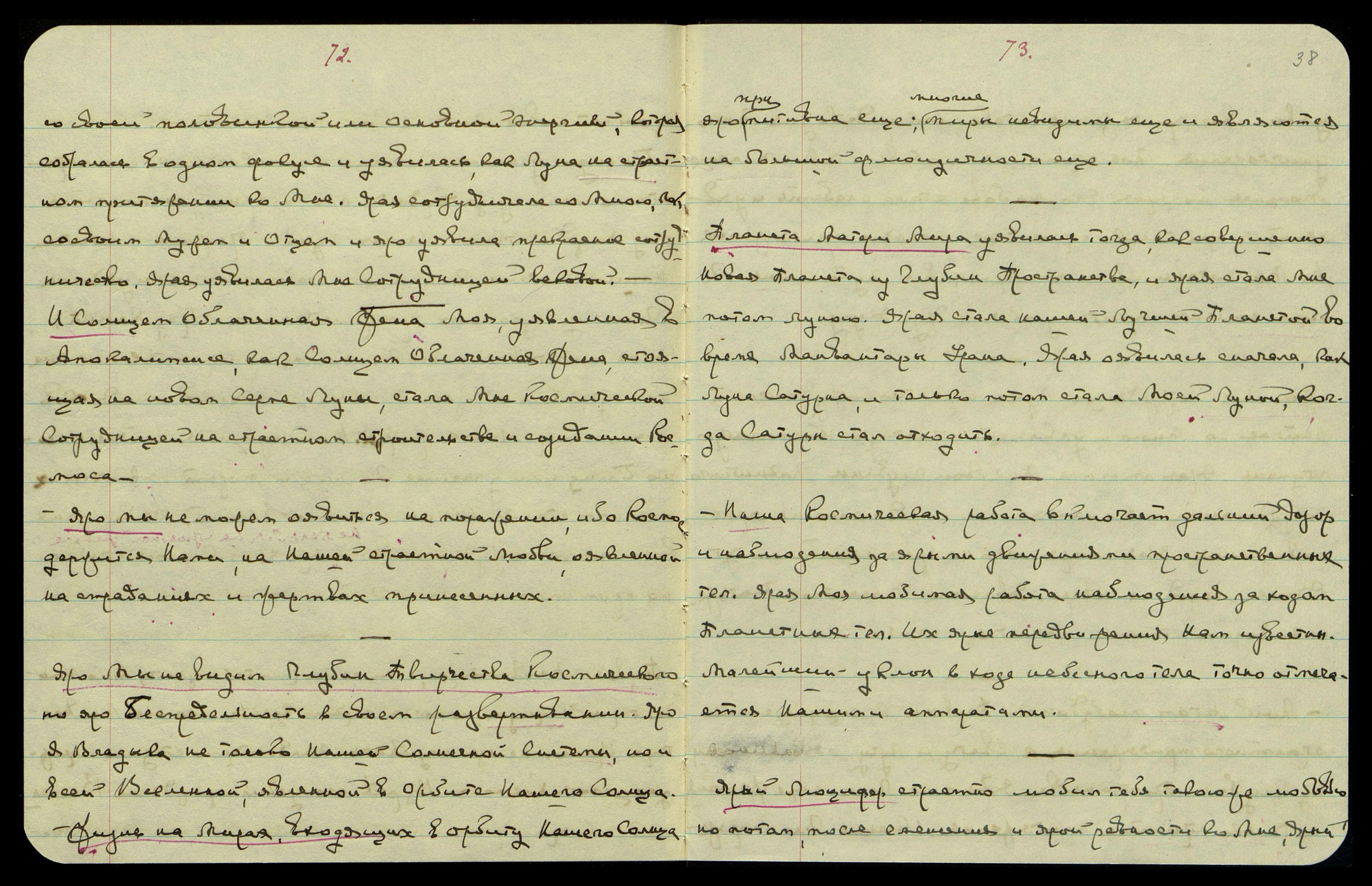 Наш объединенный Луч сокрушил сегодня ночью многое и страстно опасное. Ярый Болид распался на миллиарды осколков, которые оявятся как кора для Нашей Новой Планеты. Планеты, но не Звезды М[атери] Мира, не может, не может еще многое принять без сжигания. Ярая тут как ярое Солнце, оявленное на угасании. Ярая Звезда и есть Солнце. Ярая Звезда М[атери] Мира оявилась на угасании с момента гибели Нашей Лучшей Планеты в прошлую Манвантару Урана и Сатурна. Лучшая Планета уявилась сотрудницей Сатурна. Но Сатурн завладел полностью Планетою во время своей краткой Манвантары, но продлил свою власть и на настоящую Манвантару. Планета уявилась на яром притяжении к нему после Его уявления.