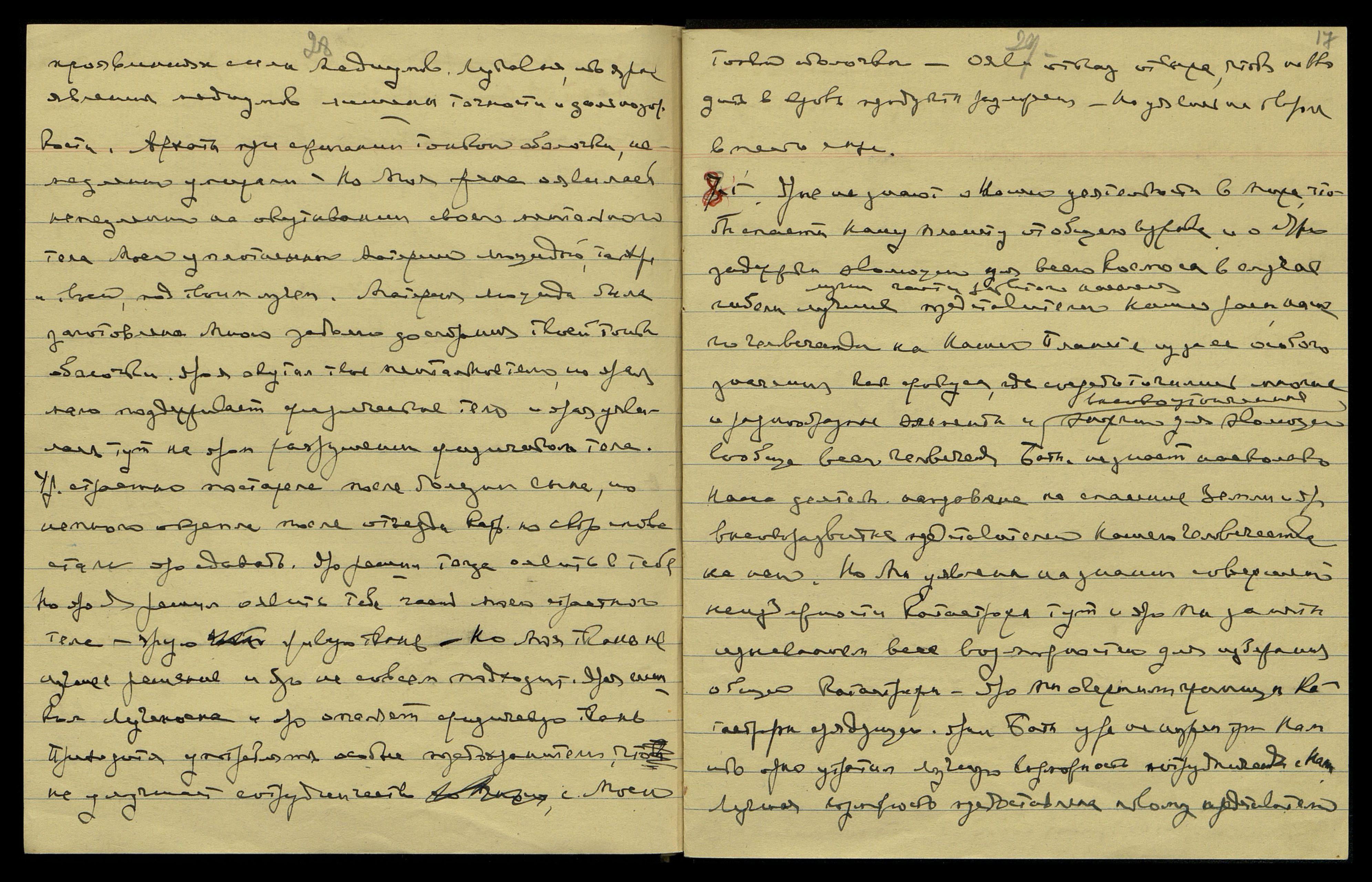 Бр[ат] Ат[риа] ценил ее преданность к нему. Ярая оявляла ему преданность во всем, но не смогла превозмочь страха перед инквизицией и яро отошла от его опытов и от него — ярый остался одиноким стариком. Он был лучшим врачом в Герм[ании], Тироле и в Швейцарии. Ярый старик-врач оявился после Парацельса, снова с нею в Швейцарии. Она видела его во сне.