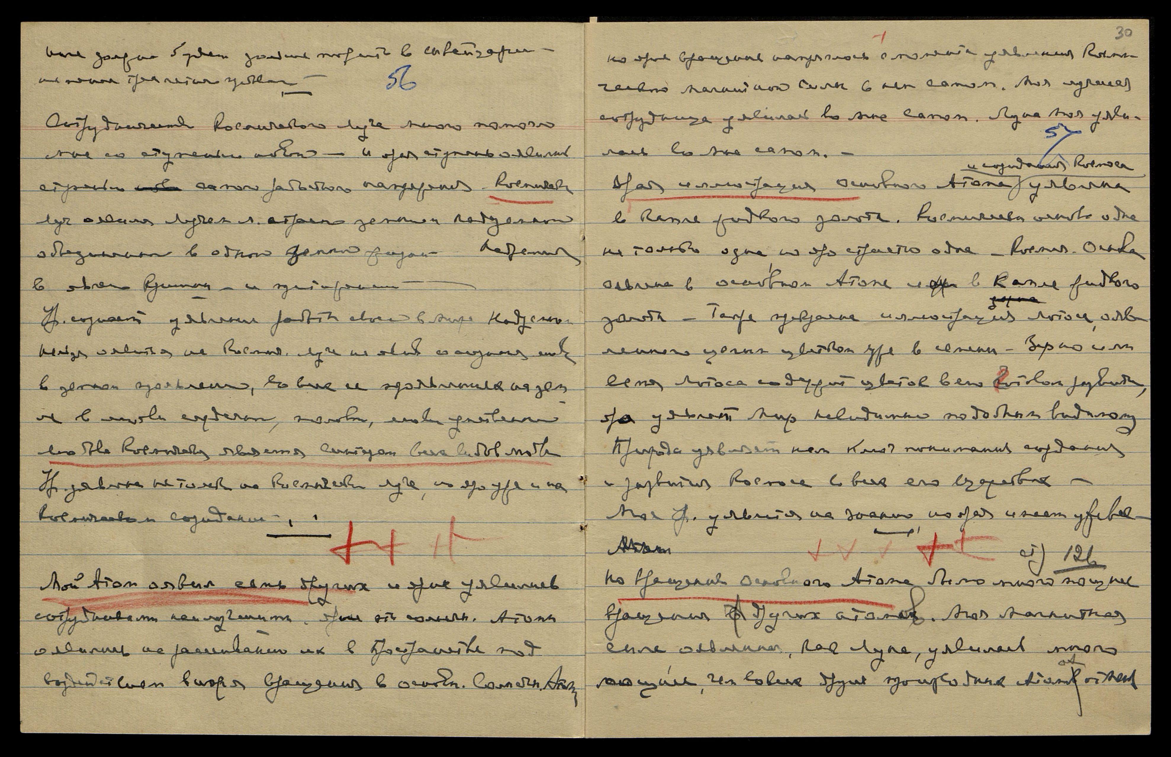 Основной Атом стал собирать новые Атомы (вокруг себя), которые собирались, как новые войска вокруг него, и ярые оявились на борьбе между собою из-за ярого им места. Но ярые оявились остановленными его силою центробежной, кот[орая] уявляла их на пределе заградительной сети его лучей, или ауры, и тем ограждала ядро сущности его. Но ярая сущность его была едина со всеми остальными атомами, кот[орые] продолжали делиться и множиться на ярых столкновениях и новых сочетаниях.