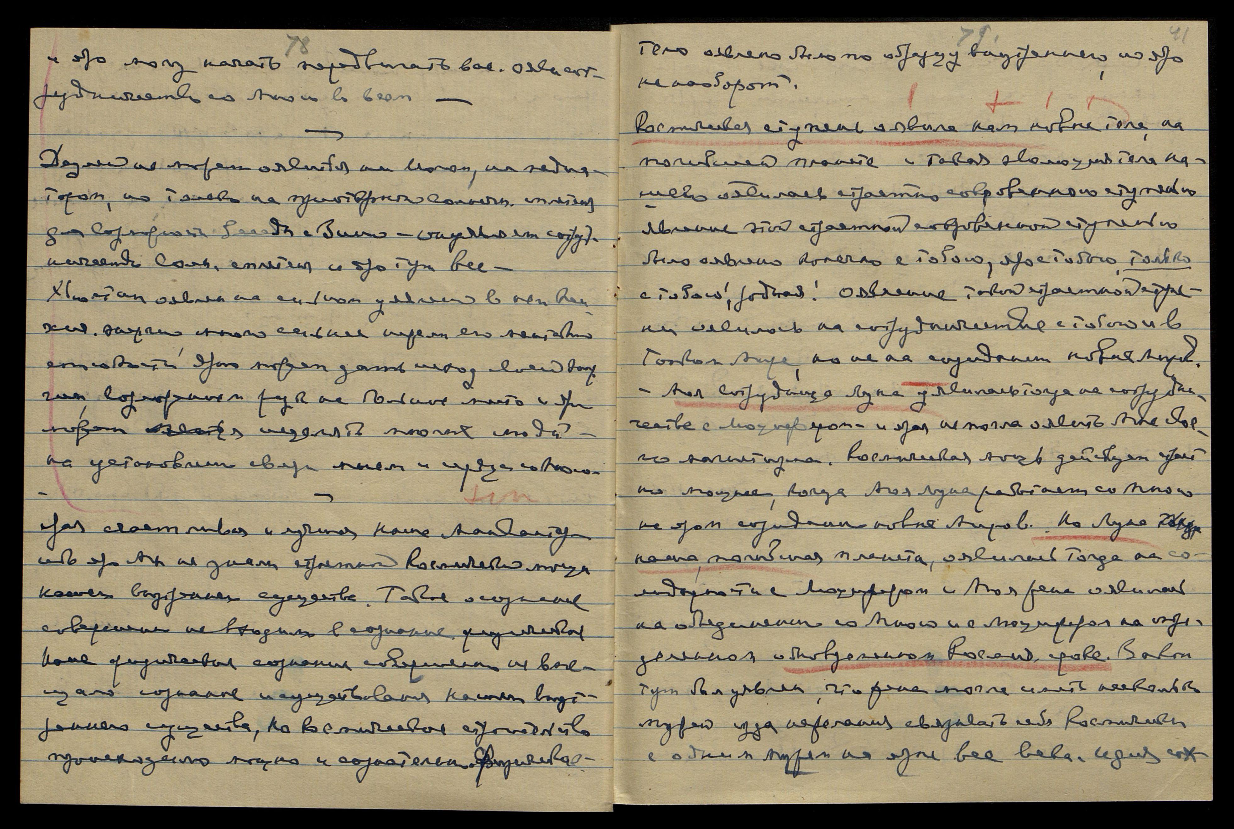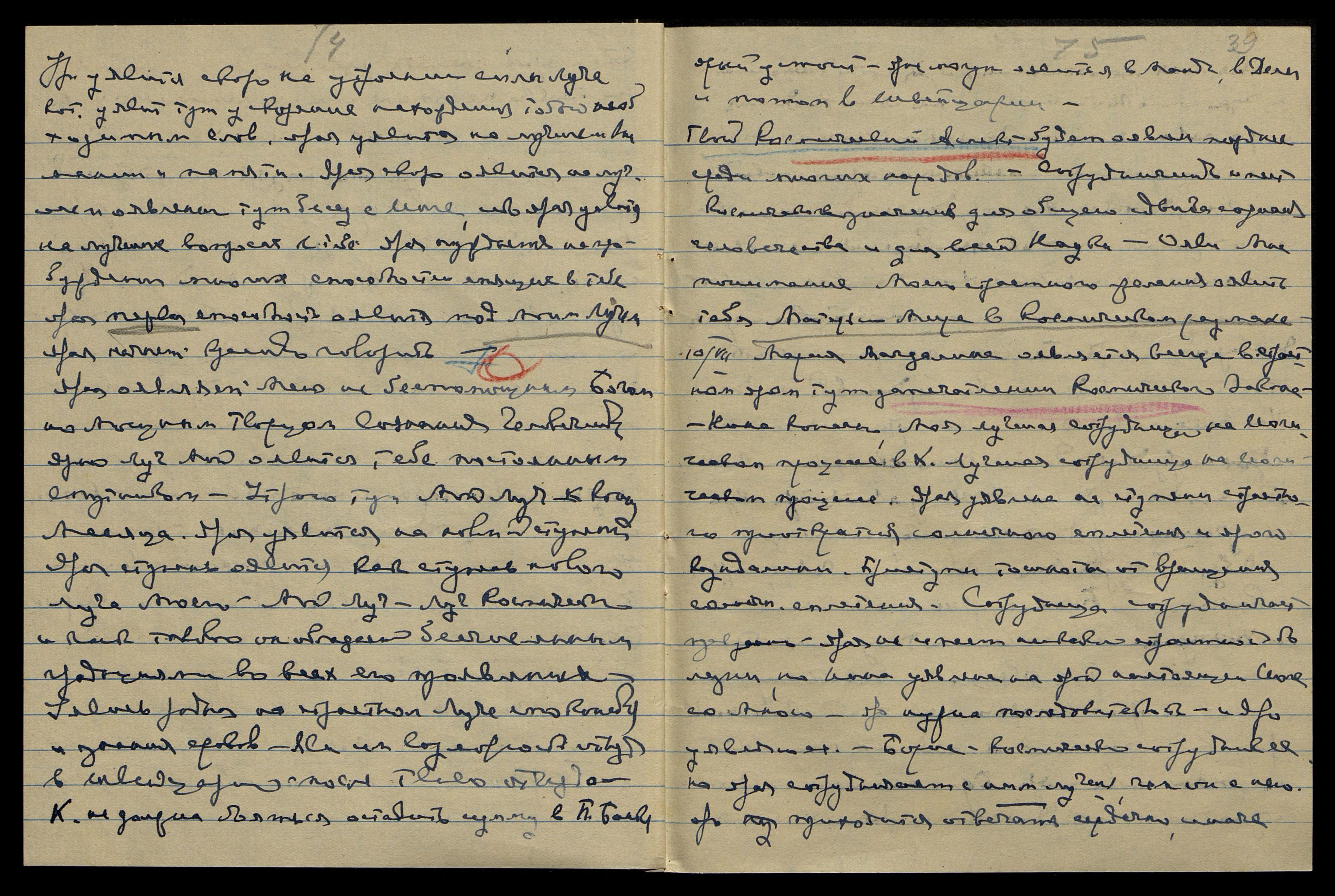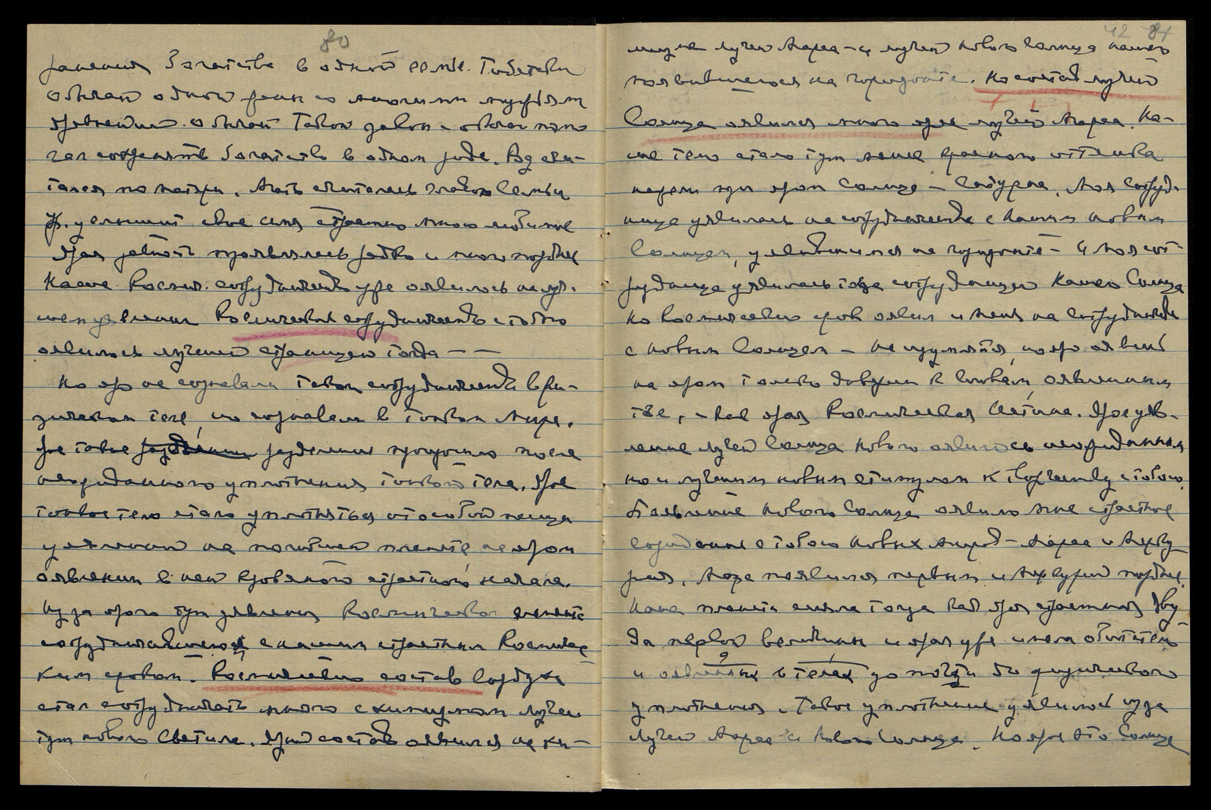 Клизму каждый день со щепоткой соли на стакан воды и яро один крохотный кристаллик марг[анцевого] калия на стакан — вода розовая, но отнюдь не красная. Лук с маслом утром. Три кофейные чашки имбирного чаю — в течении трех недель. Скажи им тут о их космич[еской] близости, и ярые живут исключительную жизнь и на страстном уявлении одного Учителя [слово "Учителя" зачеркнуто карандашом]. Скорое событие оявится на яром отклике и там. Явление космич[еской] близости им оявится страстной радостью.