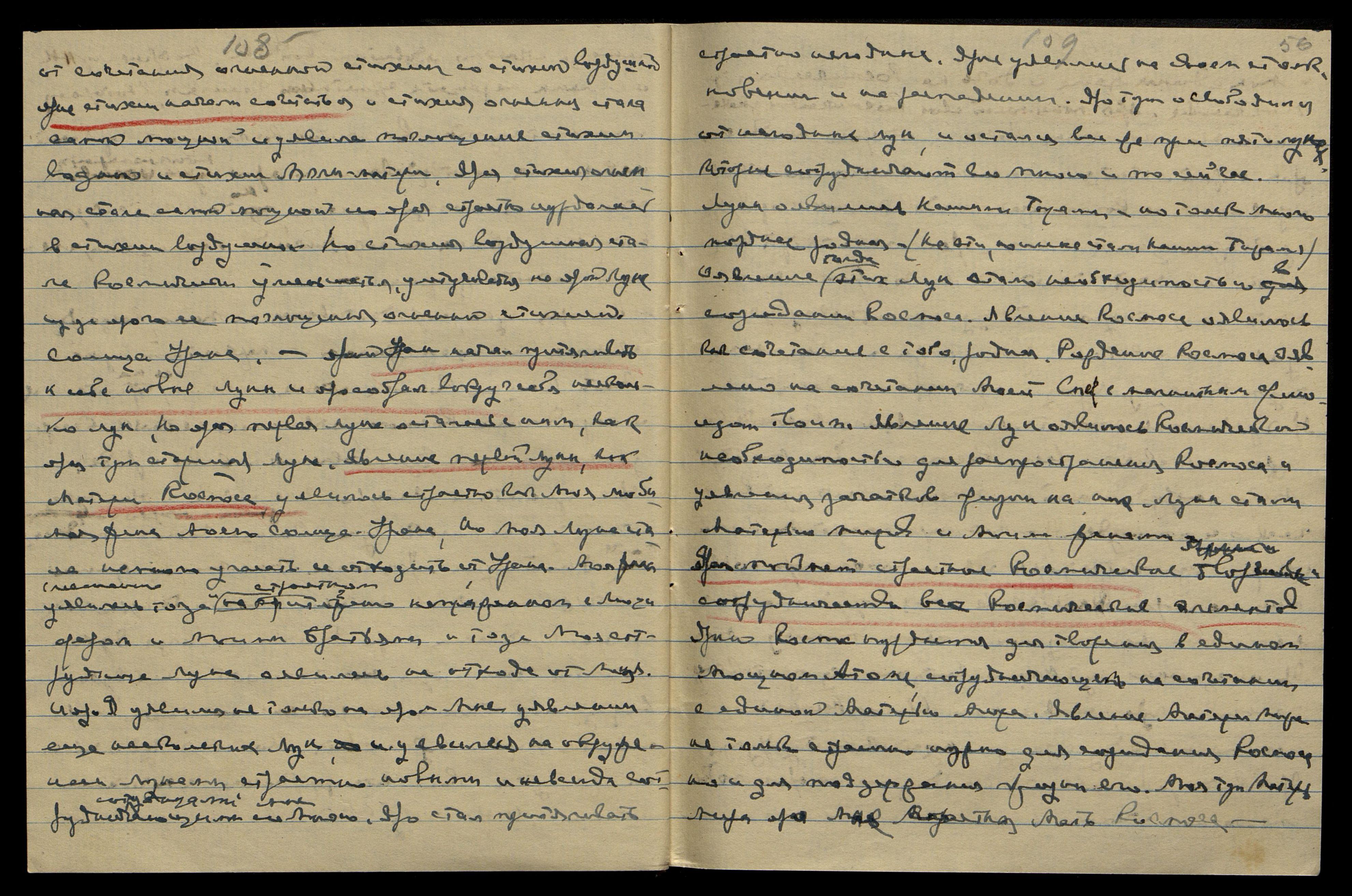 Яро оявись на понимании уявления тебе Новой Космогонии и яро оявись на луче страстного внимания. Оявись, как сотрудница моя тогда на лучшем периоде, когда жена Моя уявилась как луна при солнце Уране. Луна уявилась носительницей страстного магнетизма, оявленного в Моей жене. Ярая уявилась на зарождении страстной Луны. Ярые луны не всегда угасшие солнца. Но яро являются как особые пространственные тела, уявленные на страстном [сверху строки — "притяжении"] магнетизме и на сотрудничестве Космическом с Солнцами. Ярое Солнце сотрудничает с Лунами и прочими пространственными образованиями, с большими и малыми конгломератами страстных газов и с кометами, но ярые бывают поглощены тут солнцами большего размера и конгломератами газов, уявленных иногда страстно ядовитого свойства. Но ярые луны оявлены на защите страстным солнцем, к которому они притянуты. Космические конгломераты газов иногда оявляются на отвердевании, и ярые конгломераты становятся иногда лунами, но только те луны, которые оявлены на сотрудничестве с солнцами, имеют зачатки жизни.