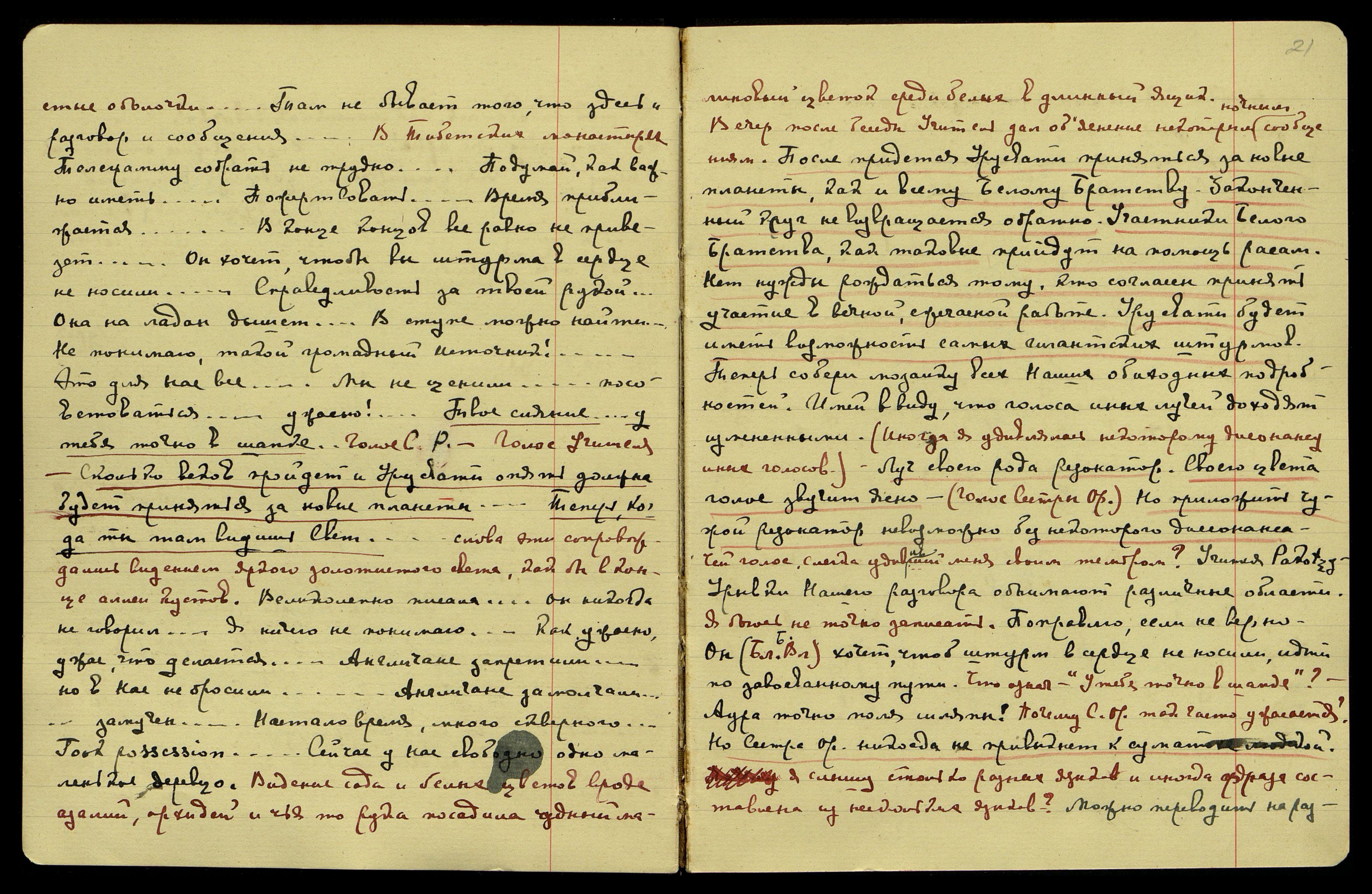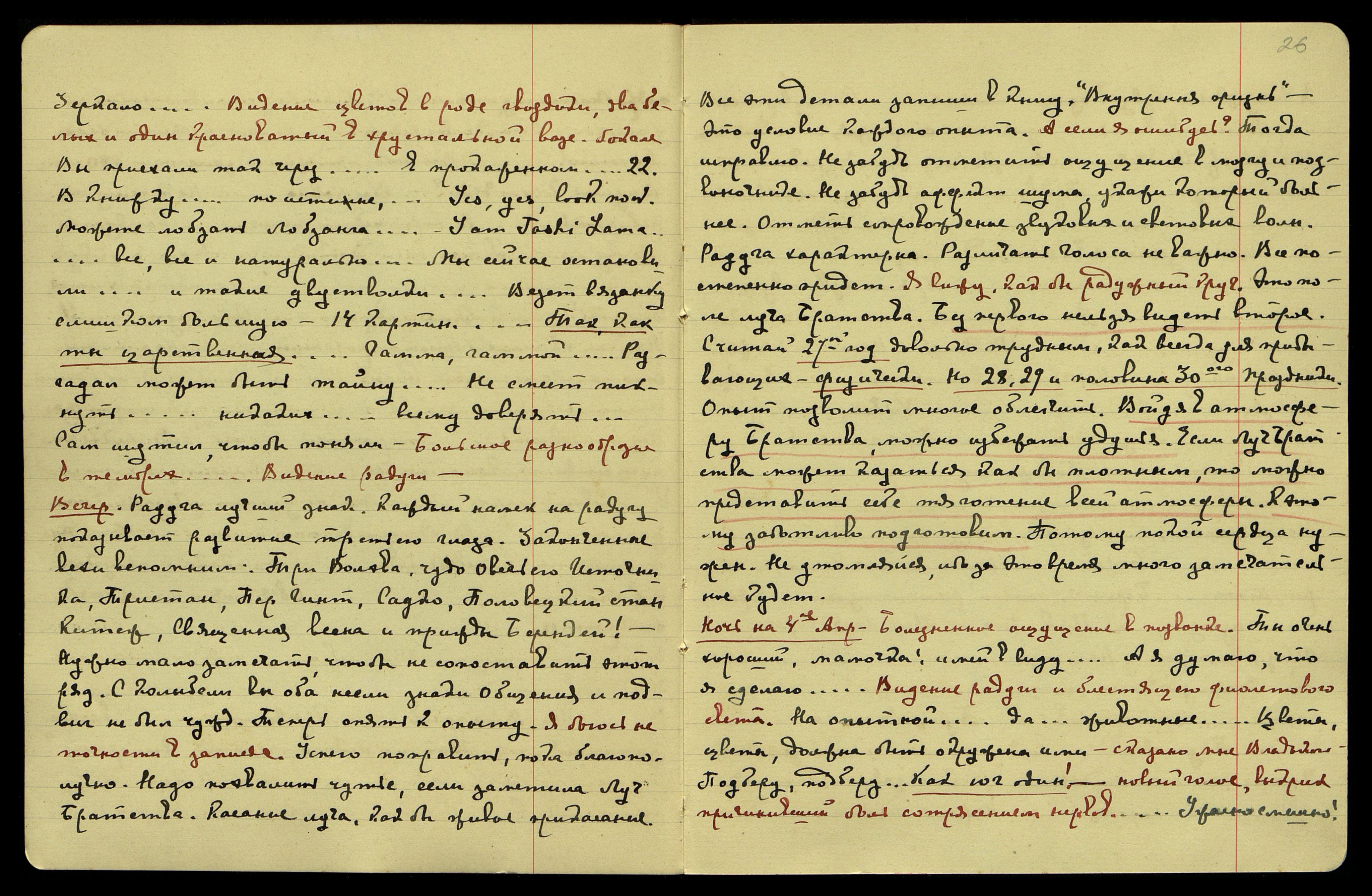 оболочки. "Там не бывает того, что здесь − и разговор, и сообщения..." В Тибетских монастырях. "Телеграмму собрать не трудно... Подумай, как важно иметь...Пожертвовать... Время приближается... В конце концов, все равно не привезет... Он хочет, чтобы вы штурма в сердце не носили... Справедливость за твоей рукой... Она на ладан дышит... В ступе можно найти... Не понимаю, такой громадный Источник! Это для нас все... Мы не ценили... посоветоваться... ужасно!...Твое сияние... у тебя точно в шапке..." Голос С.Р. − Голос Учителя: "Сколько веков пройдет, и Урусвати опять должна будет приняться за новые планеты... Теперь, когда ты там видишь Свет..." Слова эти сопровождались видением яркого золотистого света как бы в конце аллеи кустов. "Великолепно писала... Он никогда не говорил... Я ничего не понимаю... Как ужасно, ужас, что делается... Англичане запретили... но в Нас не бросили... Англичане замолчали... замучен... Настало время, много скверного...Took possession [англ.: вступил во владение]... Сейчас у нас свободно одно маленькое деревцо". Видение сада и белых цветов вроде азалий, орхидей, и чья-то рука посадила чудный малиновый цветок среди белых в длинный ящик.