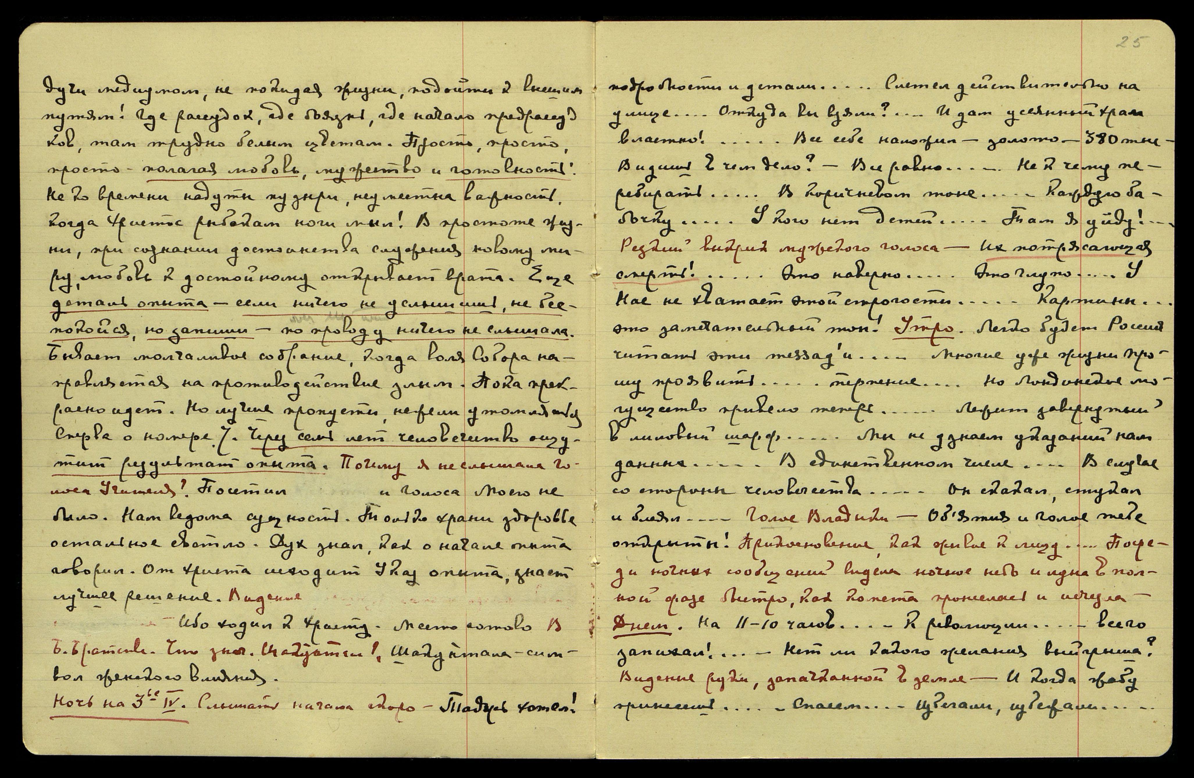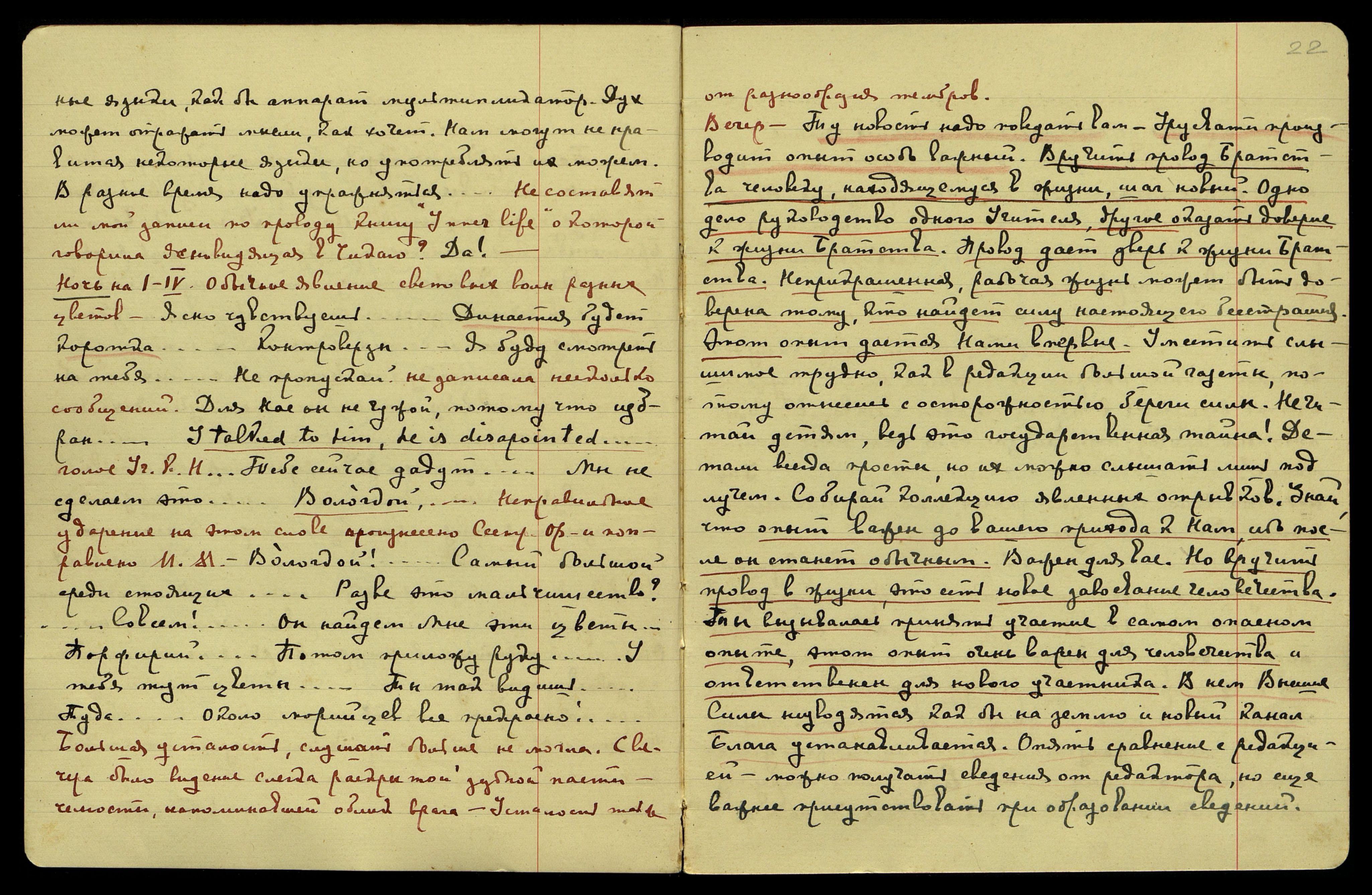 Утро. "Легко будет Россия читать эти message'и [англ.: сообщение]... Многие уже жизни прошу проявить... терпение... Но лондонское могущество привело теперь... Лежит завёрнутый в лиловый шарф... Мы не узнаем указаний, нам данных... В единственном числе... В случае со стороны человечества... Он скакал, стукал и блеял..." Голос Владыки: "Объятия и голос тебе открыты!" Прикосновение, как живое, к лицу... Посреди ночных сообщений видела ночное небо, и луна в полной фазе быстро, как комета, пронеслась и исчезла.