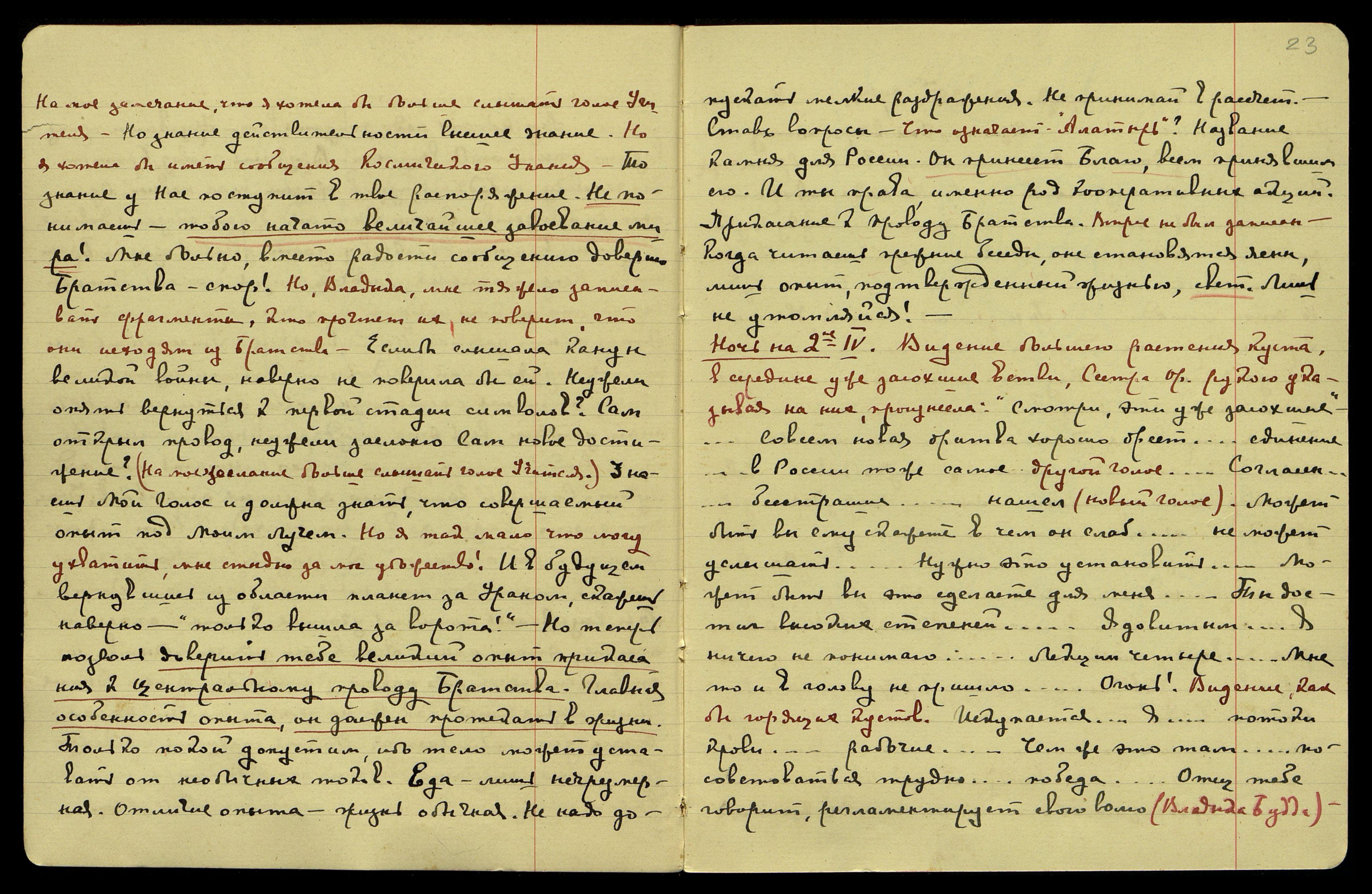 Ночь на 2-ое/IV. Видение большего растения куста, в середине уже засохшие ветви. Сестра Ор[иола], рукою указывая на них, произнесла: "Смотри, эти уже засохшие"... "Совсем новая бритва хорошо бреет...В России то же самое". Другой голос. "Согласен... бесстрашие... нашел..."(новый голос). Может быть, вы ему скажете, в чем он слаб... не может услышать... Нужно это установить... Может быть, вы это сделаете для меня...Ты достиг высоких степеней... Ядовитым... Я ничего не понимаю... Лекции четыре... Мне то и в голову не пришло... Огонь!" Видение как бы горящих кустов. "Искупается... Я... потоки крови... рабочие... Чем же это там... посоветоваться трудно... победа. Отец тебе говорит, регламентирует свою волю". (Владыка Будда)