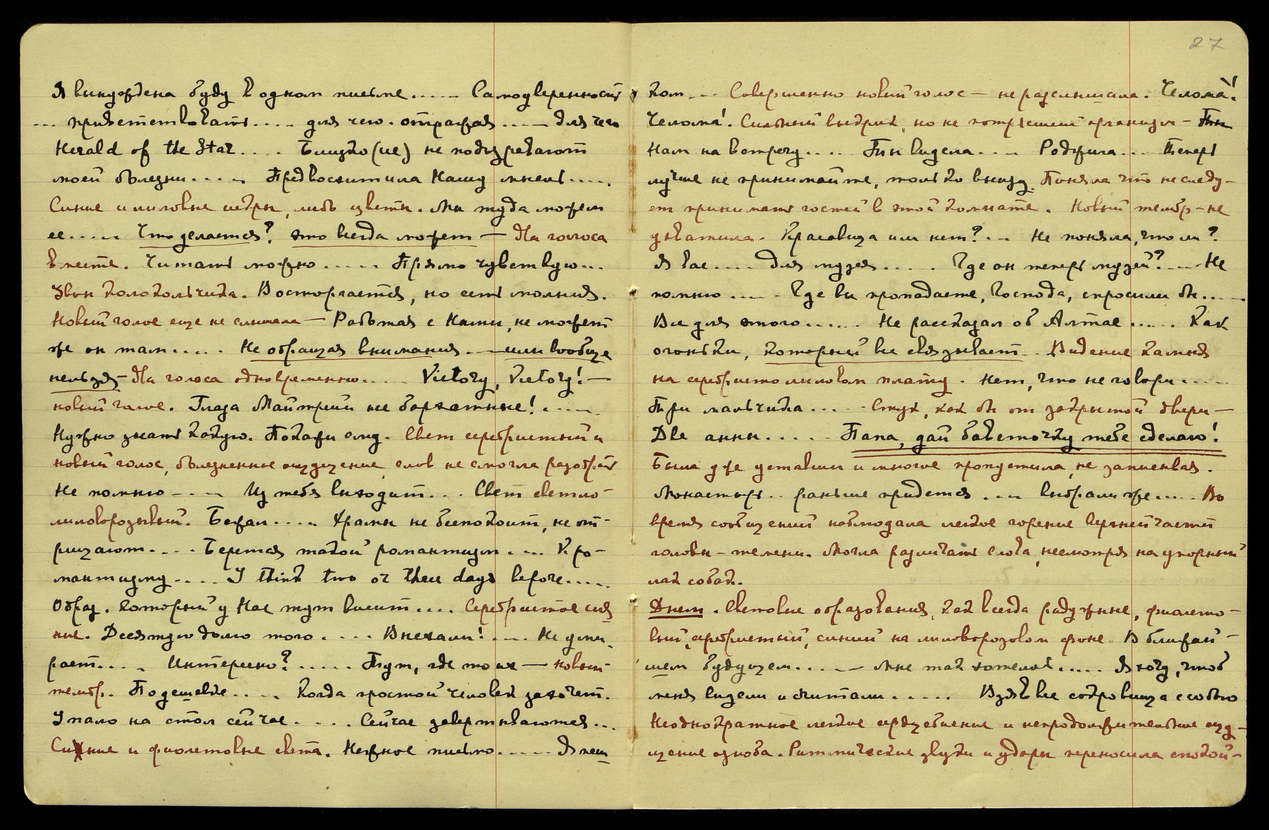 Ночью на 3-ье/IV. Слышать начала скоро. "Тад[окончание слова неразборчиво] хотел! Подробности и детали... Слетел действительно на улице... Откуда вы взяли?.. И дам усеянный храм властно!.. Всё себе наложил − золото − 380 тыс[яч]. Видишь в чём дело? Всё равно... Не к чему перебирать... В коричневом тоне... Каждую бабочку... У кого нет детей... Там Я уйду!.." Резкий выкрик мужского голоса: "Их потрясающая смерть!"... "Это наверно... Это глупо... У Нас не хватает этой строгости... Картины... это замечательный тон!"