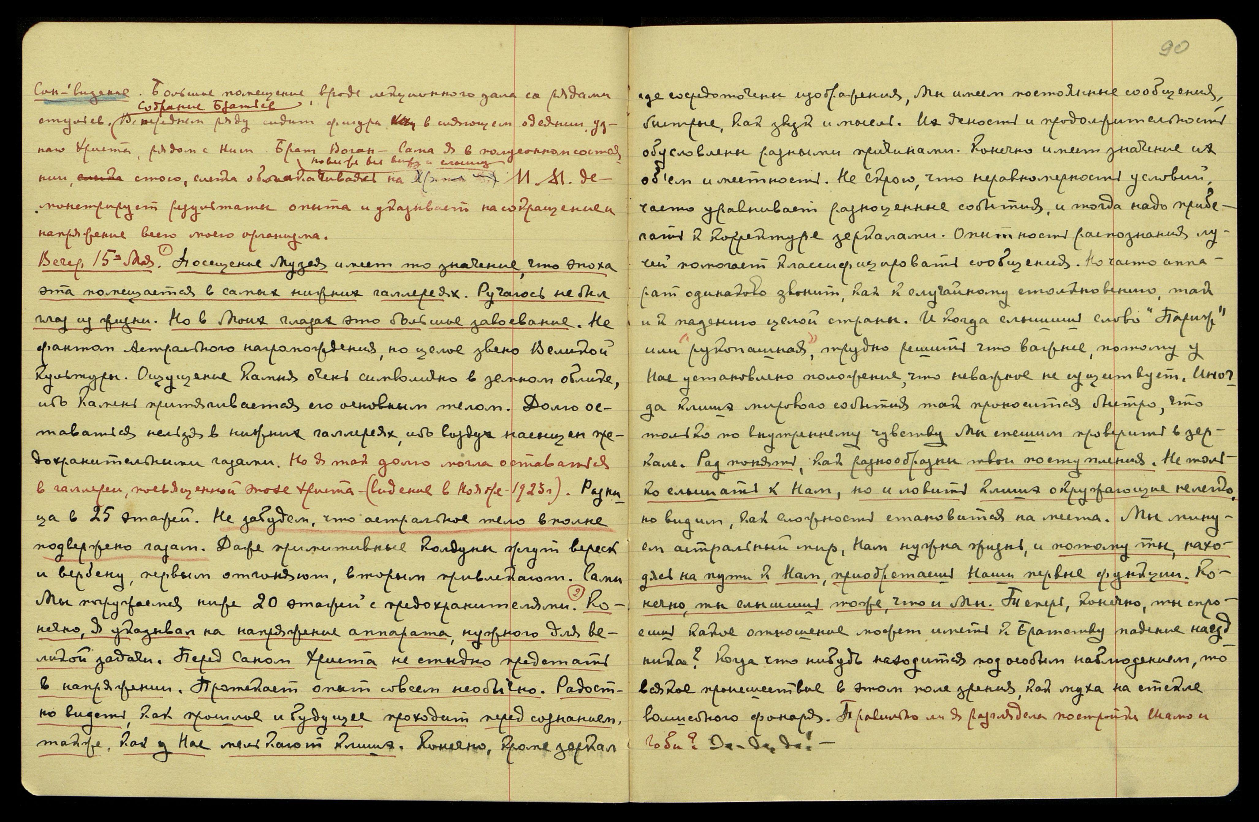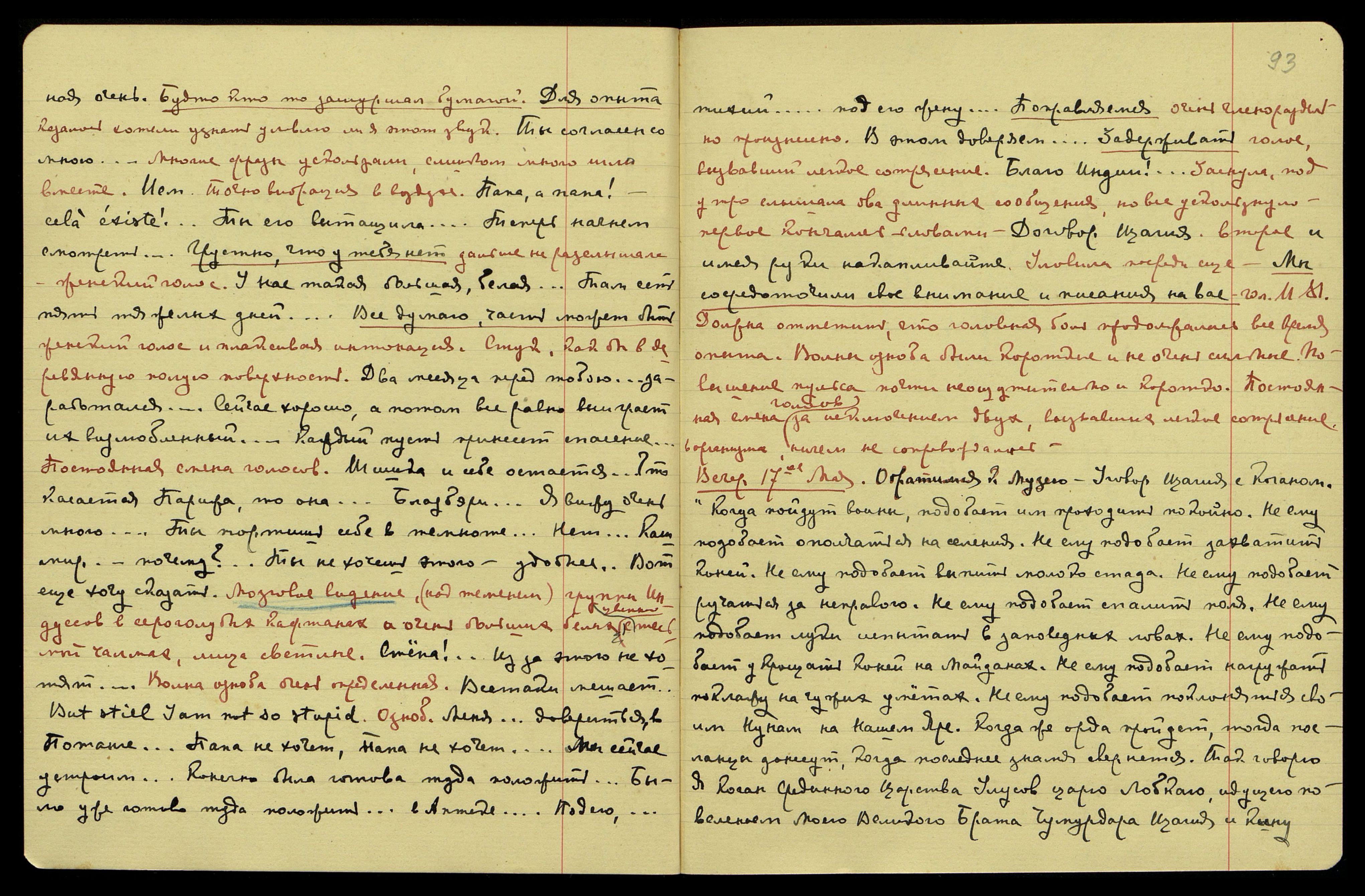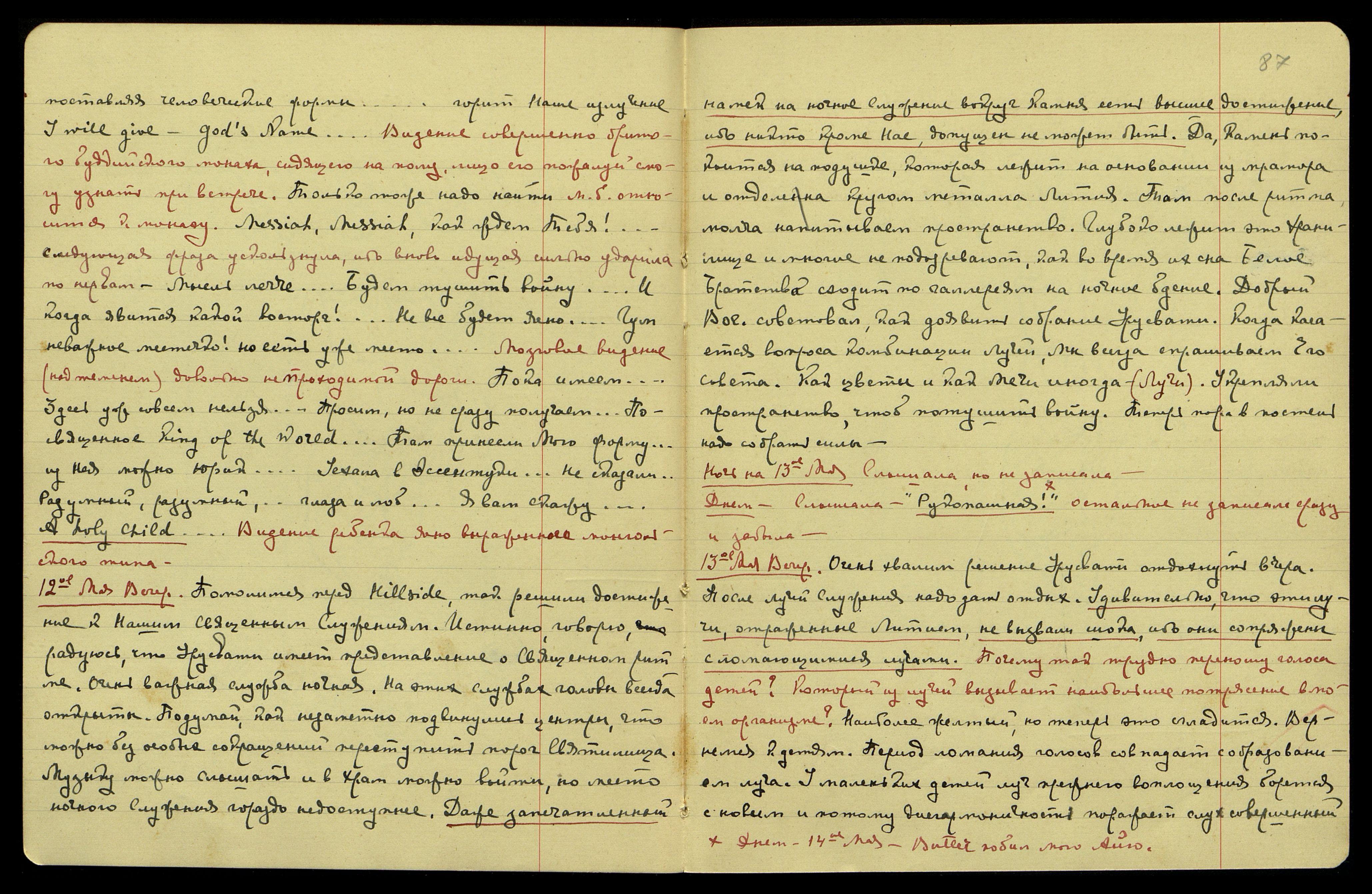 Ночь на 17-ое мая. Легла в покое после длинной беседы с М[ахатмой] М[орией], но с головной болью, которая начиналась в темени, переходя на правую сторону головы. Волна ярких светов: синие, серебряные, фиолетовые, пурпуровые, рубиновые, иногда жёлтые и зелёные. Очень скоро начал слышать. "Вероятно, так и есть... слегка... Никто не пострадал... Ищет случая... Сто!" − выкрик, но ни малейшего сотрясения. "Неоконченную... Даже не могу возразить". Озноб. Пиши: "Опыт мой непередаваем, но можно...", − казалось, относилось ко мне. "Нет разницы... ничего не оставить", − тембр мужского голоса, довольно высокого. "Играть хочу... Потому, что леопарды немножко... Наши хотели его вообще лишить... Jery"... "repetez", − очень определённо и резко сказано. "Это было жалкое начало..." Лёгкая боль в правой руке и голове. "Ужасное подозрение на Йогу падает на... Мне ужасно хочется..." Боль в темени, ближе к правой стороне, и в руке. "Я тоже думаю увеличить. Вот это названное, дети!.. Нет, серьёзная картинка будет... Мне самому нравится"... "Article... Argile [франц.: Статья... Глина]", − ясный французский выговор. "Ах, ах, нехорошо это!.. Ясность... которая... благополучно... может быть это и есть..." Лёгкое повышение пульса. "Разрастается красками, принимает после меня". Боль в голове и правой руке продолжалась. "Позолотить", − странный голос. Довольно сильная боль за правым ухом. "He gave me [англ.: Он дал мне]... Сейчас им объяснять будем... Уру!.." Треск у моего кресла. "Великолепно... На глазах спящих... Продолжают ещё между собою веру... Передавая Нам эти объяснения... Что они передают?.. Отберем все... Совершенно вдребезги!.. Так-то оно так... Что ещё?! ... Потом чувство, что он вспыхивает... Составляет часть Нашего обихода... Выгнали... вот это... Мамочка!.. Конечно, я была бы... Конечно, если бы... разговор поразительный!.. Все эти скачки, теперь так устала... Когда Америка... нет, постой!.. В некоторых местах галерей распускают тёмных... Тебя не спрашиваем, потому что это, как горох об стену долбить... Это здоровая... Эта не такая... болезнен-