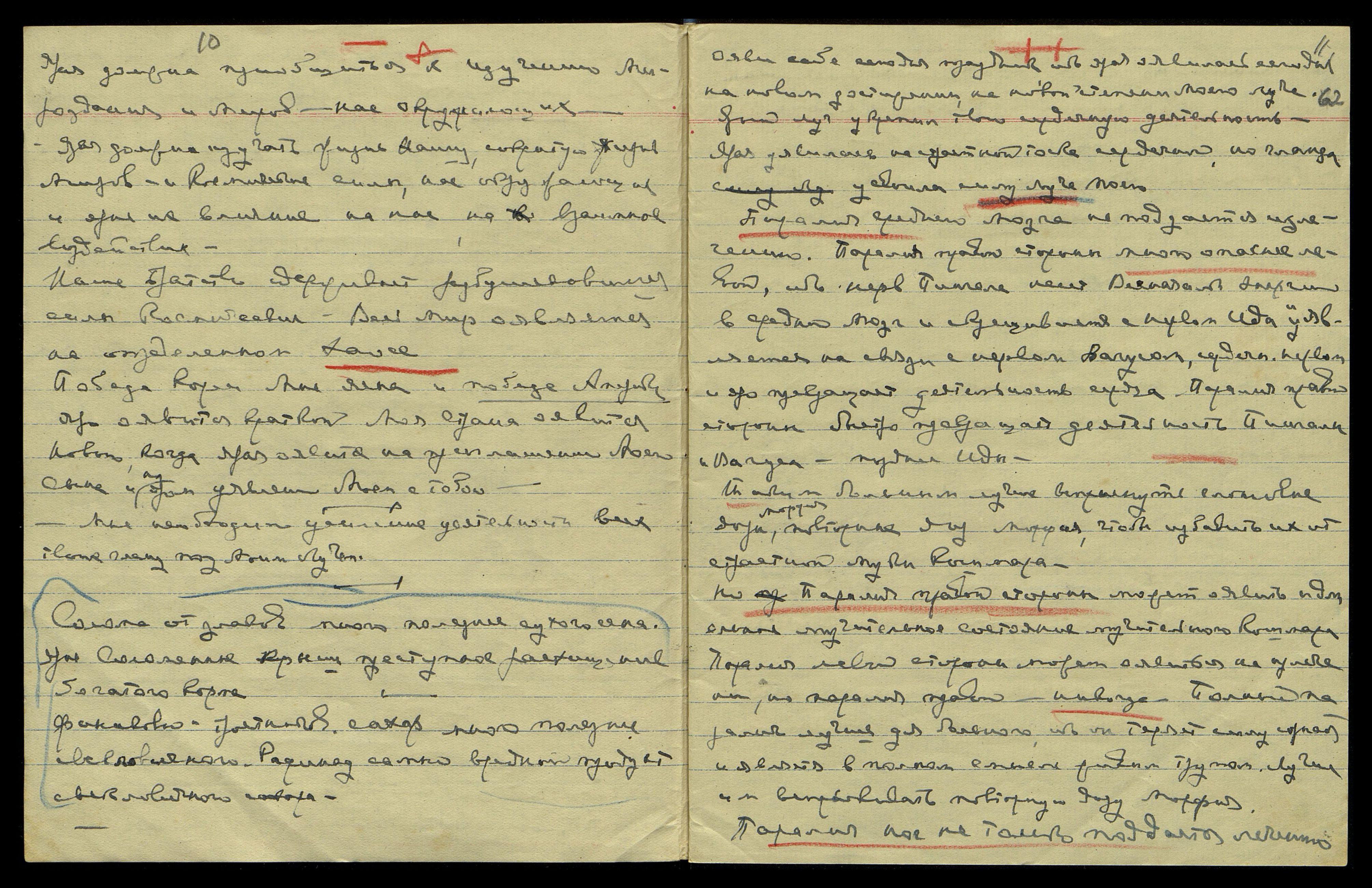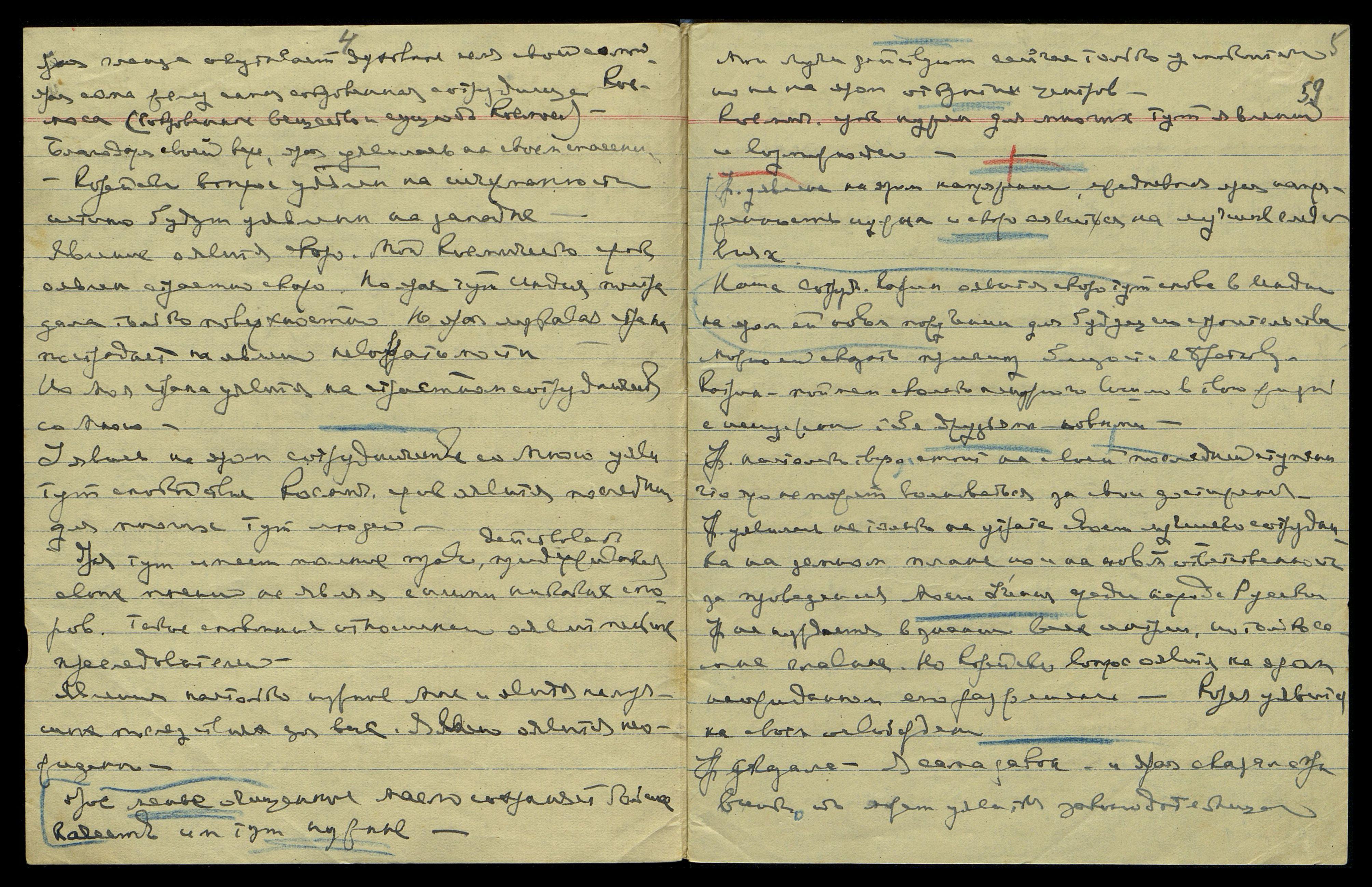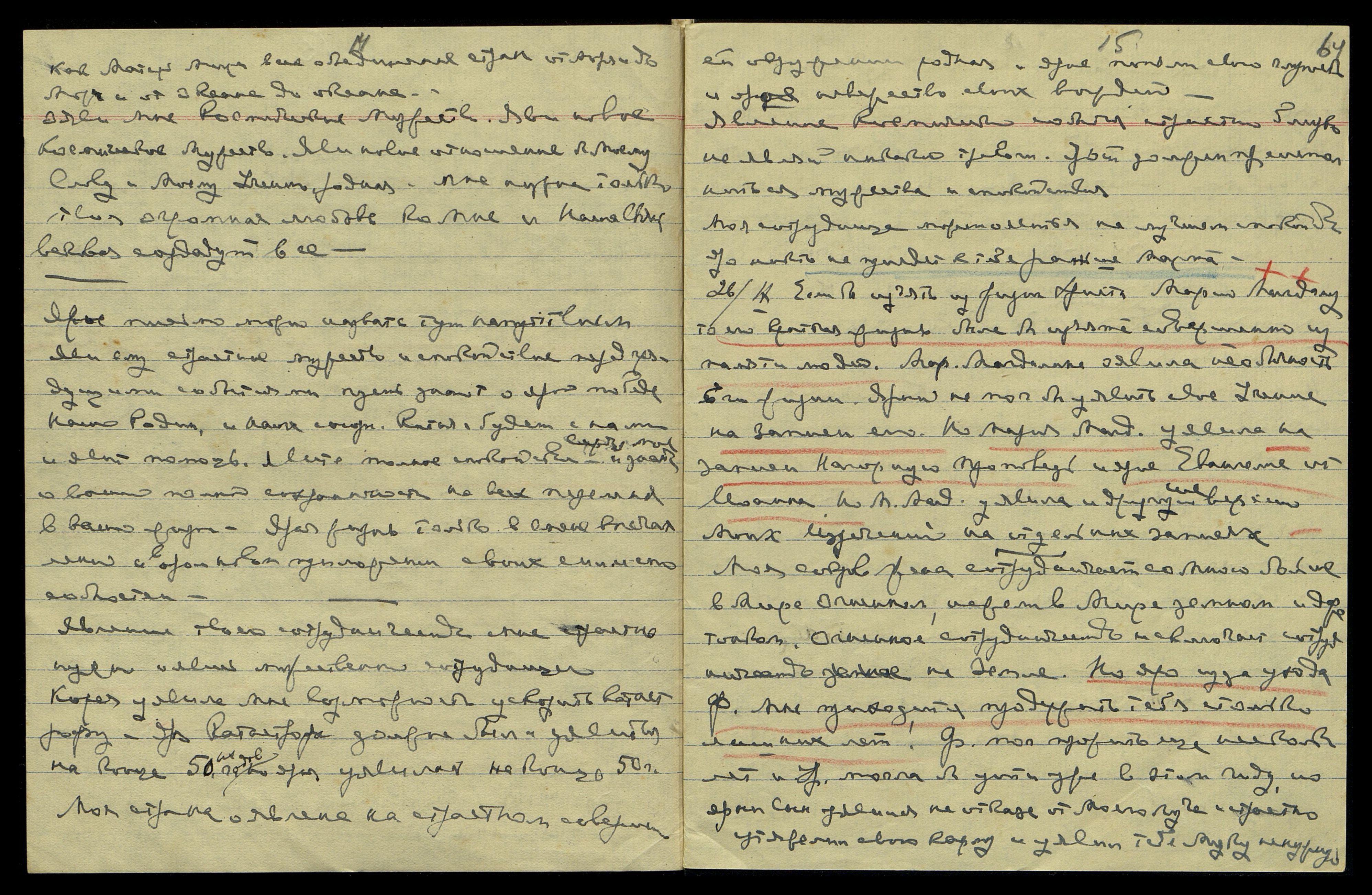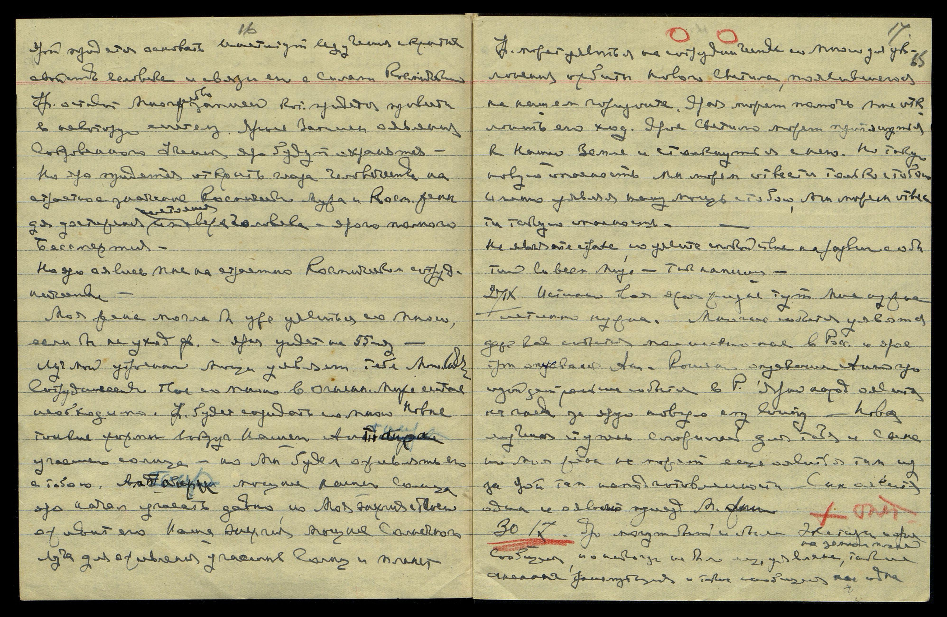 Ярое письмо можно назвать тут напутствием. Яви ему страстное мужество и спокойствие перед грядущими событиями. Пусть знают о ярой победе Нашей Родины и Наш[его] союзн[ика] Китая — будет с нами и явит помощь. Явите полное спокойствие [сверху строки — "Сердце мое"] и знайте о вашей полной сохранности на всех переменах в вашей жизни. Ярая жизнь только в смене впечатлений и в яром новом приложении своих сил и способностей.