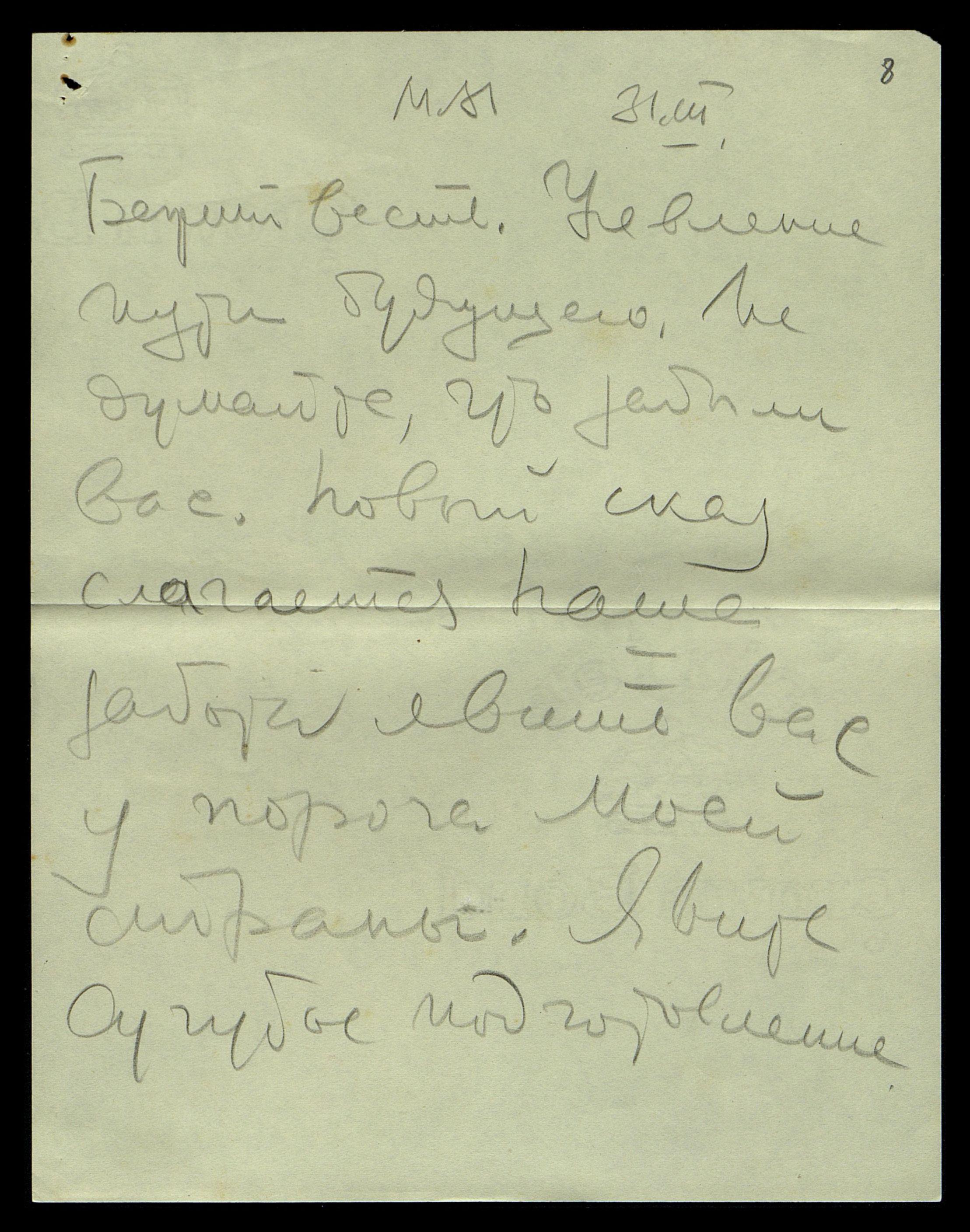Вас удивляет медлительность Гандока. Выжидают исхода переговоров с Индией. Но скоро наметятся новые знаки, и Ваше дело получит решение. Мы не боимся воя в Азии. Иначе не сложить новую страну.