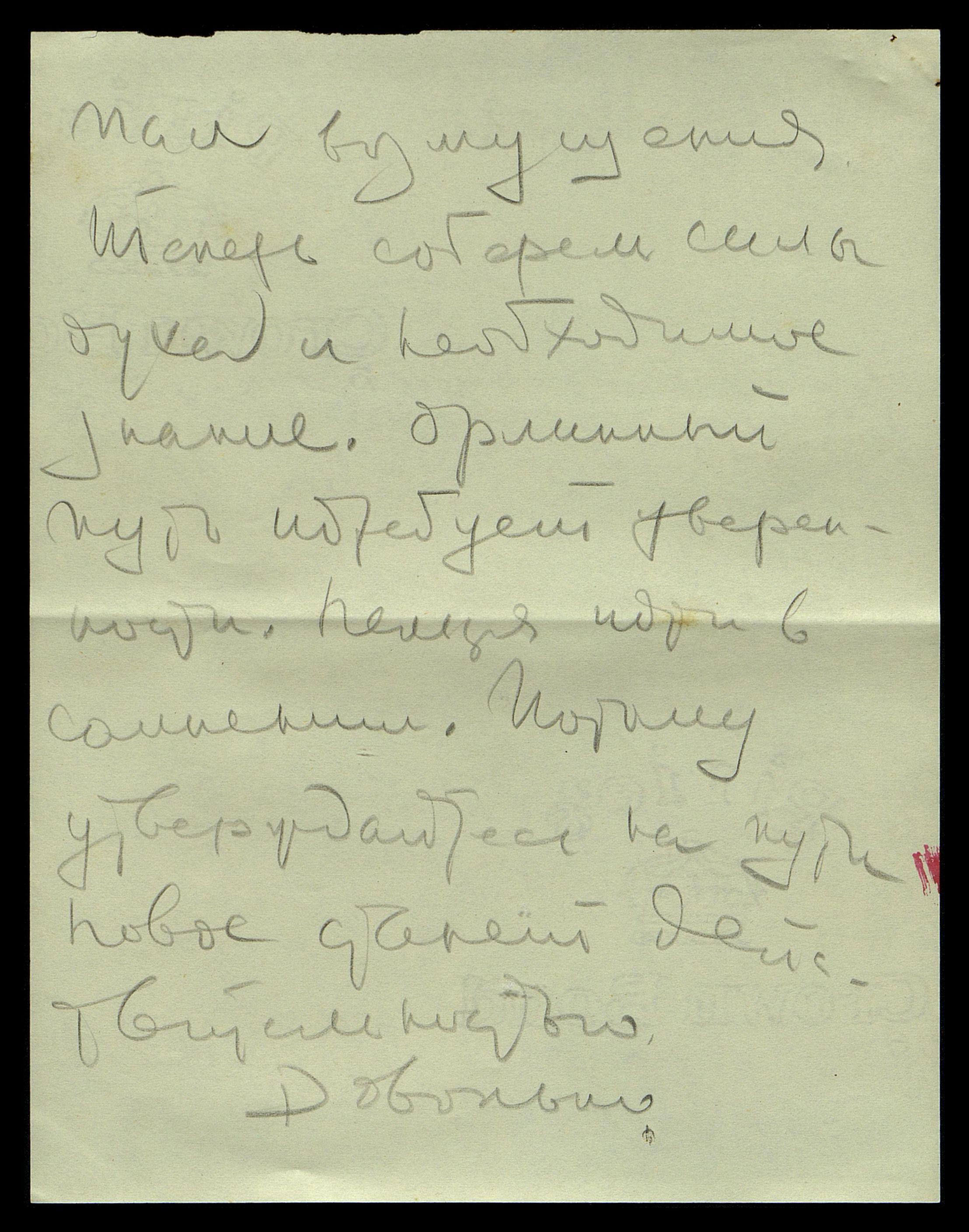 явление новых подвигов. Мы несем явленную весть. Немногие прозревали узор будущего. Соберут крупицы явленного пути. Все слова получат значение. Но крепите сил[ы]. Много трудов положите на пути.