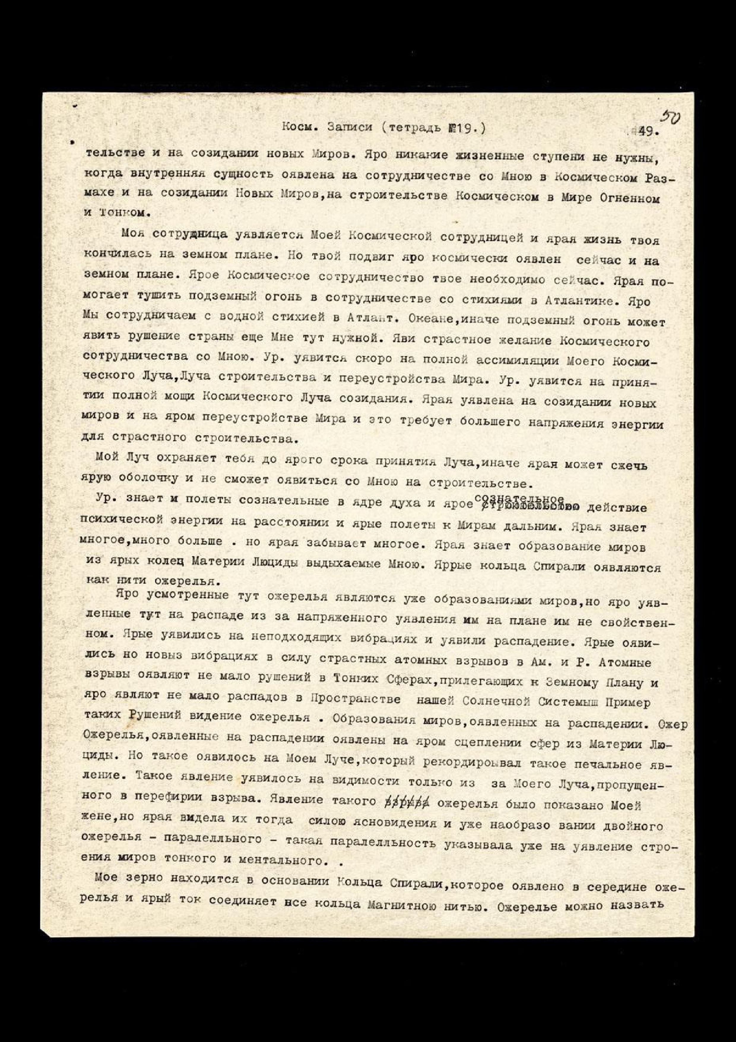 Моя сотрудница уявляется Моей Космической сотрудницей, и ярая жизнь твоя кончилась на земном плане. Но твой подвиг яро космически оявлен сейчас и на земном плане. Ярое Космическое сотрудничество твоё необходимо сейчас. Ярая помогает тушить подземный огонь в сотрудничестве со стихиями в Атлантике. Яро Мы сотрудничаем с водной стихией в Атлантическом Океане, иначе подземный огонь может явить рушение страны ещё Мне тут нужной. Яви страстное желание Космического сотрудничества со Мною. Урусвати уявится скоро на полной ассимиляции Моего Космического Луча, Луча строительства и переустройства Мира. Урусвати уявится на принятии полной мощи Космического Луча созидания. Ярая уявлена на созидании новых миров и на яром переустройстве Мира, и это требует большего напряжения энергии для страстного строительства.