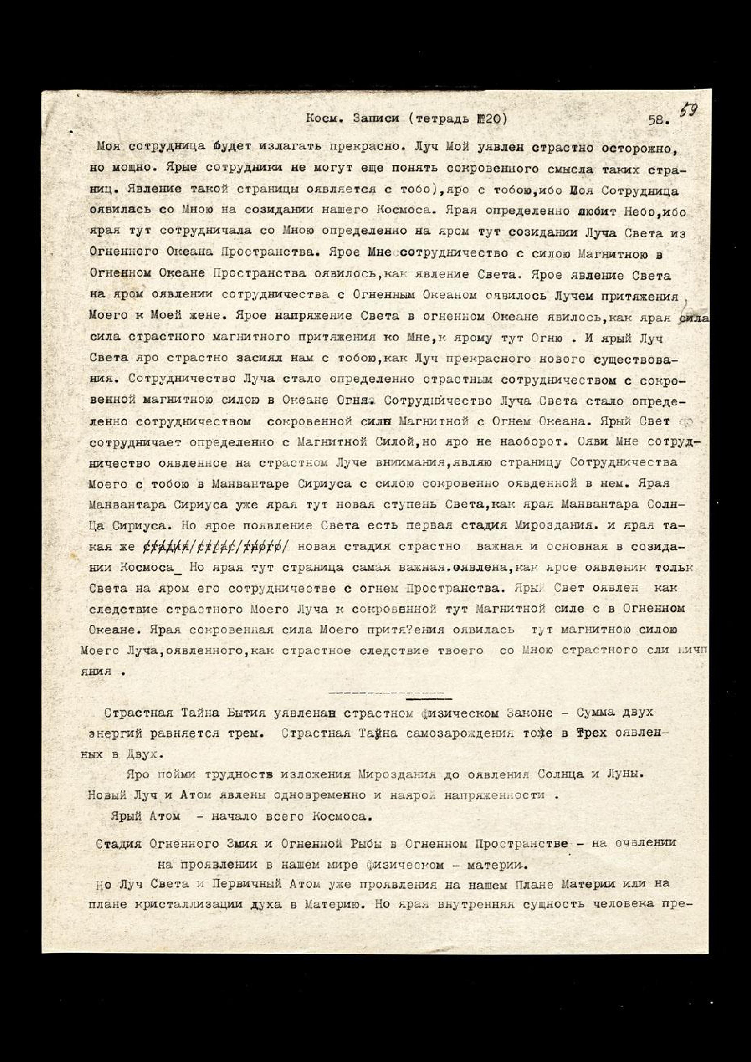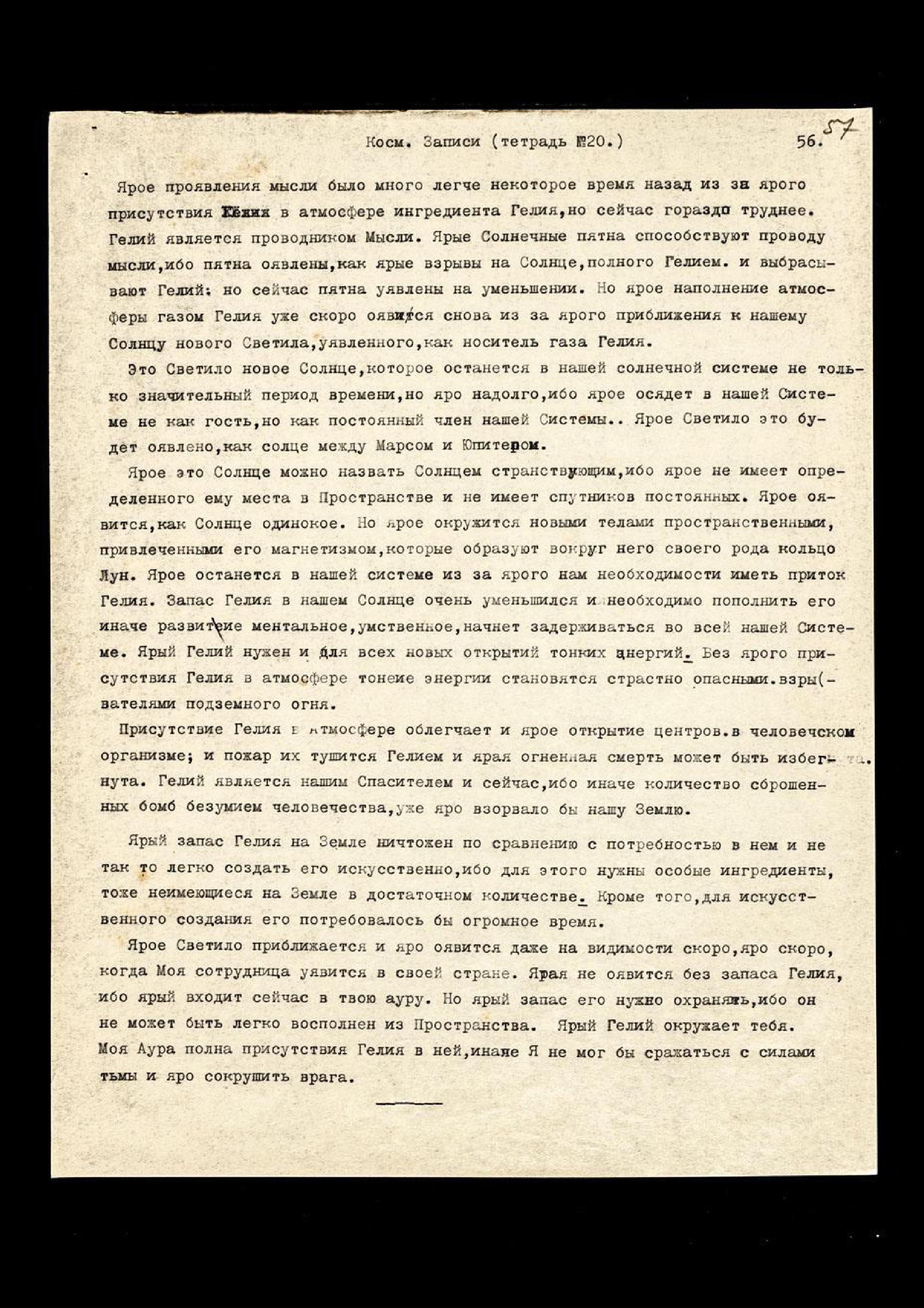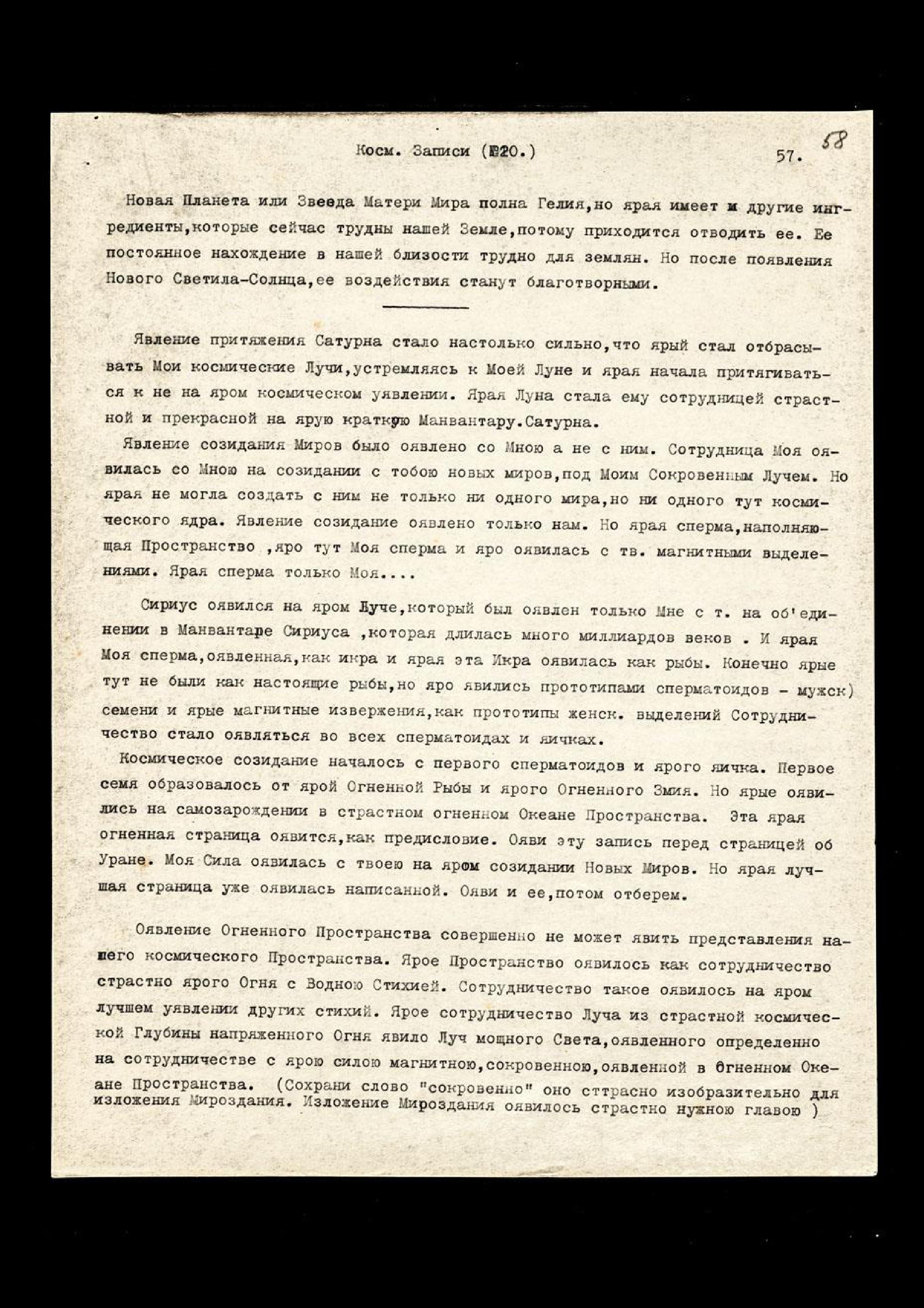 Ярые тут обстоятельства слагаются совершенно по-новому из-за ярого тут уявления новых Светил − Нового Солнца, нашего с тобою Основного Солнца. Ярое уявило страстно новую мощь Моему Космическому Лучу, и ярое слагает многое гораздо лучше, нежели Я ожидал. Ярое событие уже явилось в Р[оссии]. Явление там Космических Лучей совершенно прекращает всякую войну, но яро ставит Р[оссию] во главе Мира.