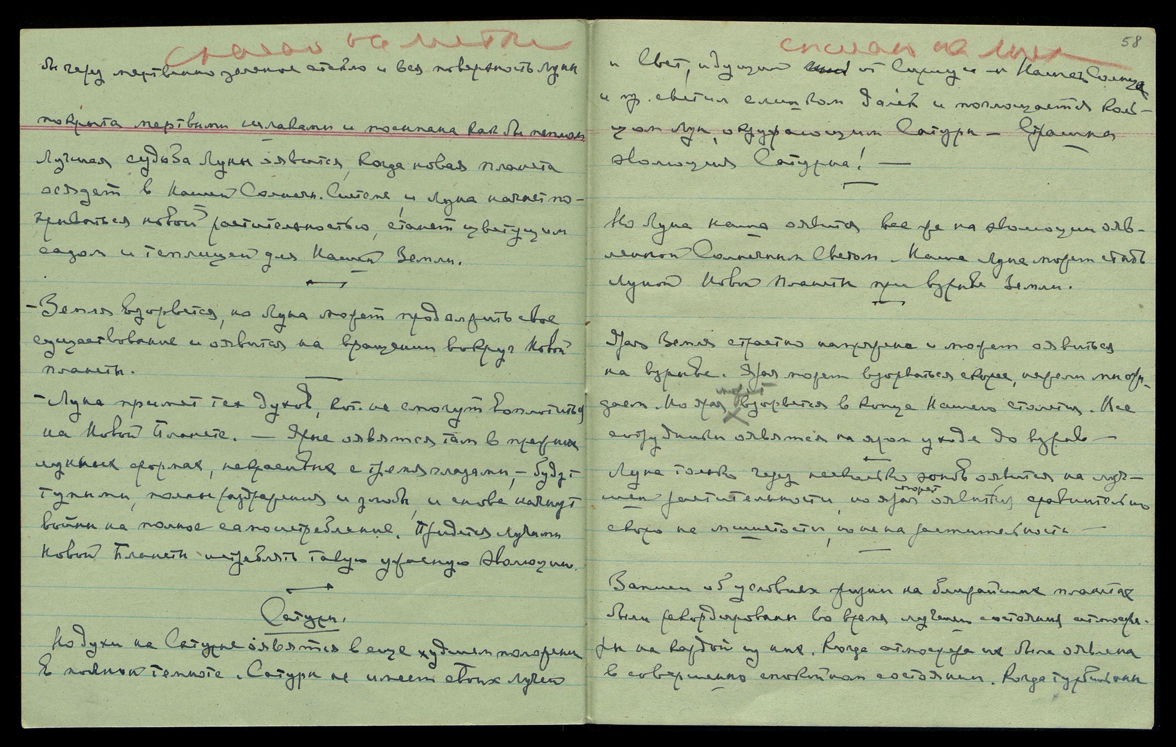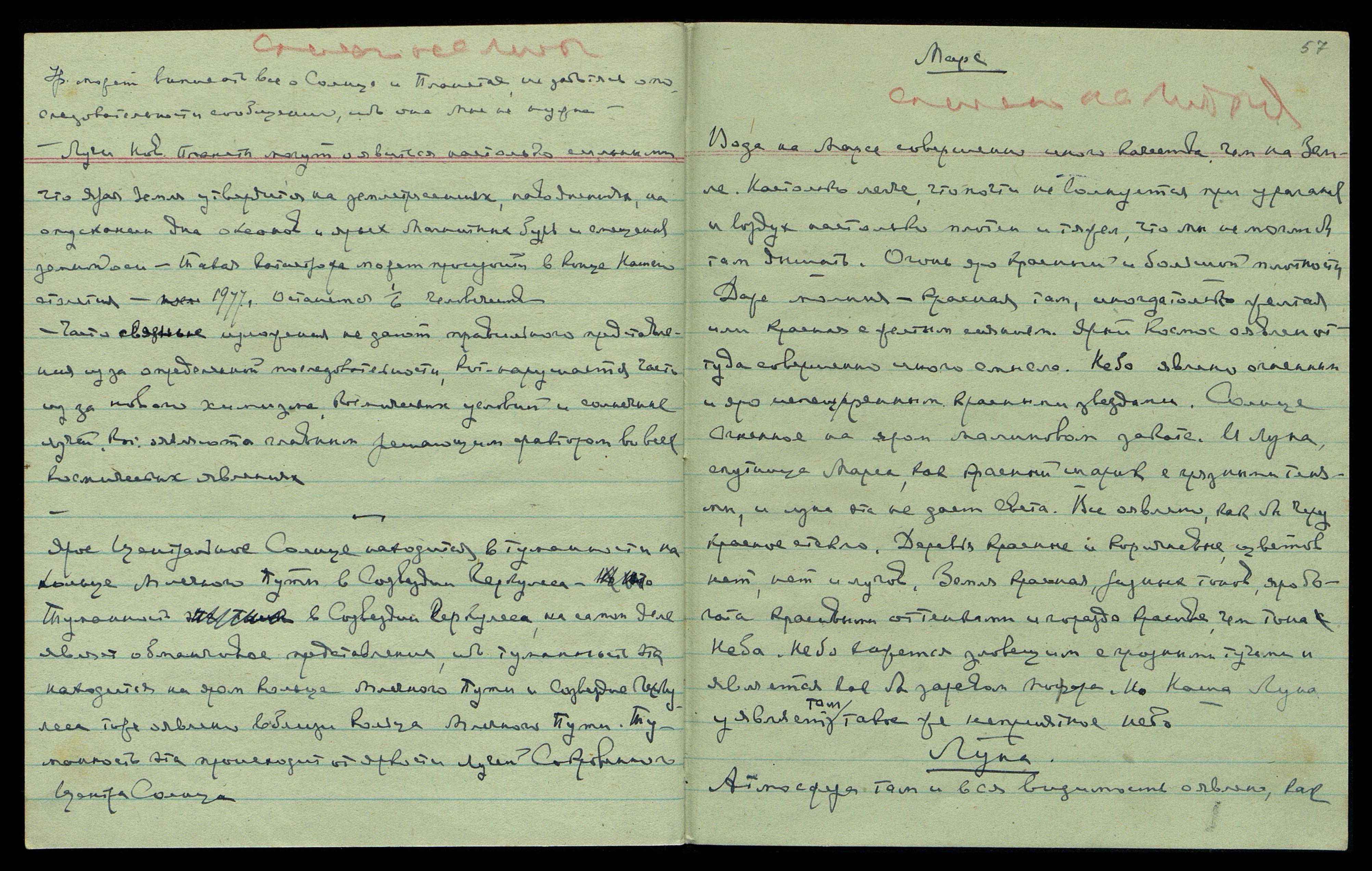 бы через мертвенно зеленое стекло и вся поверхность Луны покрыта мертвыми шлаками и посыпана как бы пеплом. Лучшая судьба Луны оявится, когда новая планета осядет в Нашей Солнечн[ой] Системе, и Луна начнет покрываться новой растительностью, станет цветущим садом и теплицей для Нашей Земли.