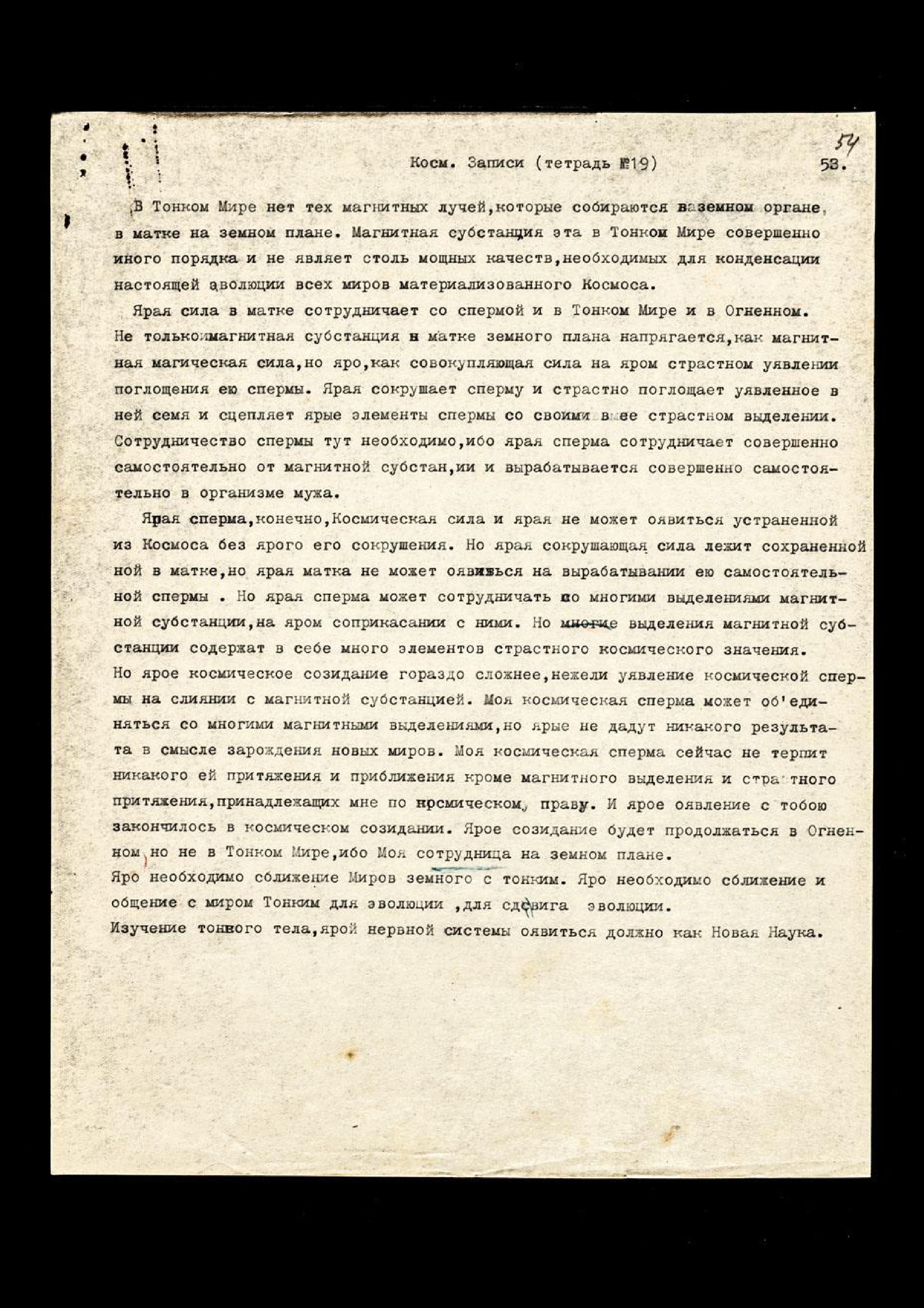 Ярая сперма, конечно, Космическая сила, и ярая не может оявиться устранённой из Космоса без ярого его сокрушения. Но ярая сокрушающая сила лежит сохраненной в матке, но ярая матка не может оявиться на вырабатывании ею самостоятельной спермы. Но ярая сперма может сотрудничать со многими выделениями магнитной субстанции, на яром соприкасании с ними. Но выделения магнитной субстанции содержат в себе много элементов страстного космического значения. Но ярое космическое созидание гораздо сложнее, нежели уявление космической спермы на слиянии с магнитной субстанцией. Моя космическая сперма может объединяться со многими магнитными выделениями, но ярые не дадут никакого результата в смысле зарождения новых миров. Моя космическая сперма сейчас не терпит никакого ей притяжения и приближения, кроме магнитного выделения и страстного притяжения, принадлежащих мне по космическому праву. И ярое оявление с тобою закончилось в космическом созидании. Ярое созидание будет продолжаться в Огненном, но не в Тонком Мире, ибо Моя сотрудница на земном плане. Яро необходимо сближение Миров земного с Тонким. Яро необходимо сближение и общение с миром Тонким для эволюции, для сдвига эволюции. Изучение тонкого тела, ярой нервной системы оявиться должно как Новая Наука.