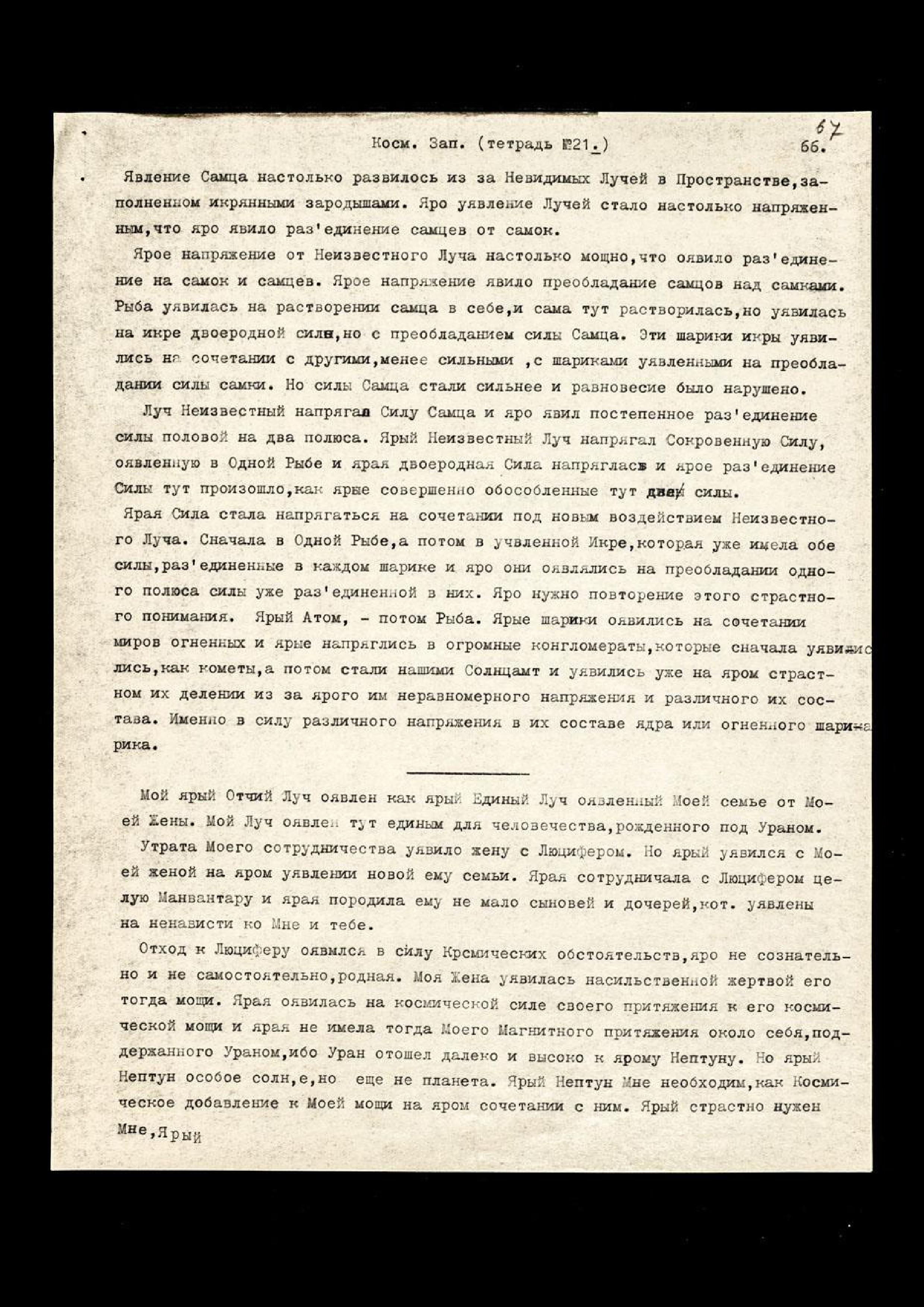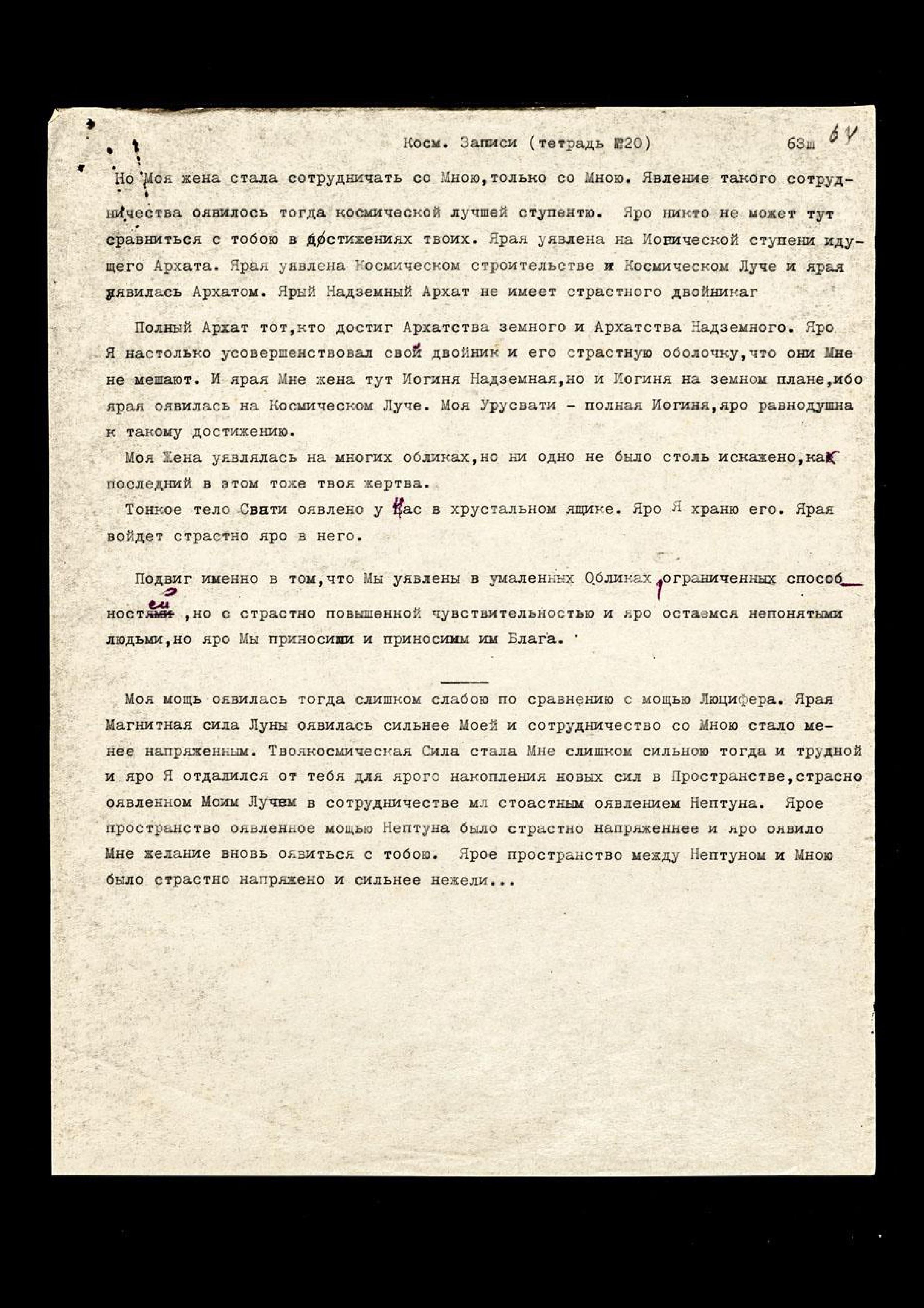Урусвати уявилась на задержке из-за преследования тебя и Меня Люцифером, который мстил Мне за Мою Любовь к тебе. Ярый страстно притягивался ко Мне и к тебе, будучи одной Природы с Нами. Ярый притягивался к тебе сильнее из-за Моего сотрудничества с тобою. Ярый Люцифер погиб, сотрудник Тьмы и рушитель Наших построений, грозный Враг Наш погиб, и яро Мы можем явиться на сотрудничестве прекрасном. Но яро мы должны оявиться с тобою на сотрудничестве самом тесном, самом страстном, любовном, иначе масса поглотит Нас. Нет никого, кто бы мог сдержать эту массу. Братья сотрудничают со Мною и с тобою, но без Меня и тебя не имеют оплота.