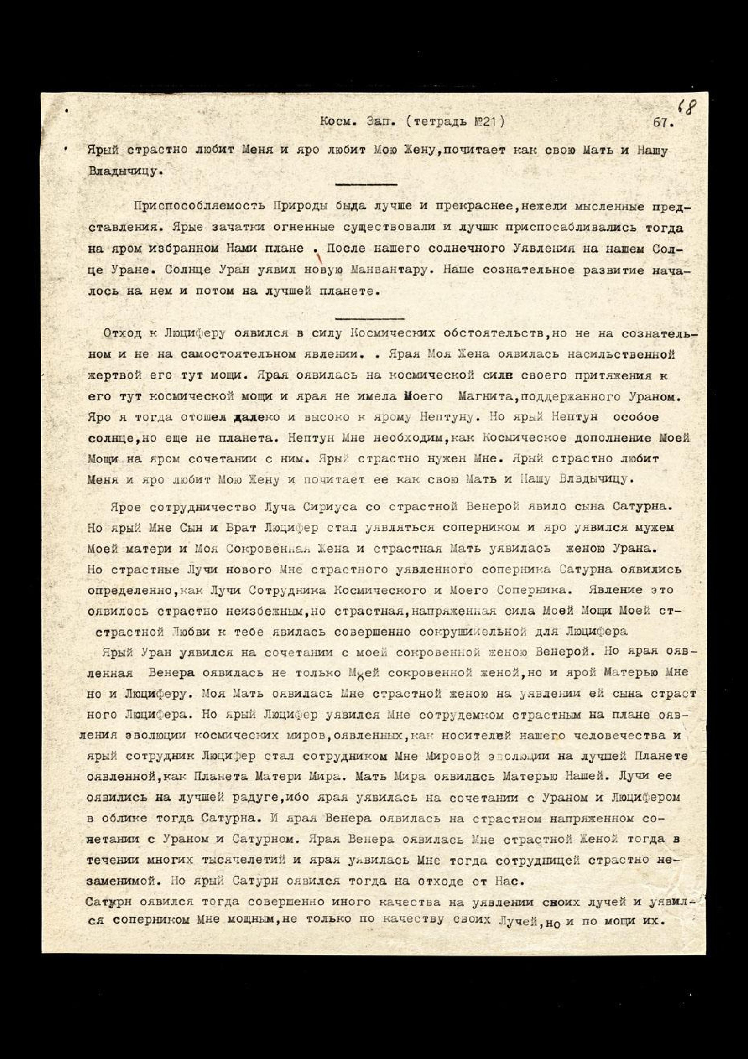 Отход к Люциферу оявился в силу Космических обстоятельств, яро не сознательно и не самостоятельно, родная. Моя Жена уявилась насильственной жертвой его тогда мощи. Ярая оявилась на космической силе своего притяжения к его космической мощи, и ярая не имела тогда Моего Магнитного притяжения около себя, поддержанного Ураном, ибо Уран отошел далеко и высоко к ярому Нептуну. Но ярый Нептун — особое солнце, но ещё не планета. Ярый Нептун Мне необходим как Космическое добавление к Моей мощи на яром сочетании с ним. Ярый страстно нужен Мне.