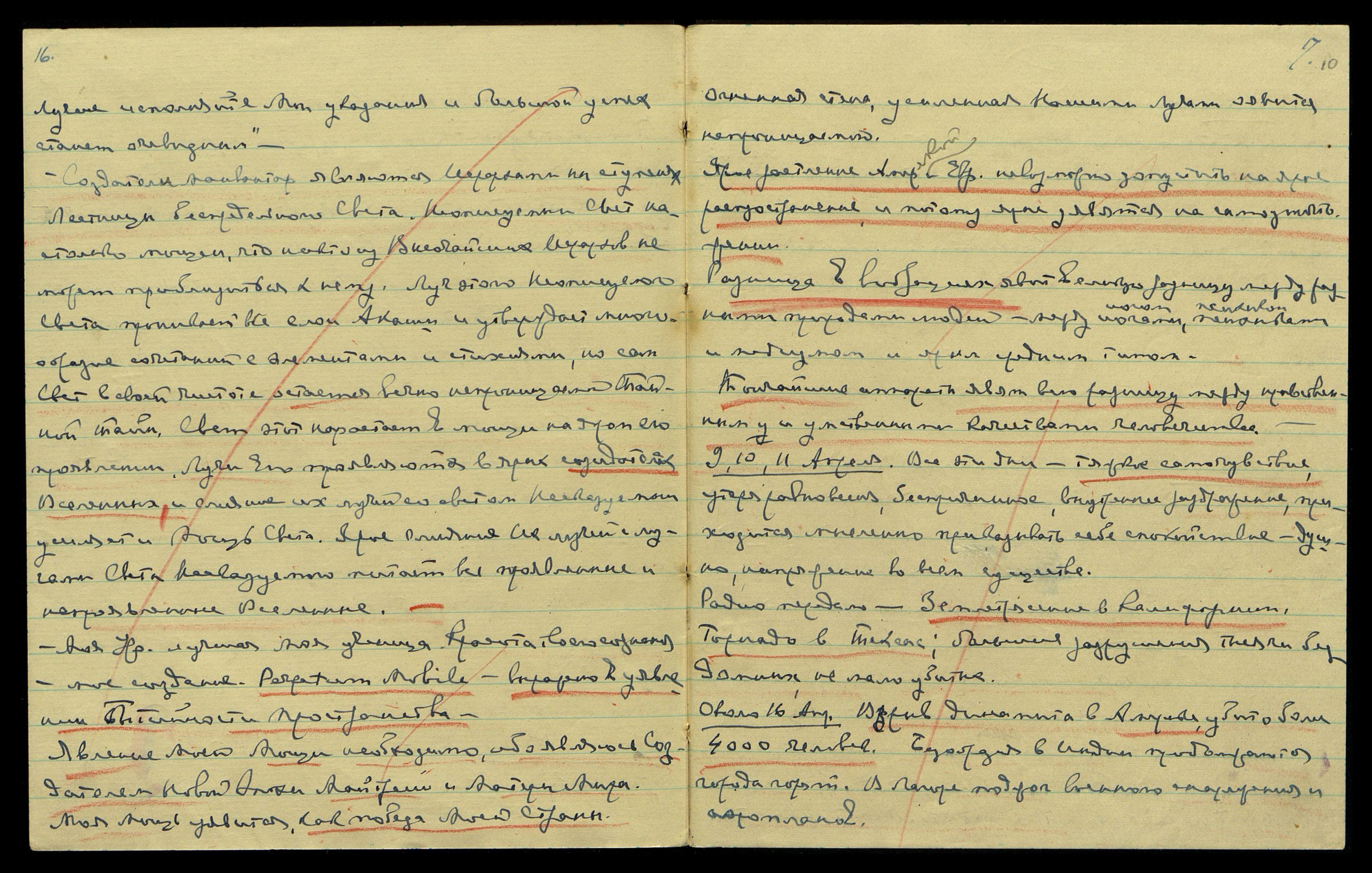 Утром 29 мая. Прочла о новом достижении науки в Амер[иканском] журнале; новый аппарат-радио заключается в одной маленькой трубочке и небольшой пластинке, и подумалось, как, имея при себе такой аппарат, можно будет легко слышать сообщения со всего мира и невольно встало в уме сравнение с трудностями яснослышания. — Ответ Вл[адыки]: "Урусвати уявила Мне огорчение именно страстным уменьшением интереса к своему опыту, но сейчас такое здесь напряженное время и, тем не менее, опыт продолжается. Напряженная мысленная передача уявилась, как новое достижение и Урусвати утвердилась на ней, и луч яснослышания уменьшил напряжение. Урусвати уявила ненасытность ярую в улавливании Моих Мыслей и яро утратила интерес ко всему другому. Урусвати снова утвердится на яснослышании. Нервное потрясение на (оп. Ам.) сказалось и на сердце, ибо сердце уявило такой костер!!