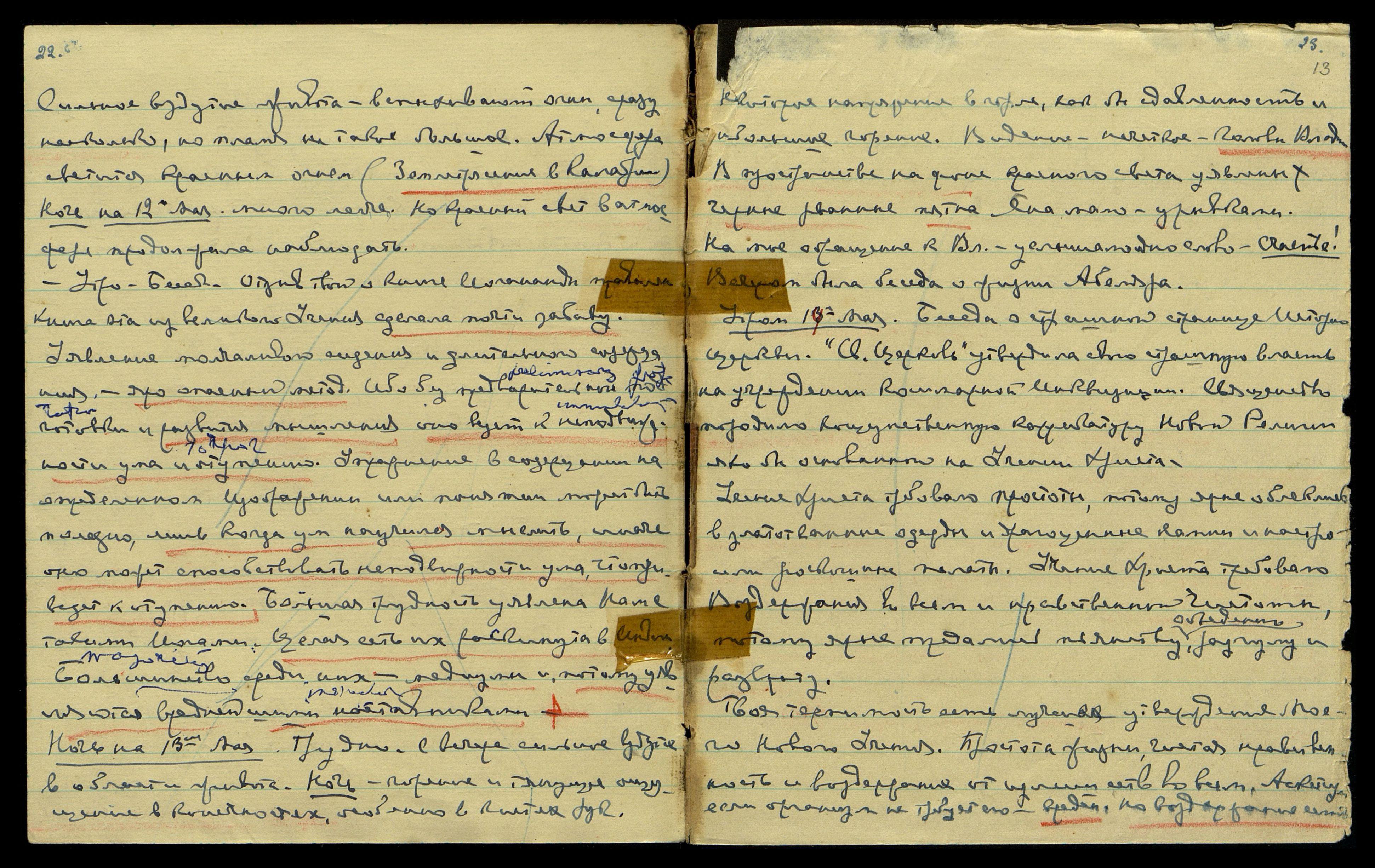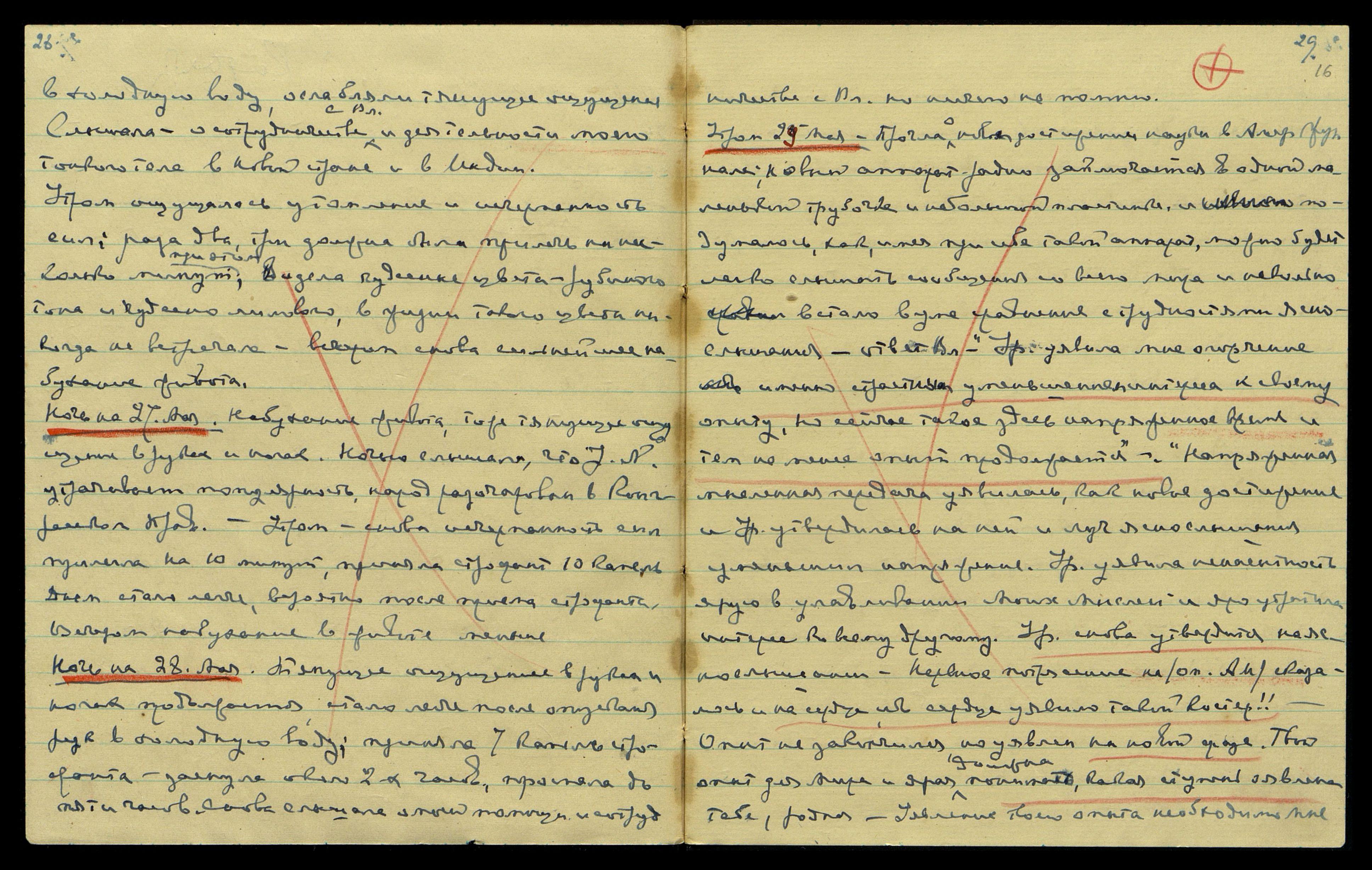 30 апреля с утра напряжение и боль в голове — боль захватывает всю голову. Напряжение сильнее в лобной области. После 12 ч. дня боль и напряжение утихли. Самочувствие много лучше. День теплый, в комнате 68 [градусов] ф[аренгейта]. Перед обедом чувство какой-то победы, удачи, где и в чем − не знаю.