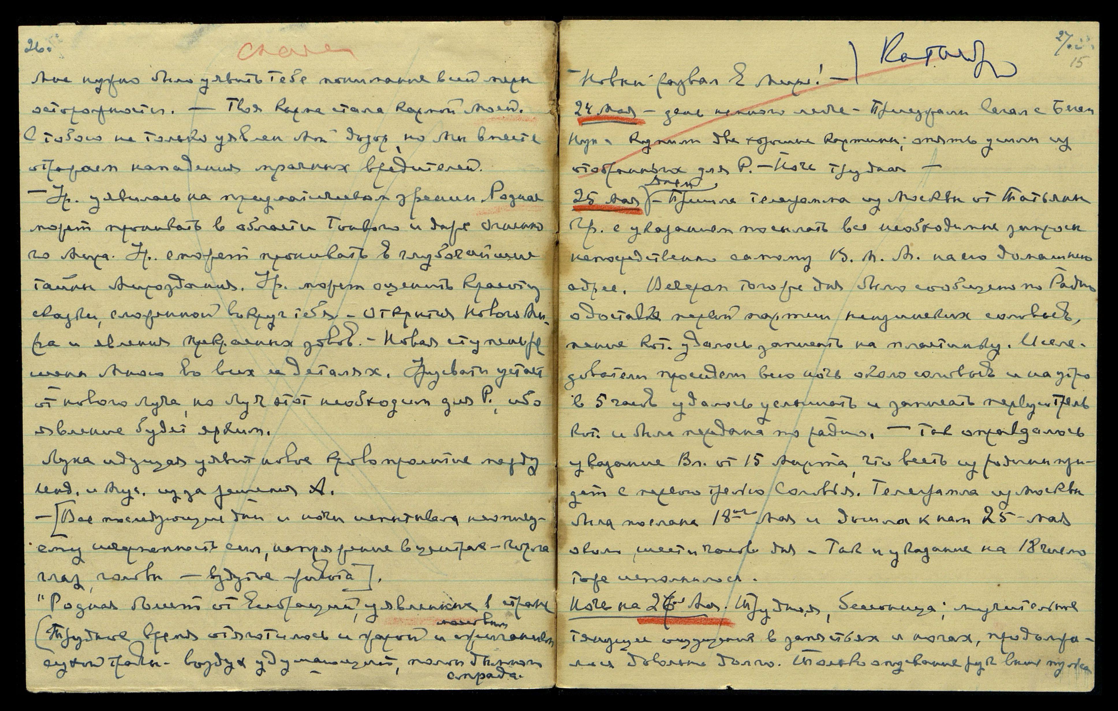 (Все последующие дни и ночи испытывала неописуему[ю] исчерпанность сил, напряжение в центрах — горла, глаз, головы — вздутие живота).