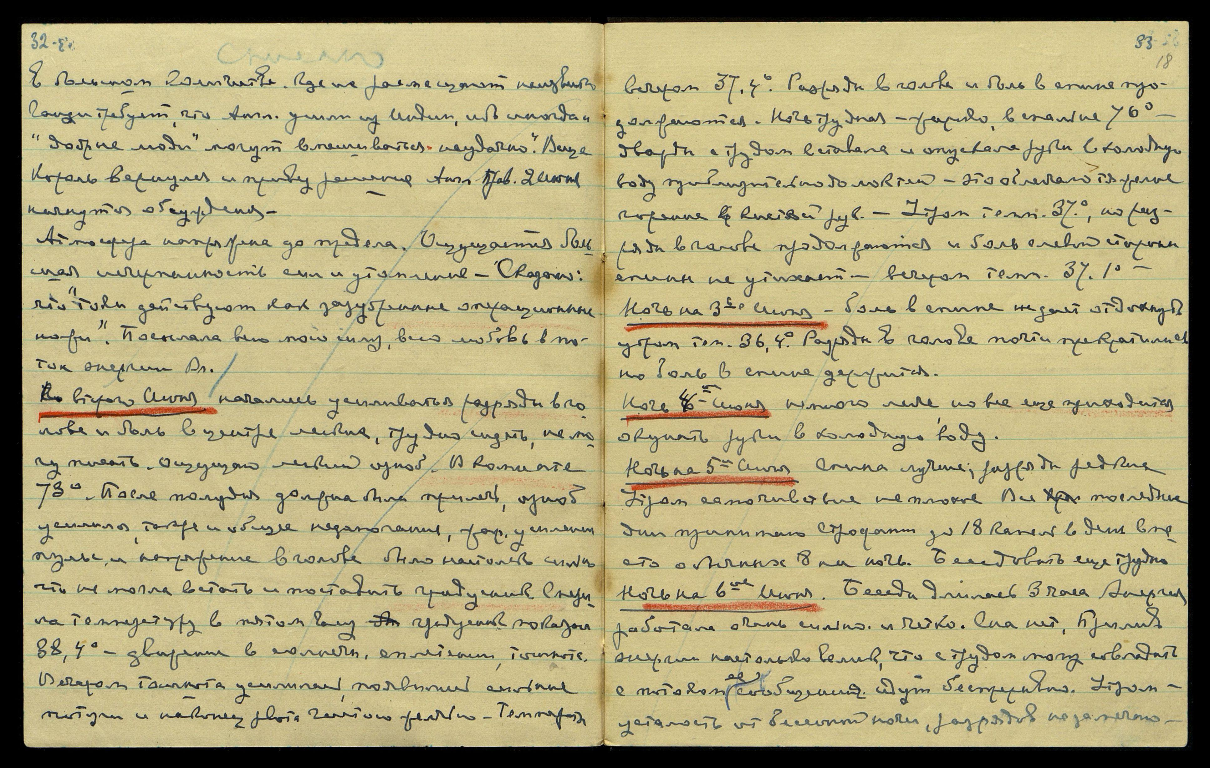 Второго июня начались усиливаться разряды в голове и боль в центре легких, трудно сидеть, не могу писать. Ощущаю легкий озноб. В комнате 73° [градуса по Фаренгейту]*. После полудня должна была прилечь, озноб усилился, также и общее недомогание, жар, усиление пульса и напряжение в голове было настолько сильно, что не могла встать и поставить градусник. Смерила температуру в пятом часу, градусник показал 38,4° − движение в солнечн[ом] сплетении, тошнота. Вечером тошнота усилилась, появились сильные потуги и наконец рвота чистой желчью. Температура вечером 37,4°. Разряды в голове и боль в спине продолжаются. Ночь трудная — жарко, в спальне 76°**, дважды с трудом вставала и опускала руки в холодную воду приблизительно до локтей — это облегчало тяжелое горение кистей рук. Утром темп[ература] 37°, но разряды в голове продолжаются и боль с левой стороны спины не утихает — вечером темп[ература] 37,1°.