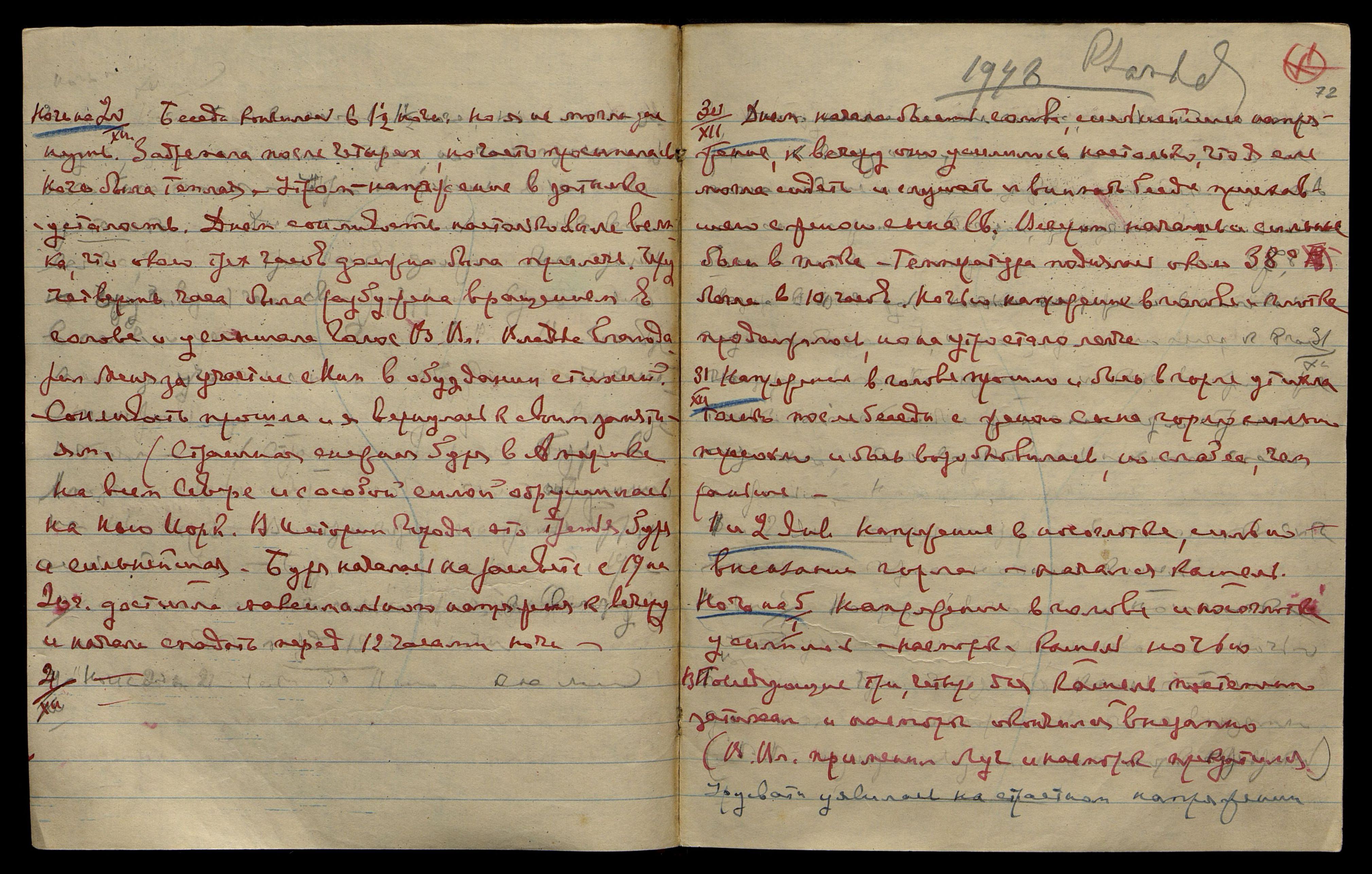 30/XII. Днем начала болеть голова, сильнейшее напряжение, к вечеру оно усилилось настолько, что я еле могла сидеть и слушать, и внимать беседе приехавшего с женою сына Св[ятослава]. Вечером начались и сильные боли в глотке. Температура поднялась около 38°C. Легла в 10 часов. Ночью напряжение в голове и глотке продолжалось, но на утро стало легче.