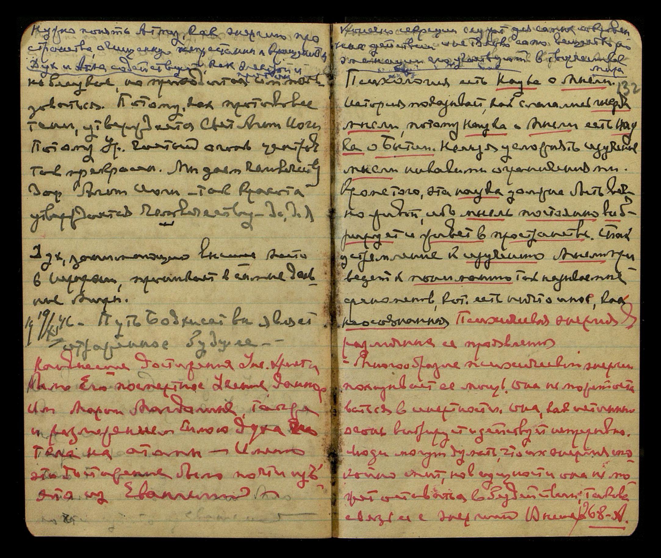 * На верхних полях разворота написано: "Чуткость есть степень Культуры. Правильно думать о питании самых высших центров. Когда люди начнут изучать не только огни и лучи, но и секреции человеческие, тогда можно думать о перемене тела".