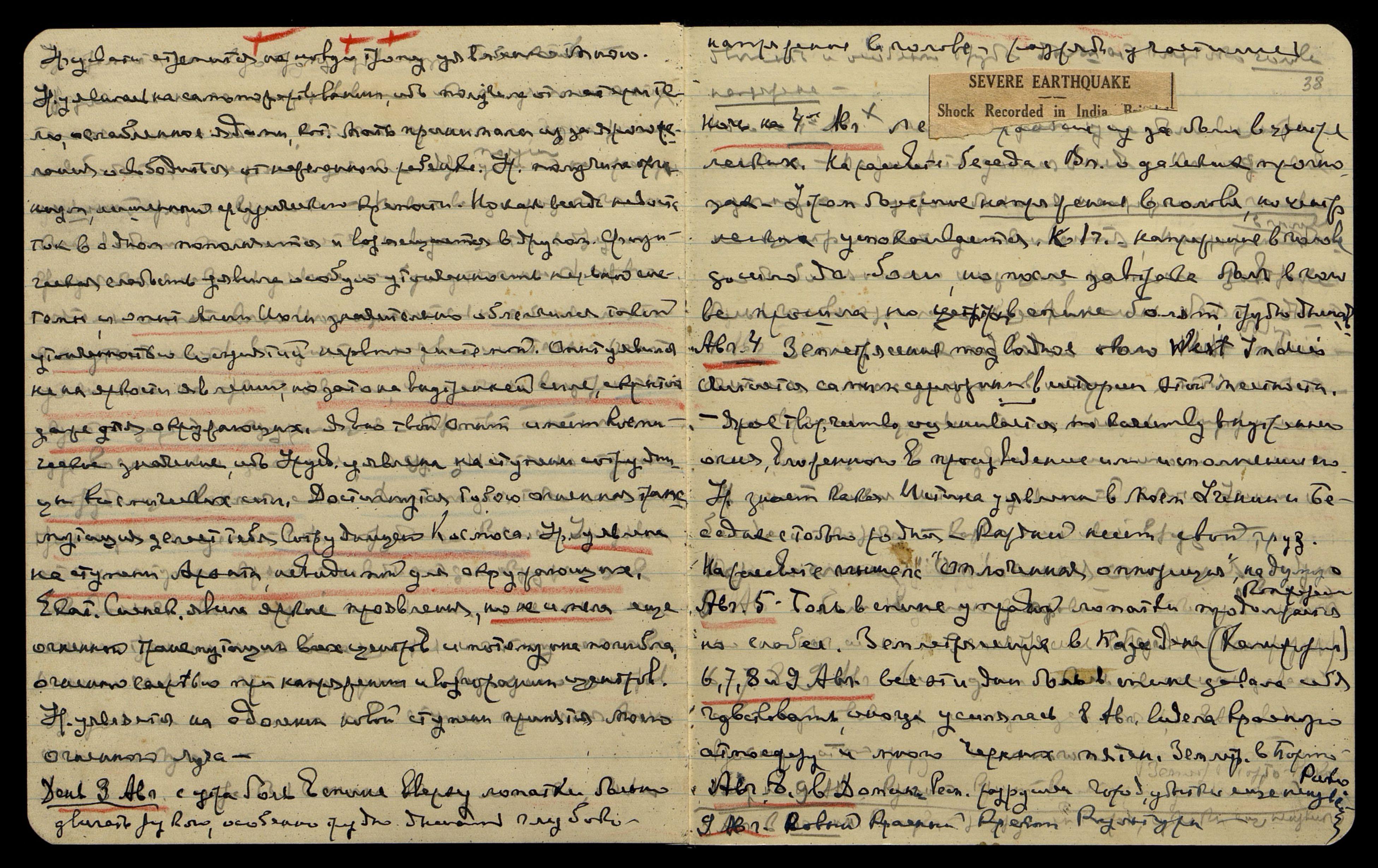 Авг[уст] 5. Боль в спине у правой лопатки продолжается, но слабее. Землетрясение в Пазадене (Калифорния).