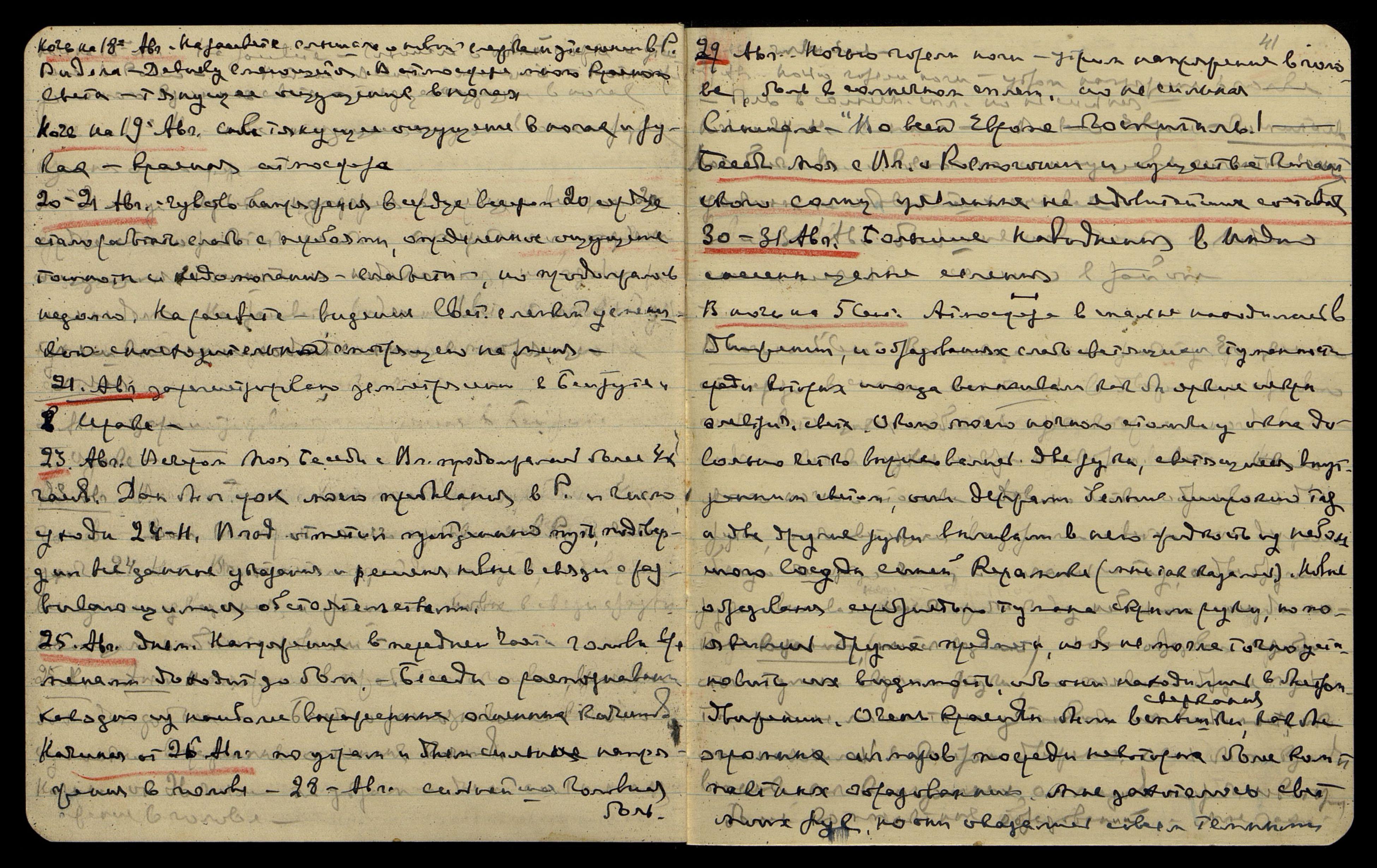 23 авг[уста]. Вечером моя Беседа с Вл[адыкой] продолжалась более 4-х часов. Дан был срок моего пребывания в Р[оссии] и число ухода 24 Н. Влад[ыка] отметил пройденный путь, подтвердил все данные указания и решения новые в связи с развивающимися обстоятельствами.
