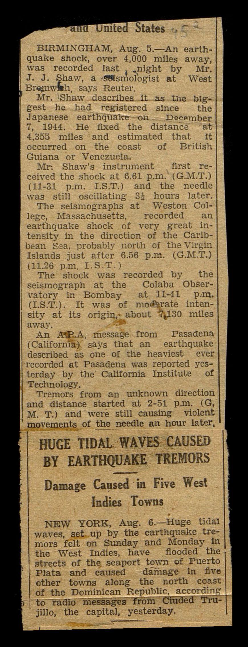 [англ: БИРМИНГЕМ, 5 августа. — Вчера вечером г-н Дж. Дж. Шоу, сейсмолог из Вест-Бремвича, зафиксировал землетрясение на расстоянии более 4000 миль, сообщает Рейтер. Г-н Шоу описывает это как самое сильное из зарегистрированных им землетрясений после землетрясения в Японии 7 декабря 1944 года. Он определил расстояние в 4355 миль и подсчитал, что оно произошло на побережье Британской Гвианы или Венесуэлы. Инструмент г-на Шоу впервые получил удар в 18:61. (G.M.T.) (23:31, I.S.T.), и через 3,5 часа стрелка все еще колебалась. Сейсмографы в Вестон-колледже, штат Массачусетс, зафиксировали землетрясение очень большой силы в направлении Карибского моря, вероятно к северу от Виргинских островов, сразу после 18:56 (G.M.T.) (23:26 pm I.S.T.) Удар был зарегистрирован сейсмографом в обсерватории Колаба в Бомбее в 23:41. (I.S.T.). В самом начале, примерно в 7130 милях от него, он был умеренной интенсивности. В сообщении A.P.A. из Пасадены (Калифорния) говорится, что вчера Калифорнийский технологический институт сообщил об одном из самых сильных землетрясений, когда-либо зарегистрированных в Пасадене. Сотрясения с неизвестного направления и расстояния начались в 2:51 часов. (G.M.T.) и через час все еще вызывали резкие движения иглы.]