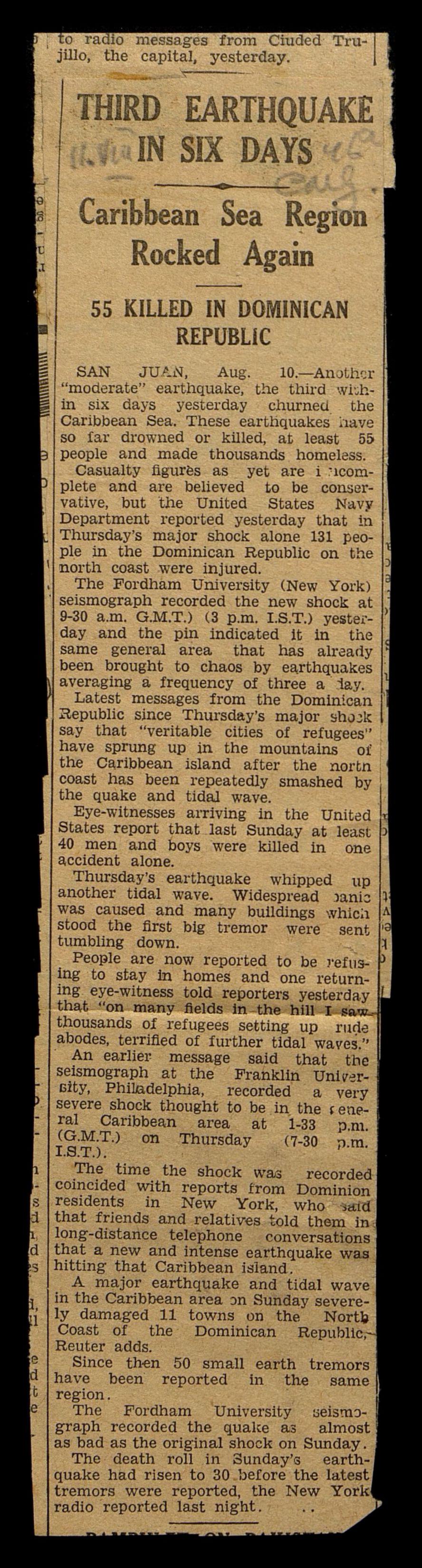 САН-ХУАН, 10 августа. − Еще одно «умеренное» землетрясение, третье за ​​шесть дней, взбудоражило Карибское море. В результате этих землетрясений на сегодняшний день утонуло или погибли по меньшей мере 55 человек и тысячи остались без крова. Картина раненых пока не полная и считаются умеренной, но вчера министерство ВМС США сообщило, что только в результате сильного потрясения в четверг в Доминиканской Республике на северном побережье был ранен 131 человек. Сейсмограф Фордхэмского университета (Нью-Йорк) вчера зафиксировал новый толчок в 9:30 утра по Гринвичу (3 вечера по восточному стандартному времени), и игла сейсмографа указала на него в той же общей области, которая уже подверглась хаосу из-за землетрясений со средней частотой три раза в сутки. Последние сообщения из Доминиканской Республики после крупного шока в четверг говорят о том, что «настоящие города беженцев» выросли в горах Карибского острова после того, как северное побережье неоднократно подвергалось воздействию землетрясений и цунами. Свидетели, прибывшие в Соединенные Штаты, сообщают, что в прошлое воскресенье только в одной аварии погибли по меньшей мере 40 человек. Землетрясение в четверг вызвало новое цунами. Это вызвало повсеместные повреждения, и многие здания, выдержавшие первые сильные толчки, рухнули. Сообщается, что сейчас люди отказываются оставаться в домах, и один из вернувшихся свидетелей сказал вчера репортерам, что «на многих полях на холме я видел тысячи беженцев, устраивающих грубые жилища, напуганные новыми цунами». В более раннем сообщении говорилось, что сейсмограф в Франклин-Сити, Филадельфия, зафиксировал очень сильный толчок, предположительно в районе центрального Карибского бассейна в 13:33 часа в четверг (19:30 вечера I.S.T.). Время, когда было зарегистрировано потрясение, совпало с сообщениями жителей Доминиона в Нью-Йорке, которые сказали, что друзья и родственники сказали им в междугородных телефонных разговорах, что на этом Карибском острове произошло новое сильное землетрясение. Сильное землетрясение и цунами в районе Карибского моря в воскресенье серьезно повредили 11 городов на северном побережье Доминиканской Республики, добавляет Рейтер. С тех пор в том же регионе было зарегистрировано 50 небольших подземных толчков. Аэродинамический график Университета Фордхэма зафиксировал землетрясение почти такое же сильное, как и первоначальный толчок в воскресенье. Число погибших в результате воскресного землетрясения увеличилось до 30 до того, как было сообщено о последних подземных толчках, сообщило вчера вечером Нью-Йоркское радио.]