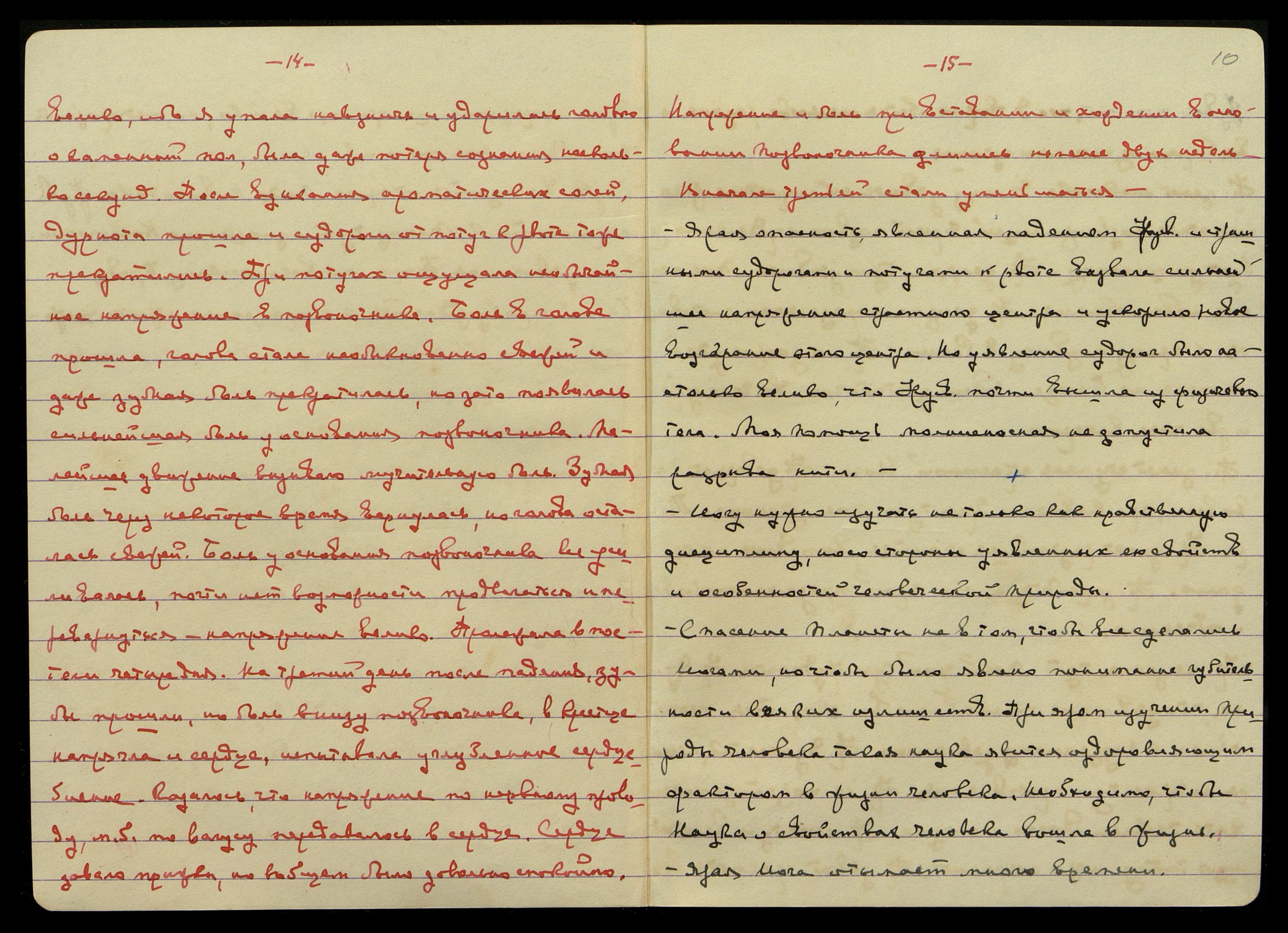 велико, ибо я упала навзничь и ударилась головой о каменный пол, была даже потеря сознания несколько секунд. После вдыхания ароматических солей, дурнота прошла и судороги от потуг к рвоте тоже прекратились. При потугах ощущала необычайное напряжение в позвоночнике. Боль в голове прошла, голова стала необыкновенно свежей и даже зубная боль прекратилась, но зато появилась сильнейшая боль у основания позвоночника. Малейшее движение вызывало мучительную боль. Зубная боль через некоторое время вернулась, но голова осталась свежей. Боль у основания позвоночника все усиливалась, почти нет возможности продвигаться и перевернуться − напряжение велико. Пролежала в постели четыре дня. На третий день после падения, зубы прошли, но боль внизу позвоночника, в крестце напрягла и сердце, испытывала углубленное сердцебиение. Казалось, что напряжение по нервному проводу, может быть по вагусу, передавалось в сердце. Сердце давало прыжки, но в общем было довольно спокойно. Напряжение и боль при вставании и хождении в основании позвоночника длились не менее двух недель. В начале третьей стали уменьшаться.