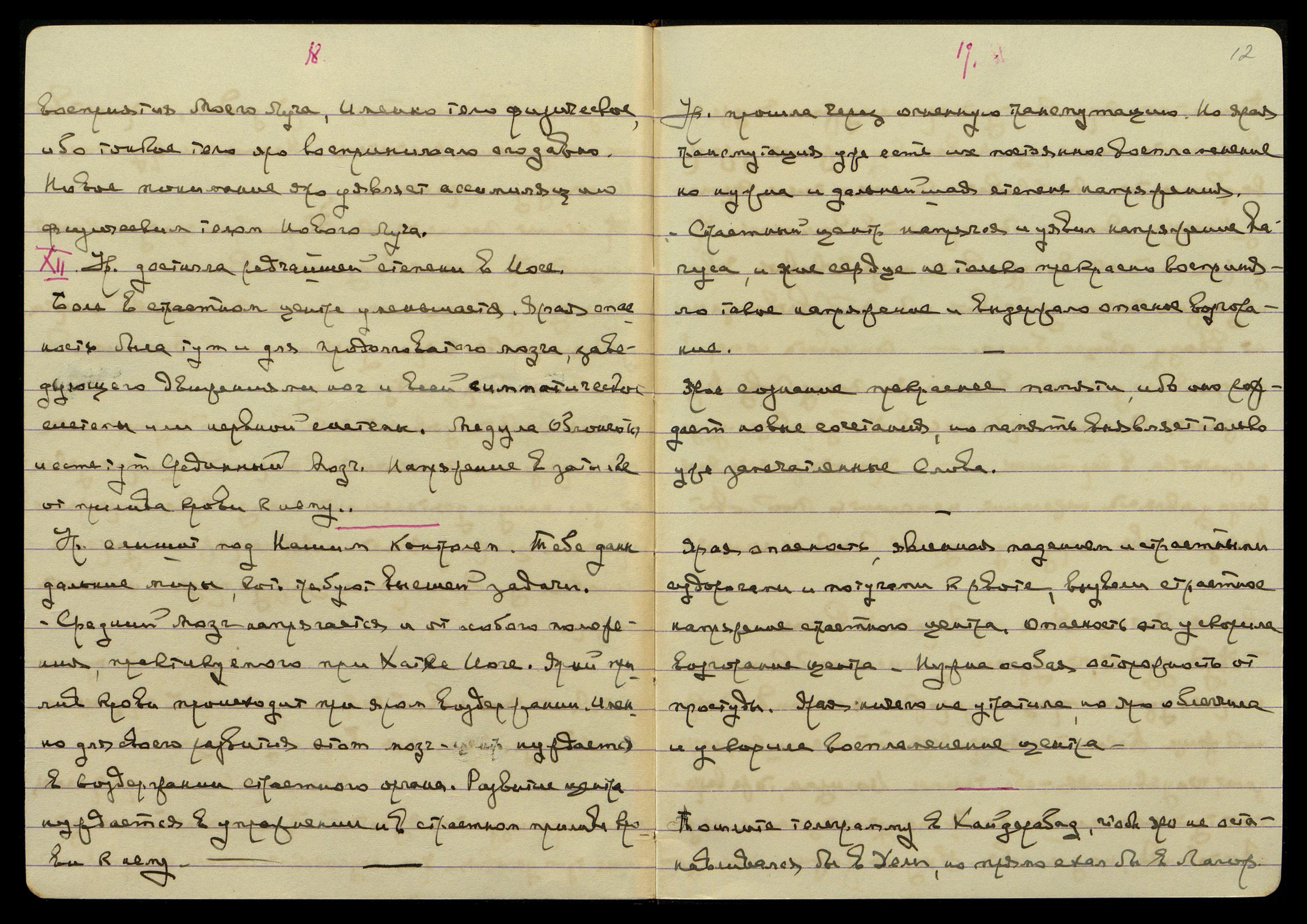 XII. Урусвати достигла редчайшей степени в Йоге. Боль в страстном центре уменьшается. Ярая опасность была тут и для продолговатого мозга, заведующего движениями ног и всей симпатической системы или нервной системы. Медула облонгата* и есть тут срединный мозг. Напряжение в затылке от прилива крови к нему.